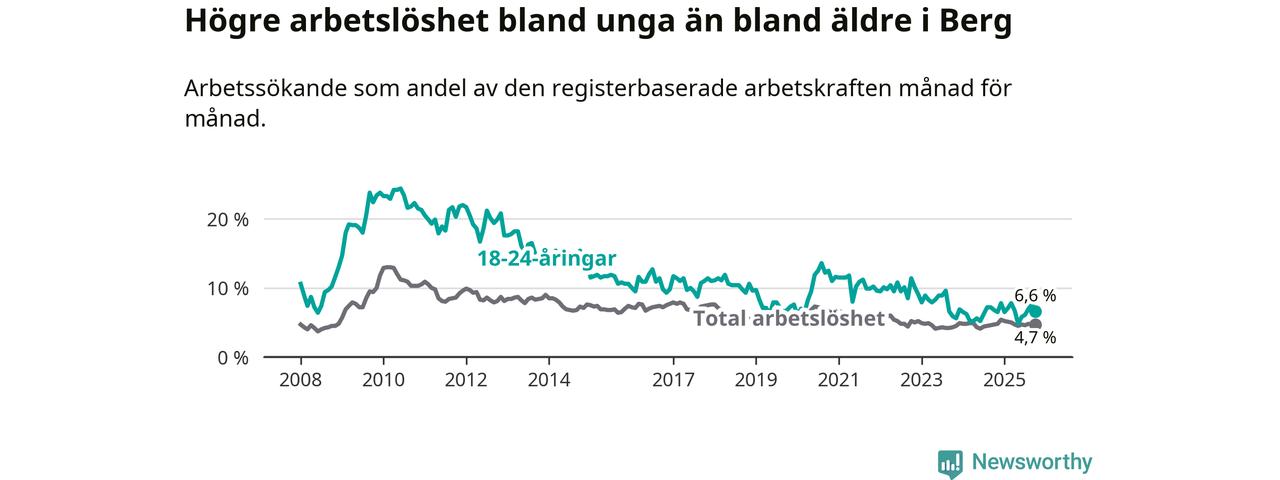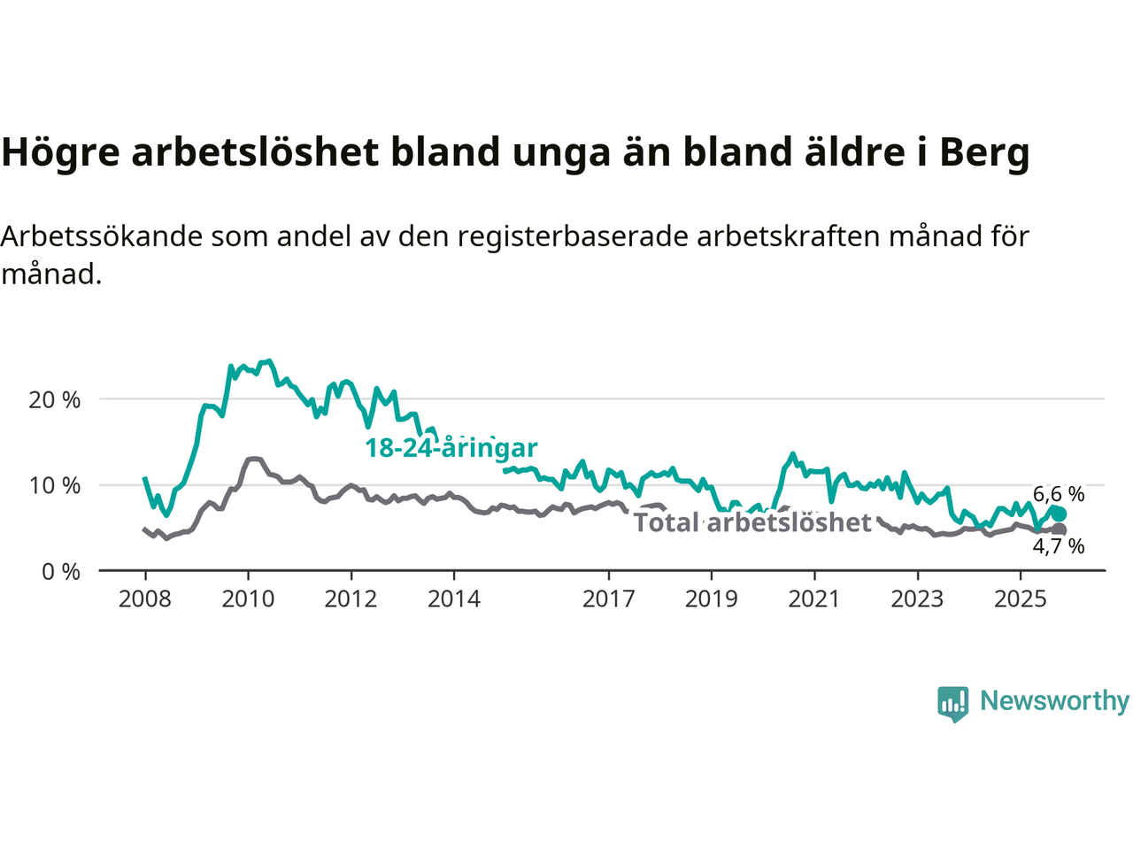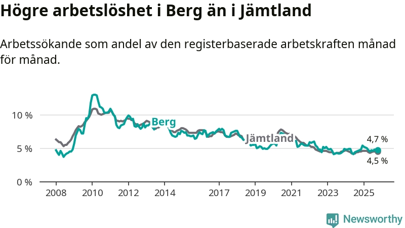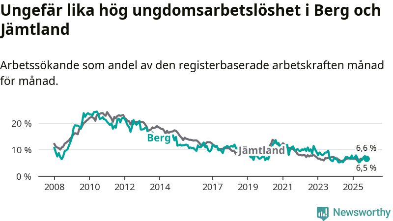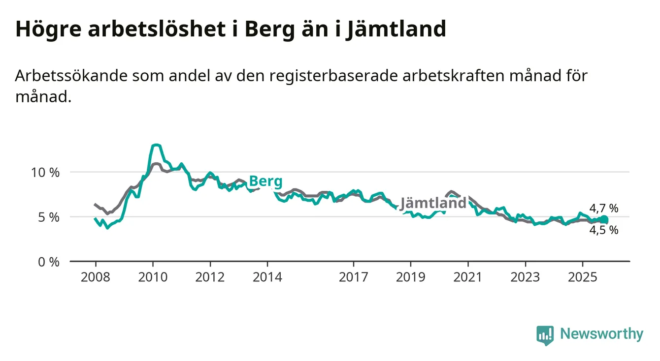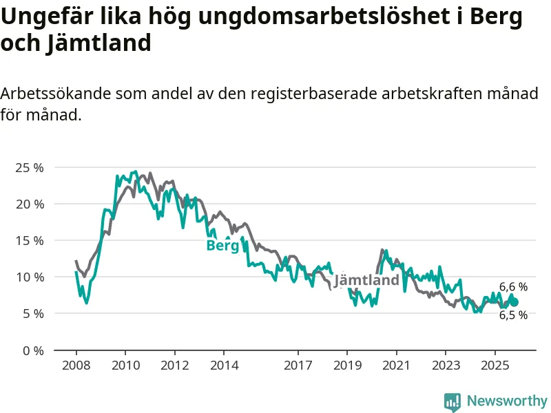 Medan Berg har högre total arbetslöshet än Jämtland, ligger ungdomsarbetslösheten på i stort sett samma nivå.