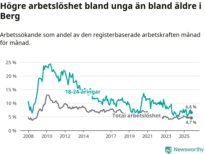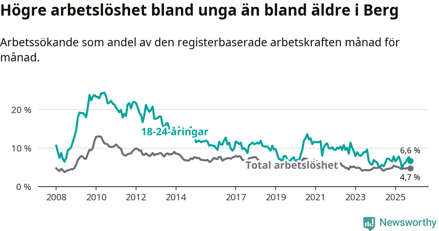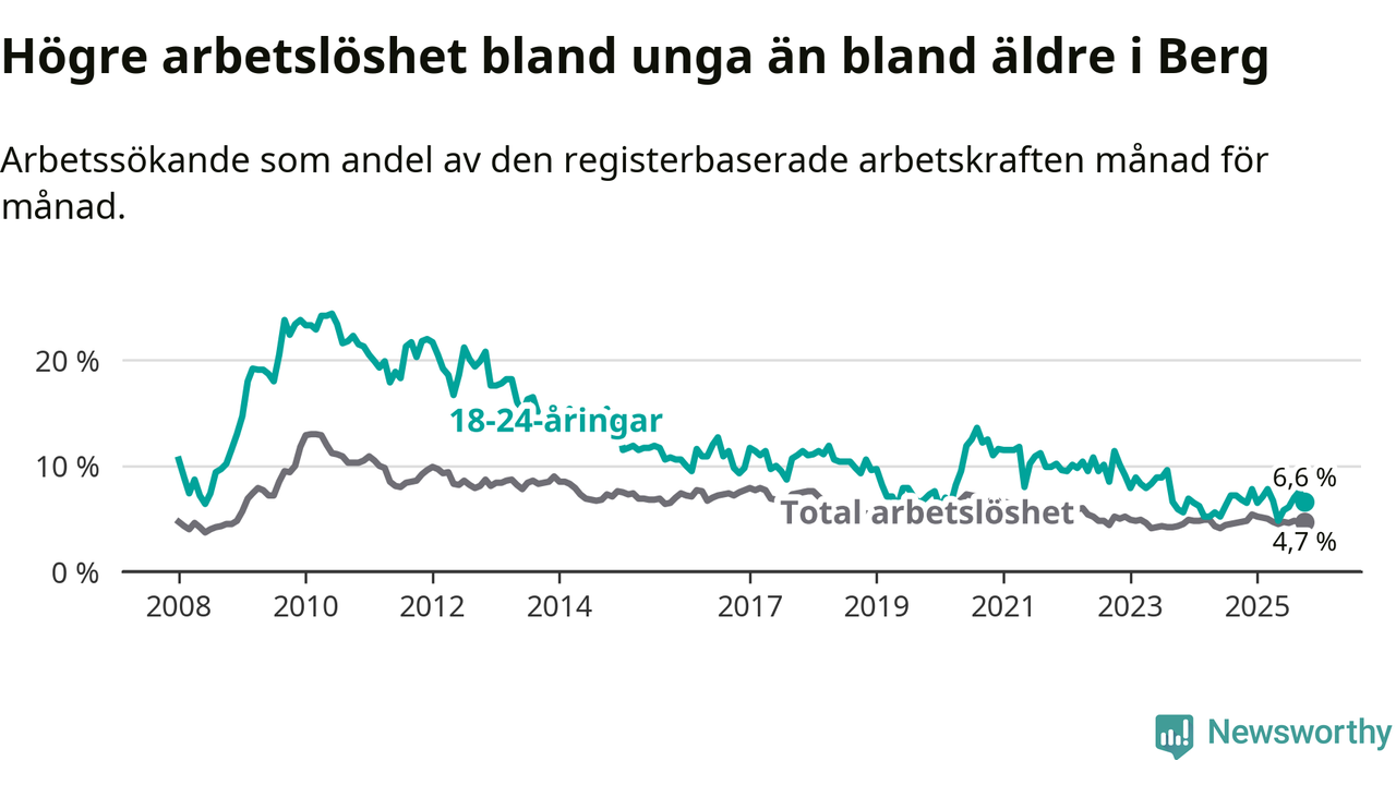 Till skillnad från den totala arbetslösheten sjunker arbetslösheten bland unga (−0,2 procentenheter). I oktober var 6,6 procent av 18–24-åringarna inskrivna som arbetssökande (motsvarande 21 personer). Mäter vi antalet inskrivna har det däremot inte skett någon förändring.