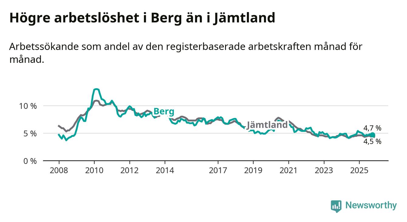 Under oktober månad rapporterade Bergs kommun en total arbetslöshet på 4,7 procent. Det är i samma nivå som i oktober i fjol. Även i Jämtlands län står arbetslösheten stilla