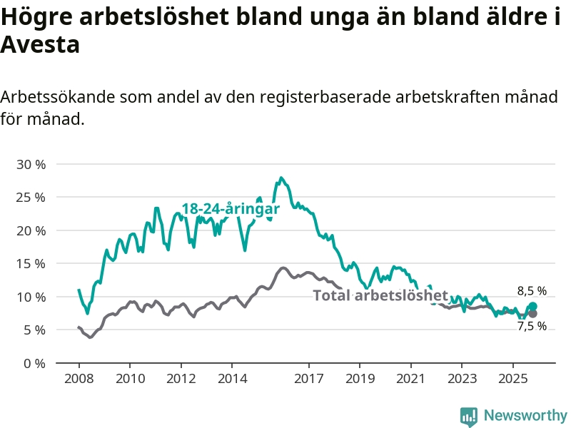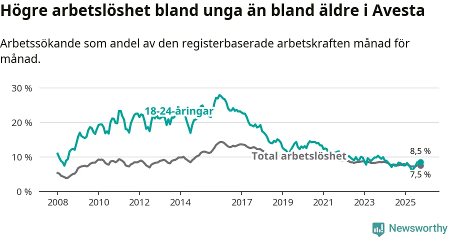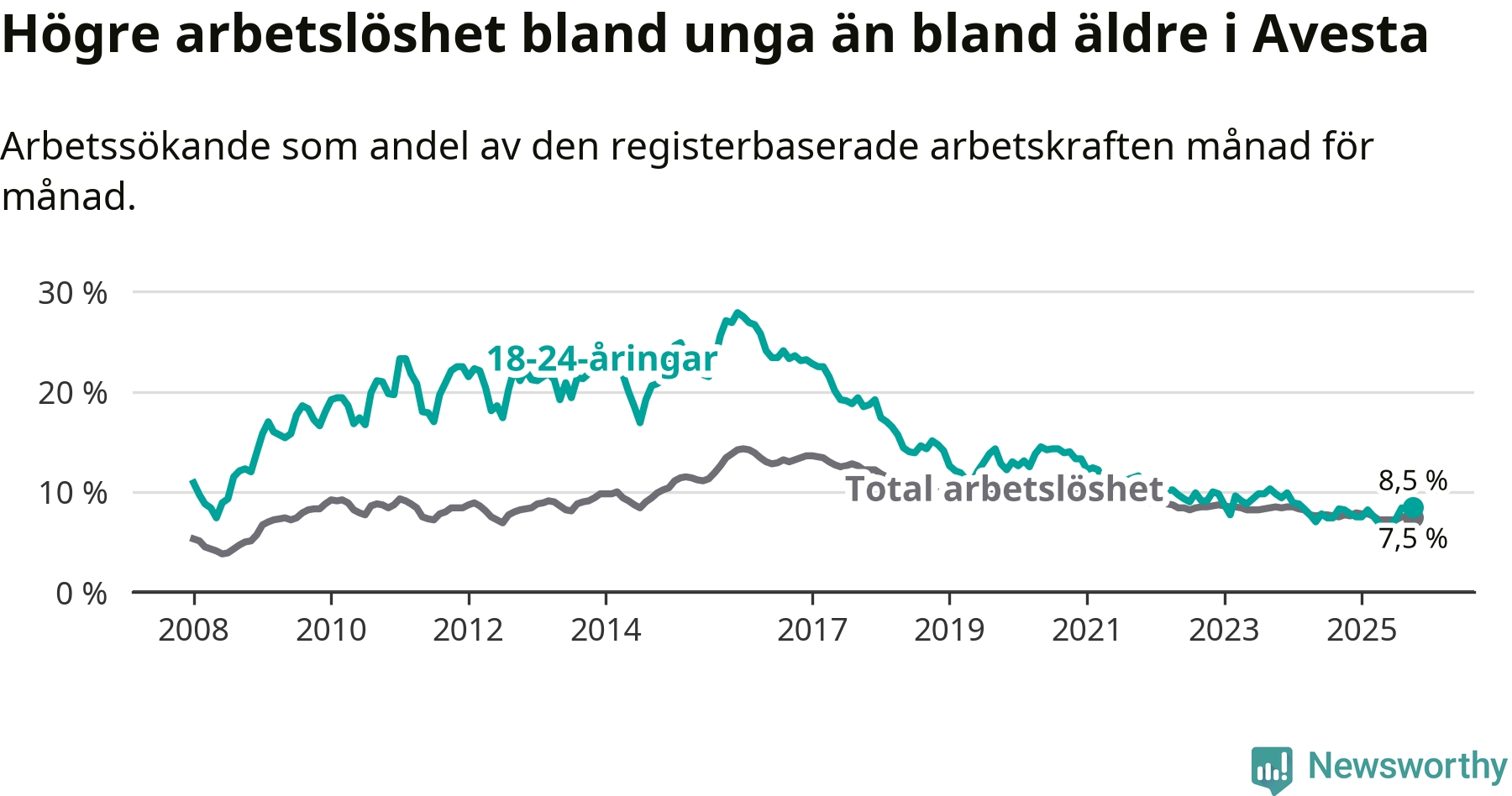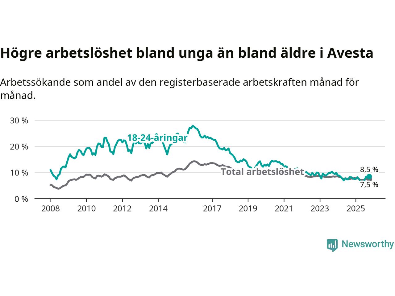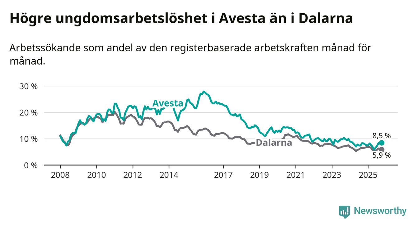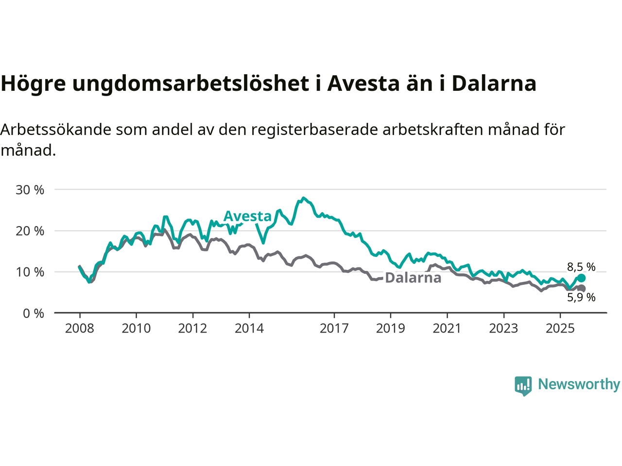 Precis som den totala arbetslösheten ligger ungdomsarbetslösheten i Avesta högre än i Dalarna som helhet. Skillnaden mellan kommunen och länet är 2,6 procentenheter.