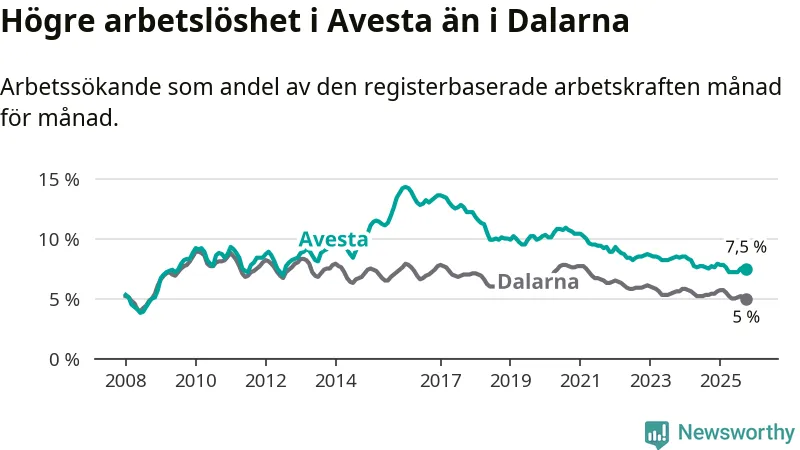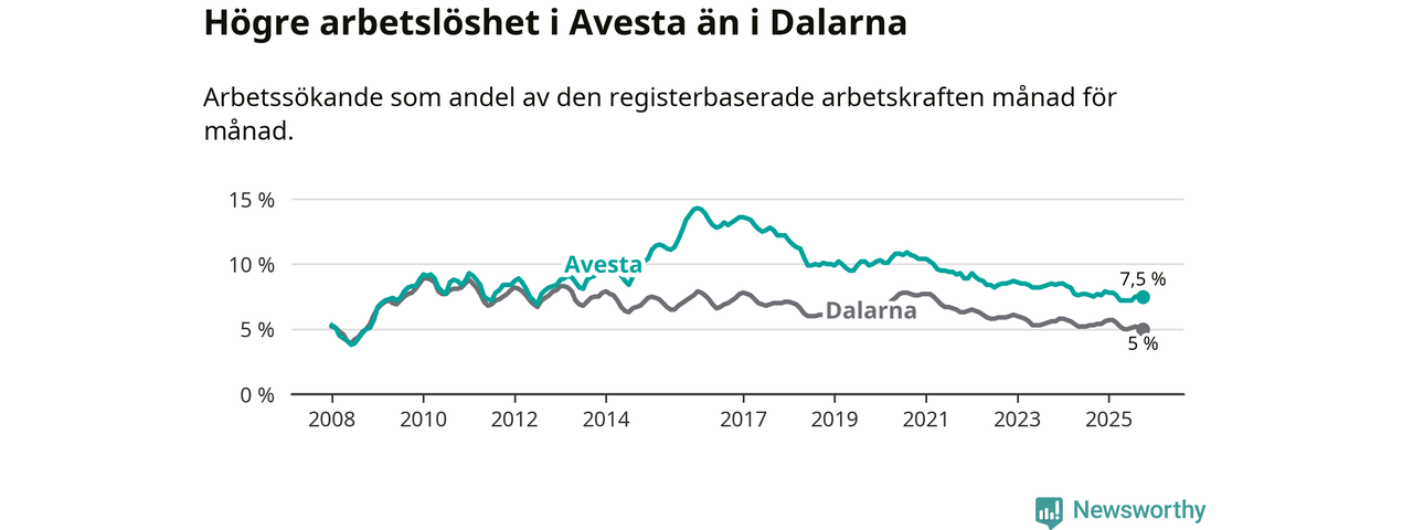 Under oktober månad rapporterade Avesta kommun en total arbetslöshet på 7,5 procent. Det är en minskning jämfört med samma tidpunkt i fjol (−0,2 procentenheter). Även i Dalarnas län sjunker arbetslösheten .