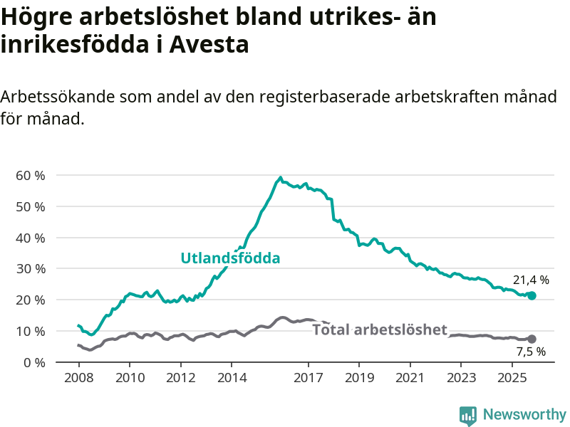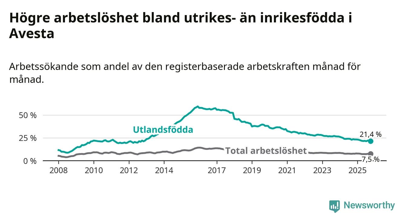Skillnaden i arbetslöshet mellan utrikesfödda och hela befolkningen är 13,9 procentenheter i Avesta. Det är en betydligt mindre skillnad än för ett år sedan (−1,9 procentenheter).