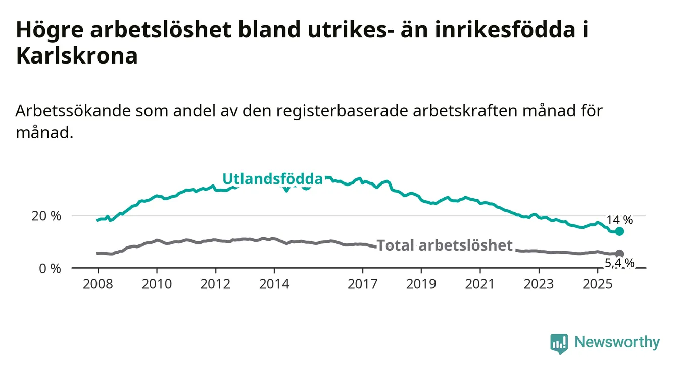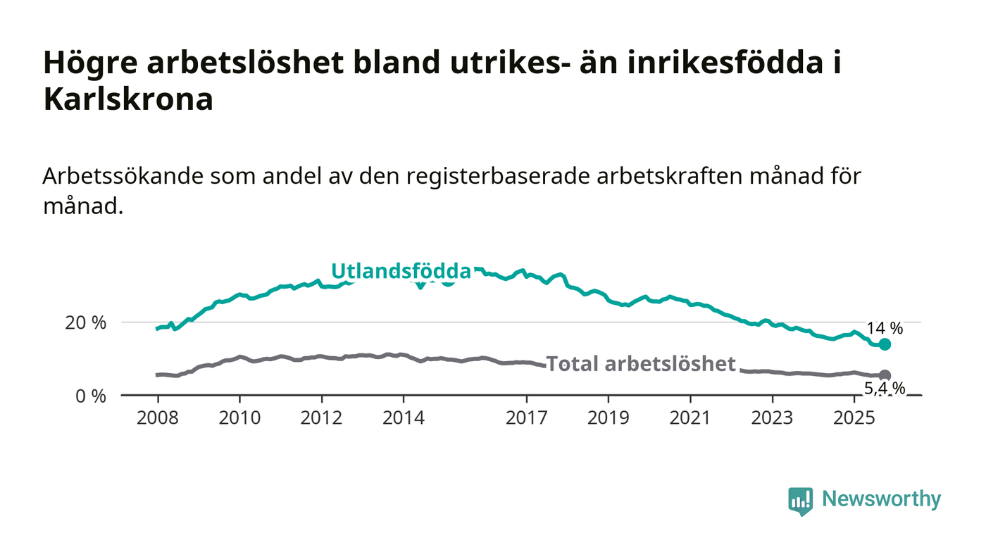 Arbetslösheten bland utlandsfödda var 14,0 procent i Karlskrona under oktober månad, motsvarande 739 av 5 279 personer. Det är 2,4 procentenheter färre än vid samma tidpunkt i fjol (−125 om man räknar personer). Därmed är de utlandsföddas arbetslöshet lägre än vid samma tidpunkt i fjol för sjunde månaden i följd. Sedan mars har arbetslösheten bland utlandsfödda minskat från 16,3 till 14,0 procent.