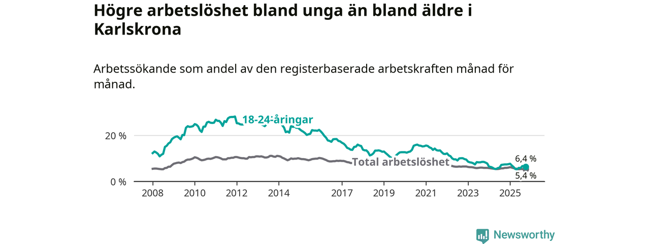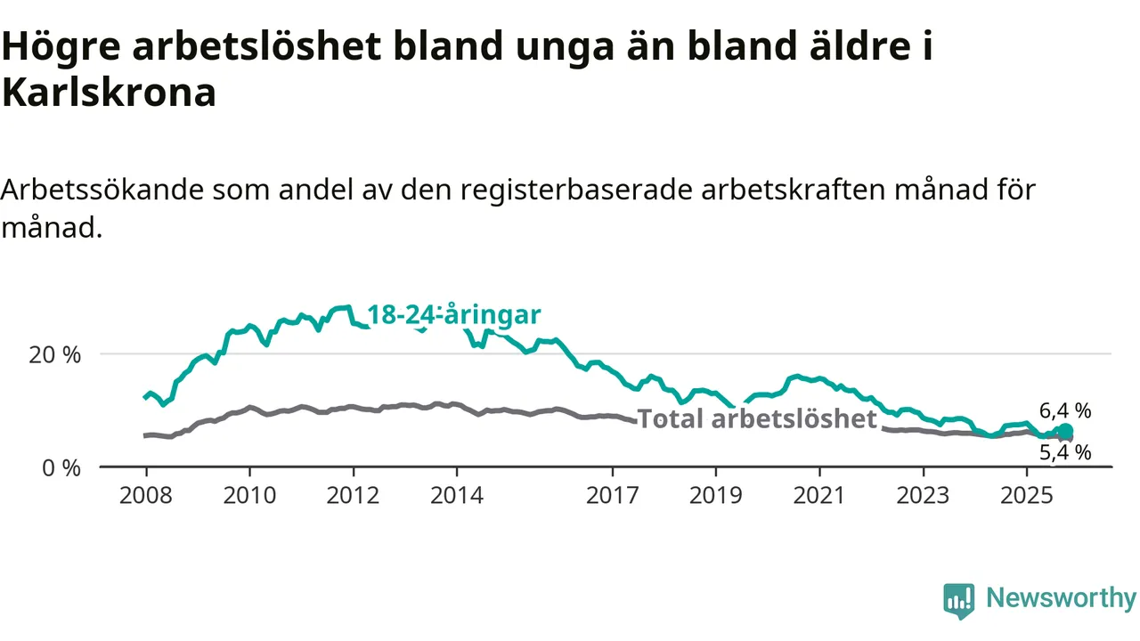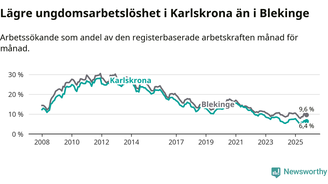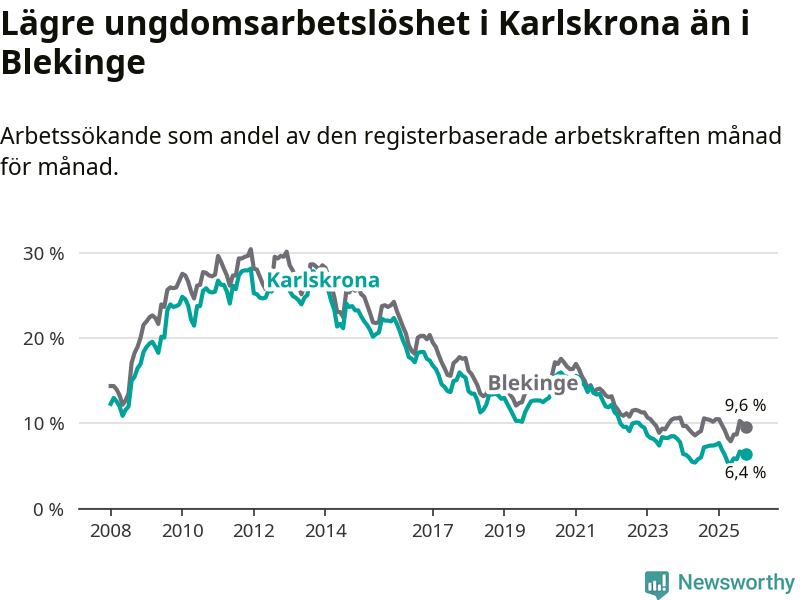Precis som den totala arbetslösheten ligger ungdomsarbetslösheten i Karlskrona lägre än i Blekinge som helhet. Skillnaden mellan kommunen och länet är 3,2 procentenheter.