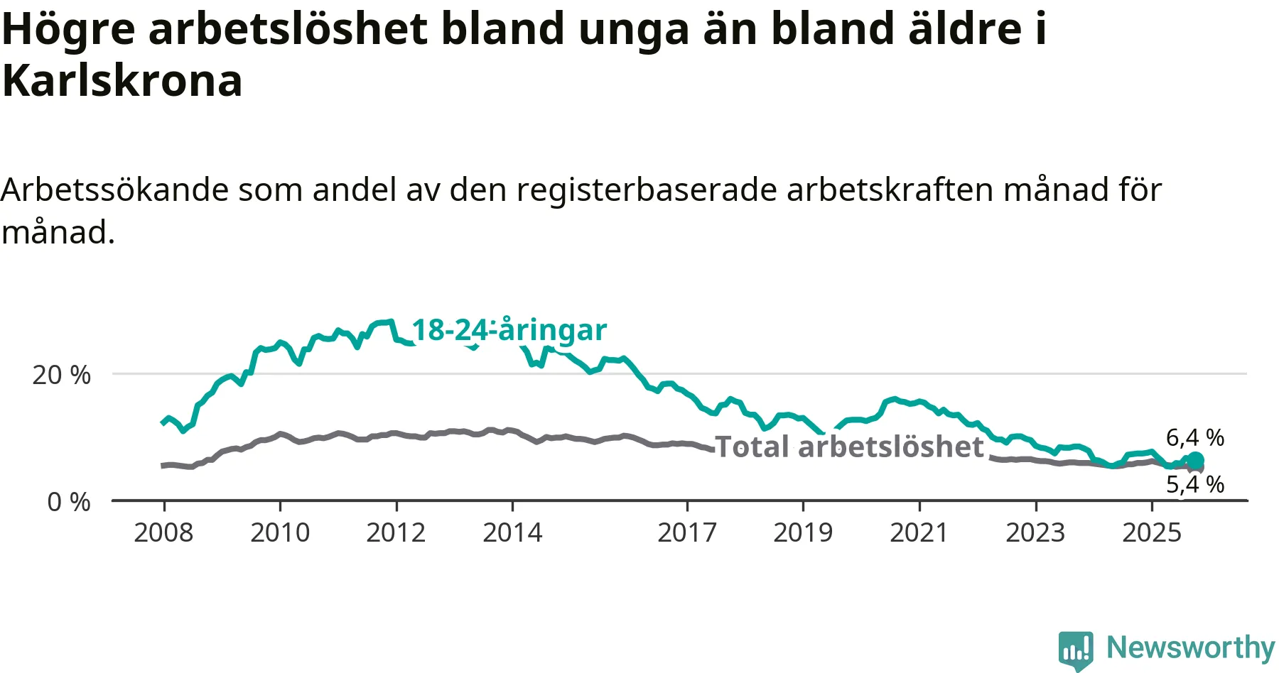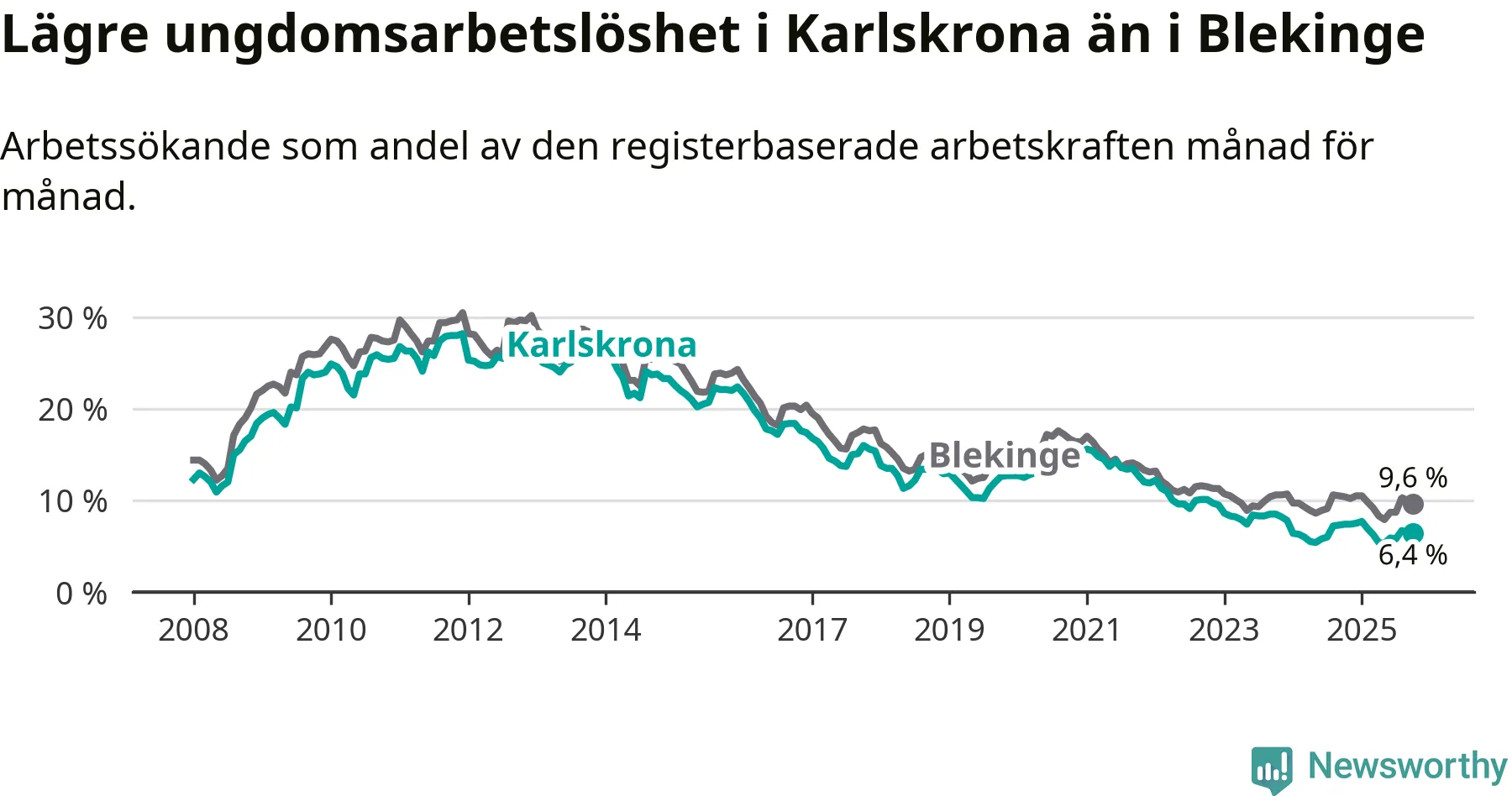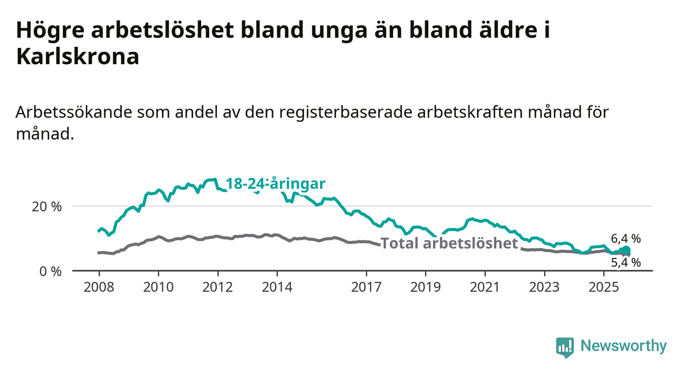 Precis som den totala arbetslösheten ligger ungdomsarbetslösheten i Karlskrona lägre än i Blekinge som helhet. Skillnaden mellan kommunen och länet är 3,2 procentenheter.