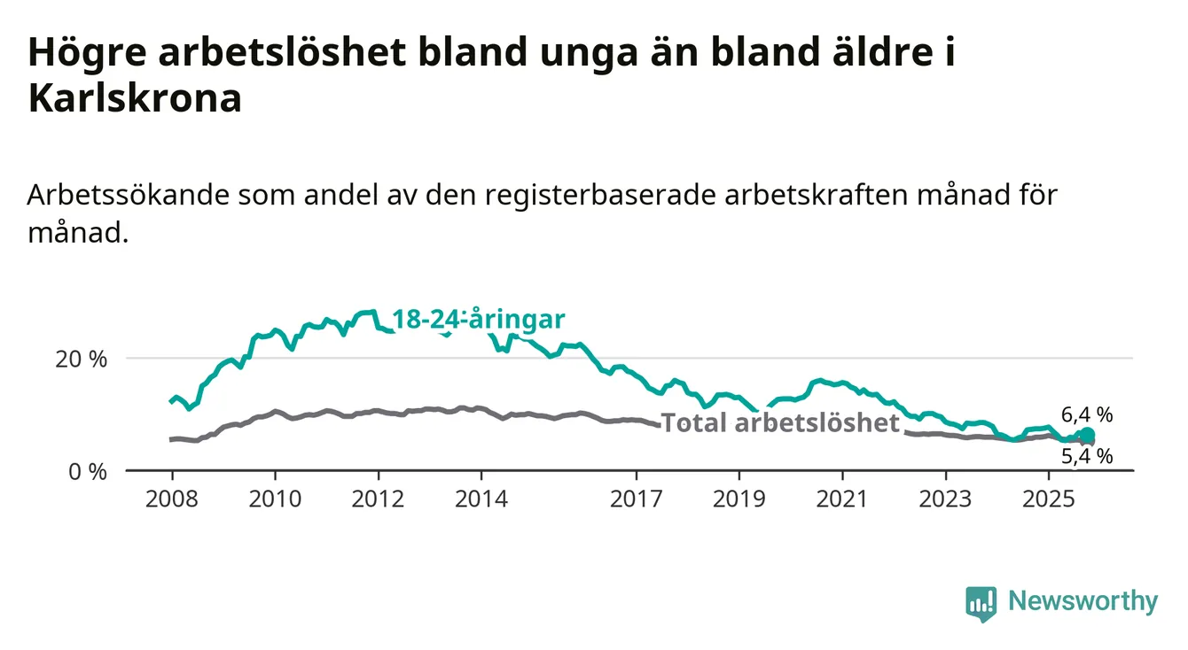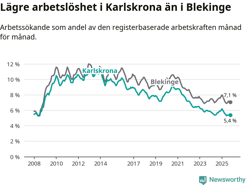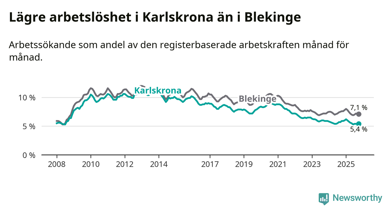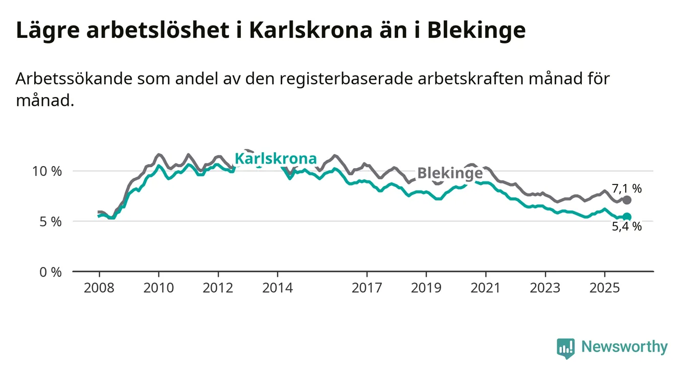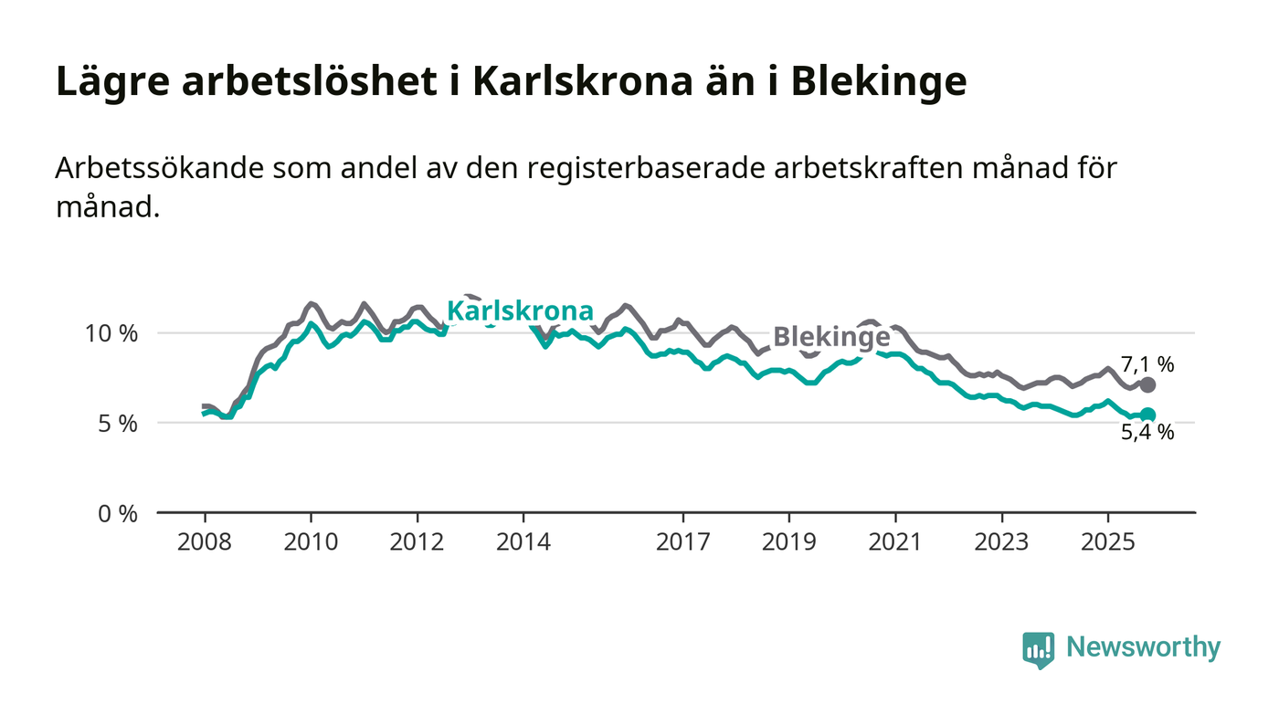 Under oktober månad rapporterade Karlskrona kommun en total arbetslöshet på 5,4 procent. Det är en minskning jämfört med samma tidpunkt i fjol (−0,5 procentenheter). Även i Blekinge län sjunker arbetslösheten .