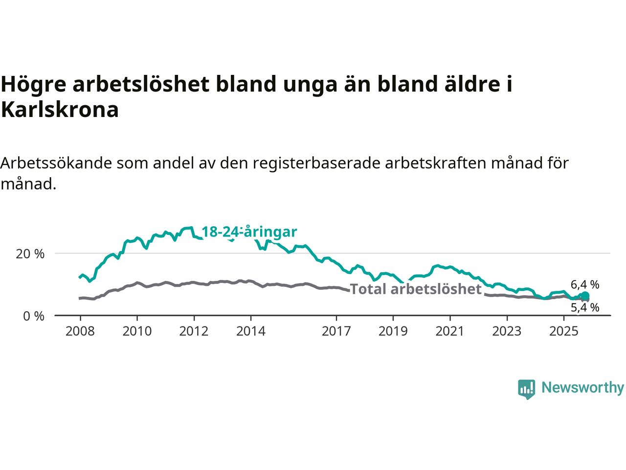 Precis som den totala arbetslösheten sjunker arbetslösheten bland unga (−1 procentenheter). I oktober var 6,4 procent av 18–24-åringarna inskrivna som arbetssökande (motsvarande 258 personer). Mäter vi antalet inskrivna ser vi en minskning med 35 personer på ett års sikt.