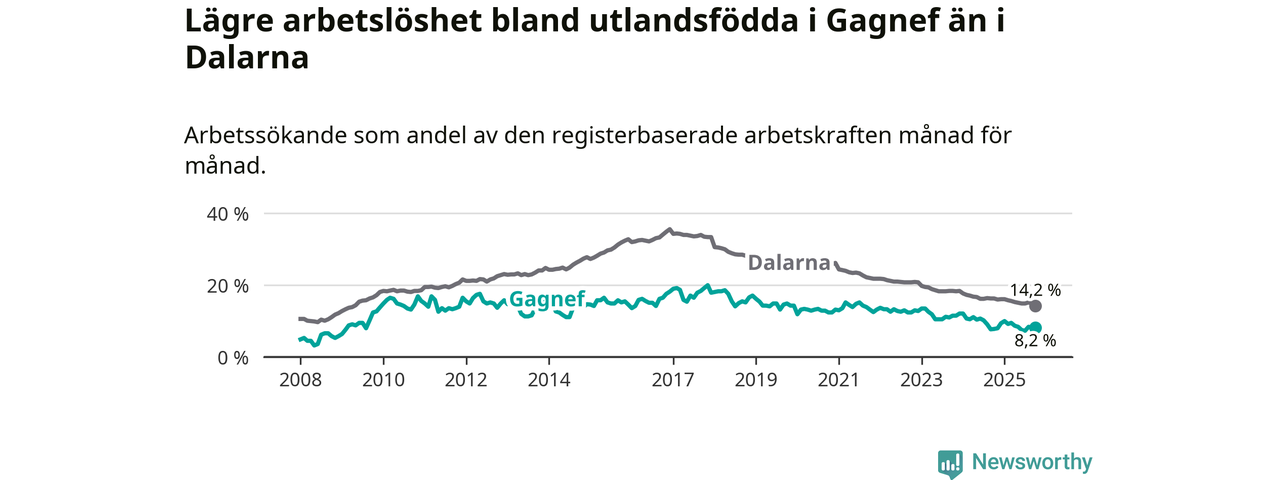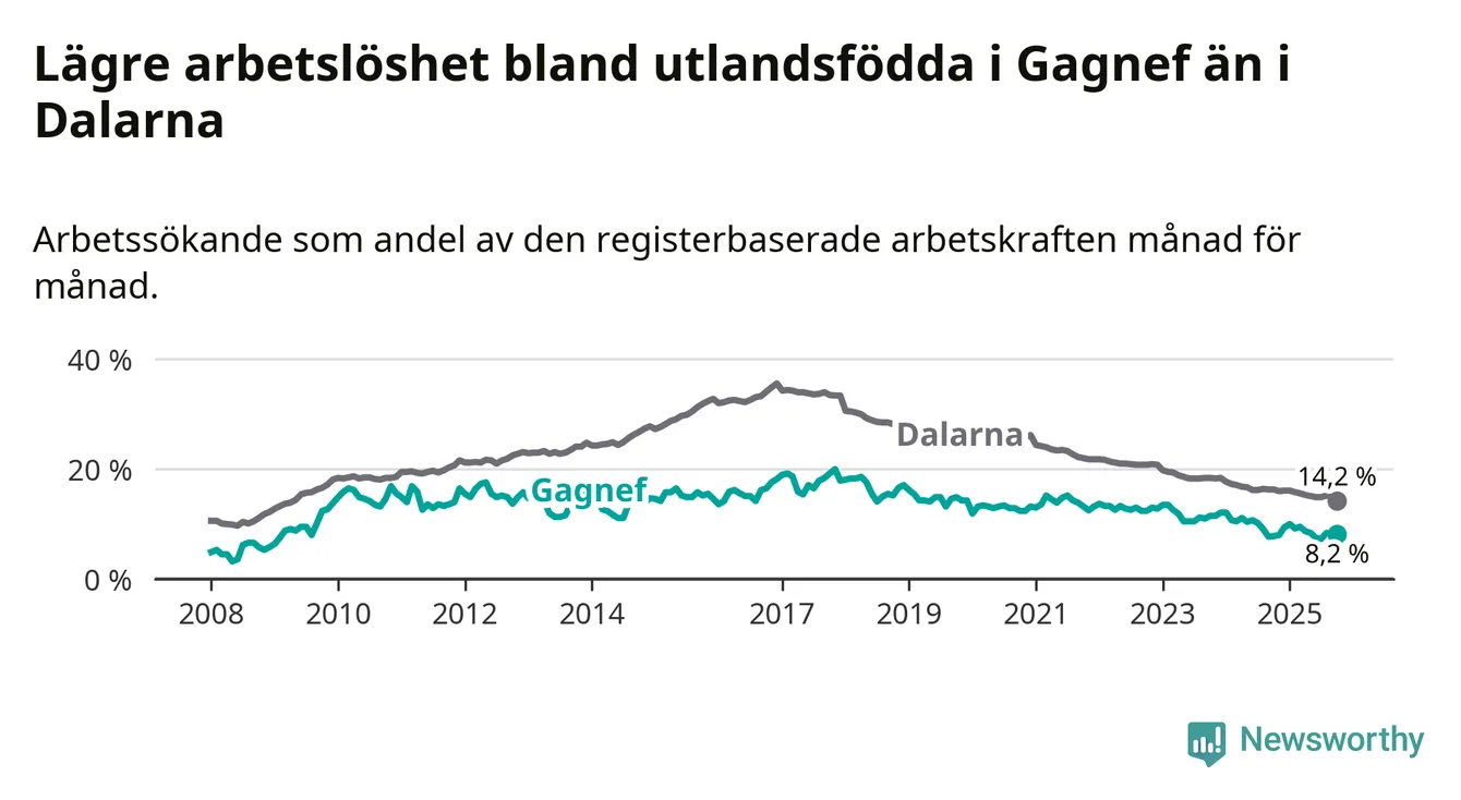 Medan arbetslösheten bland utlandsfödda alltså ökar i Gagnef så minskar den i Dalarna. Jämfört med oktober förra året har andelen arbetslösa utlandsfödda i länet minskat med 2,1 procentenheter (till 14,2 procent). Trots den senaste uppgången har Gagnef med andra ord fortfarande lägre arbetslöshet bland utlandsfödda än Dalarna.