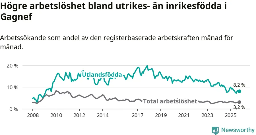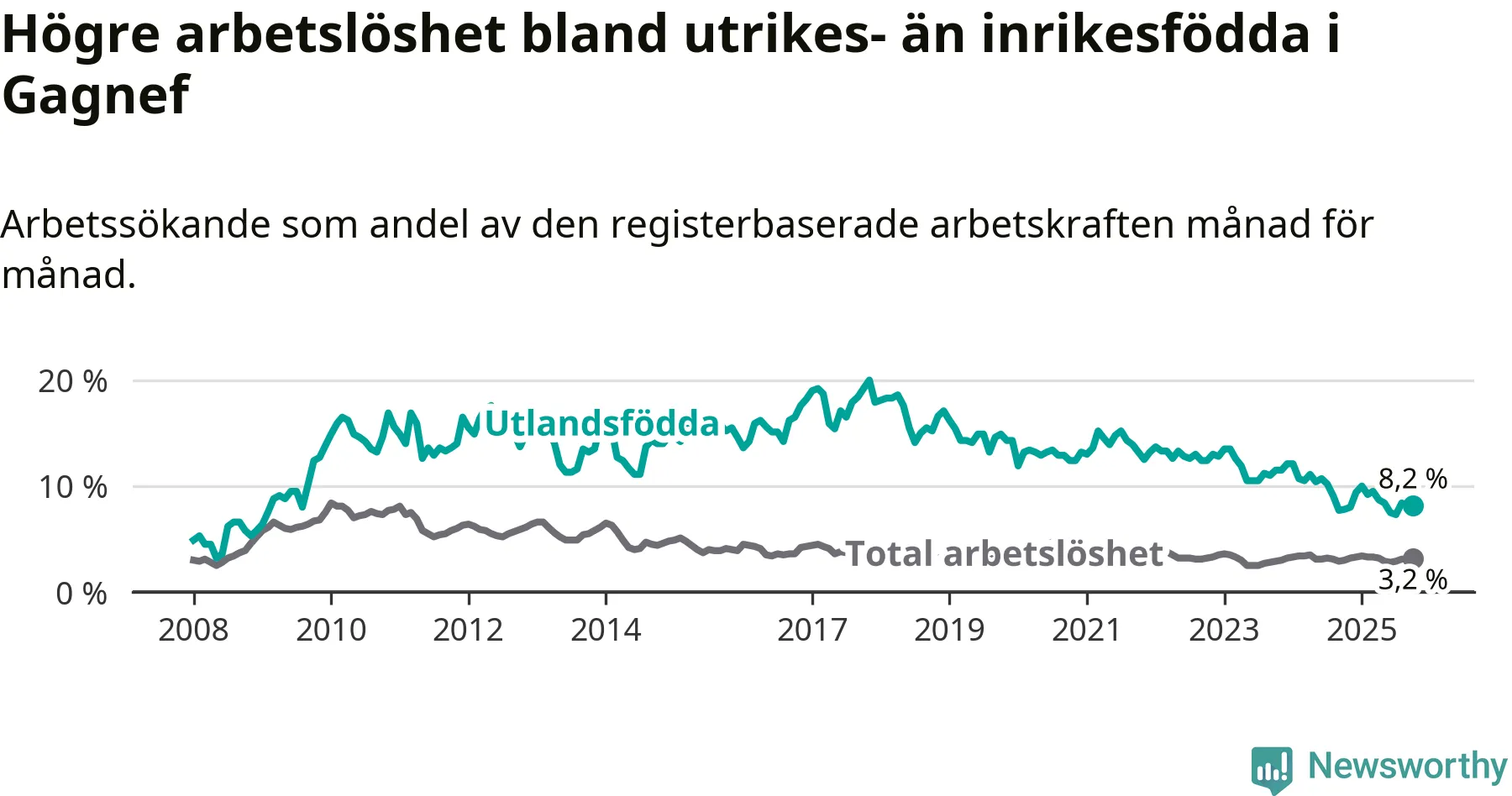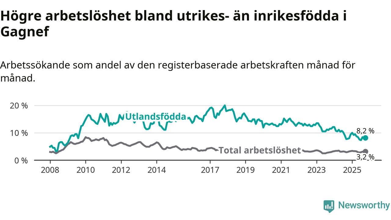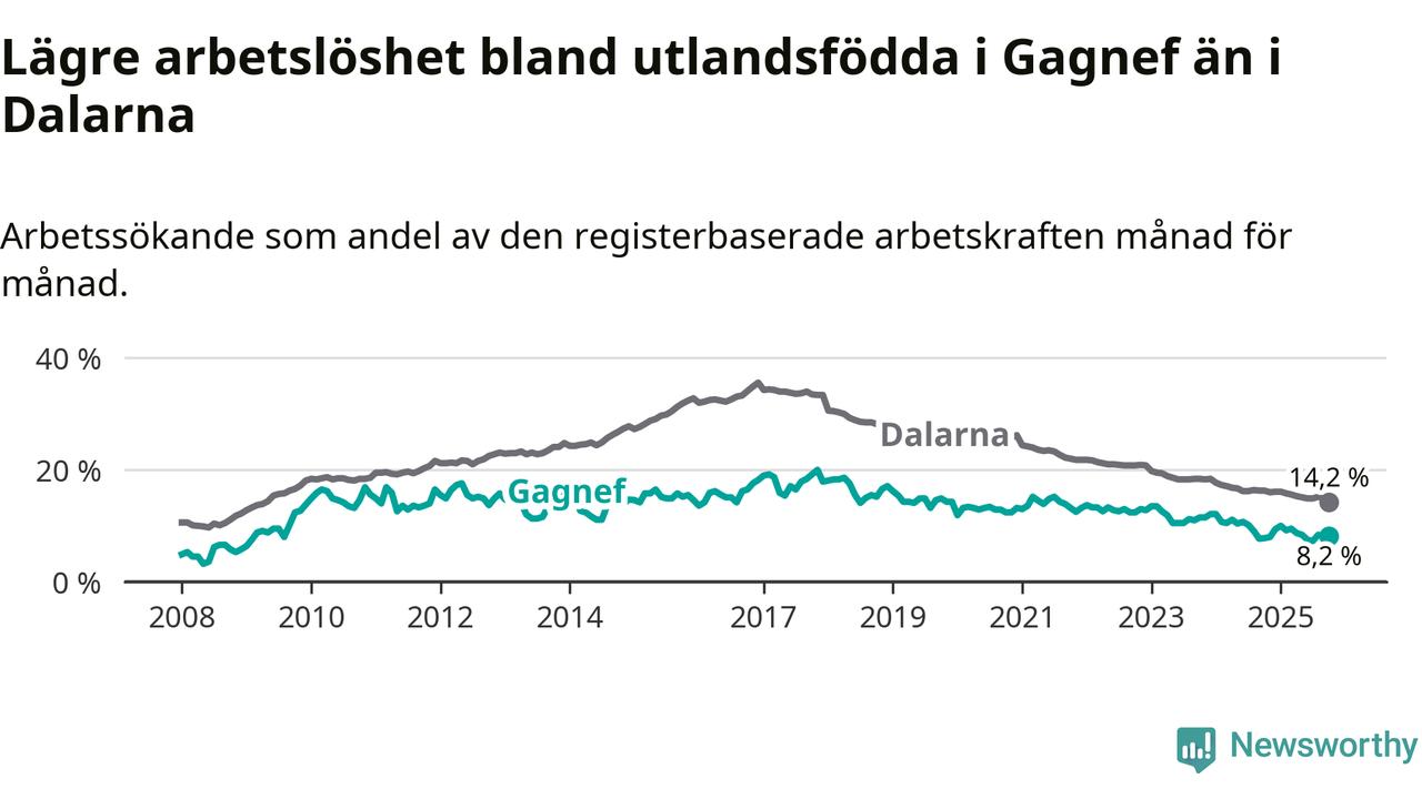 Arbetslösheten bland utlandsfödda var 8,2 procent i Gagnef under oktober månad, motsvarande 29 av 354 personer. Det är 0,4 procentenheter fler än vid samma tidpunkt i fjol (+1 om man räknar personer).