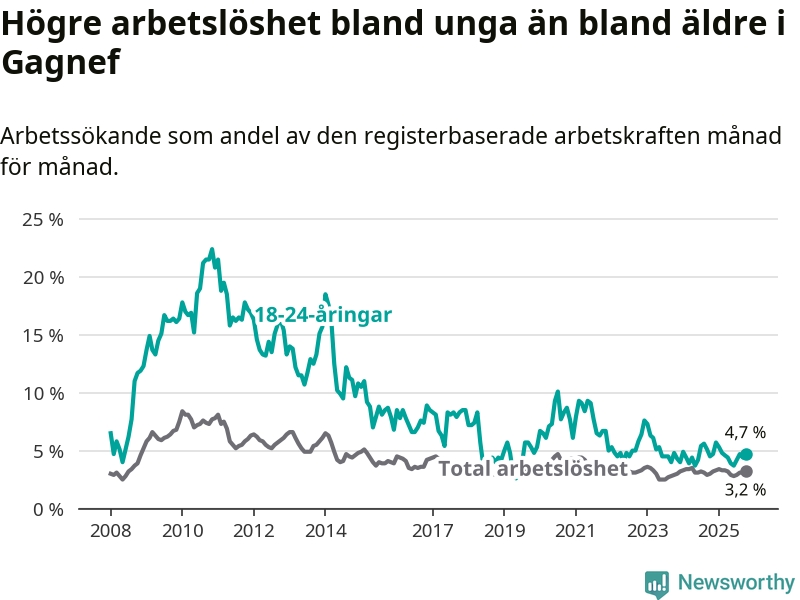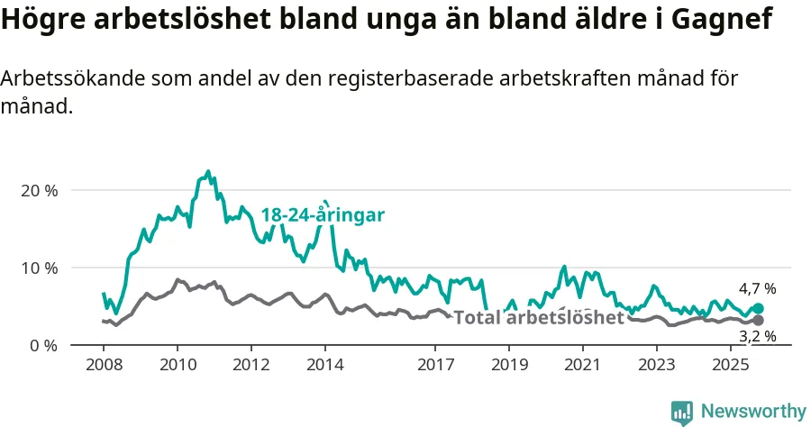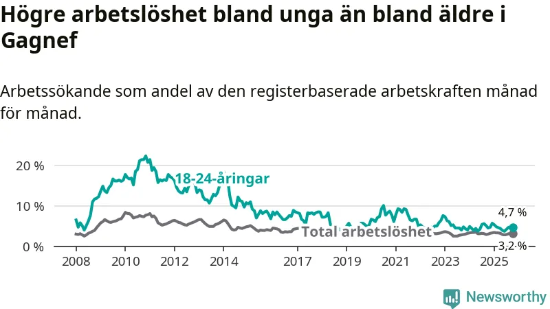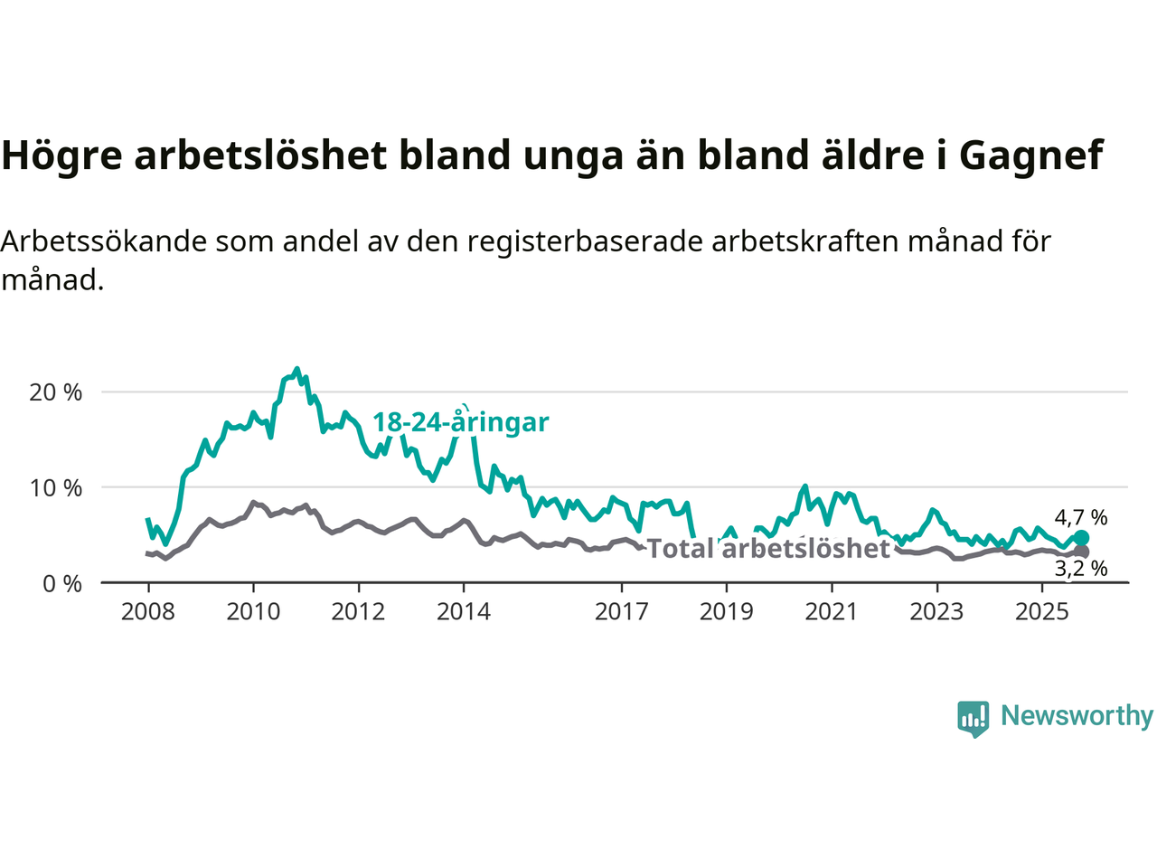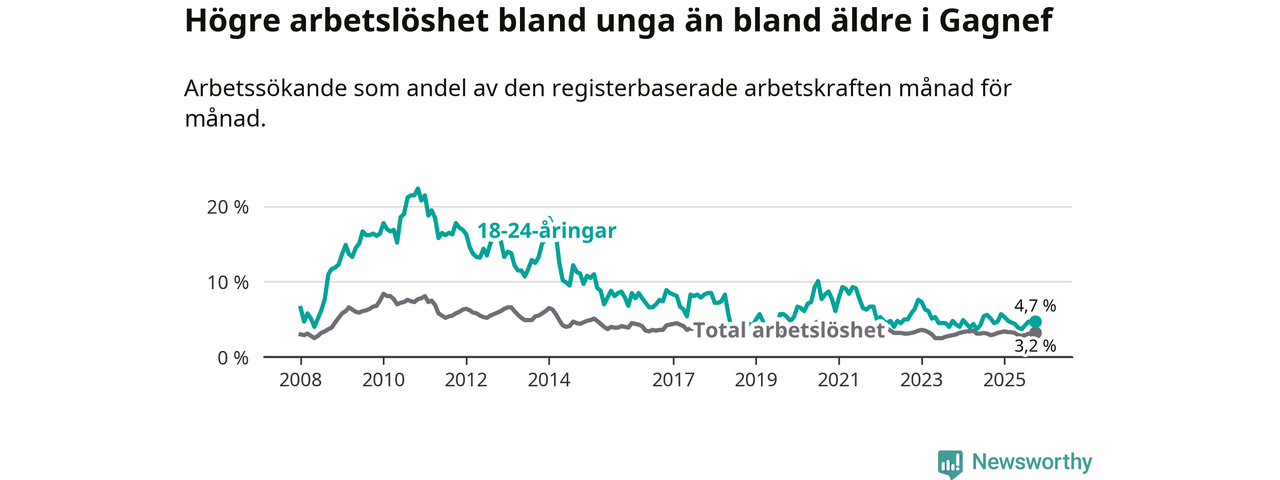 Precis som den totala arbetslösheten stiger arbetslösheten bland unga (+0,2 procentenheter). I oktober var 4,7 procent av 18–24-åringarna inskrivna som arbetssökande (motsvarande 19 personer). Mäter vi antalet inskrivna har det däremot inte skett någon förändring.