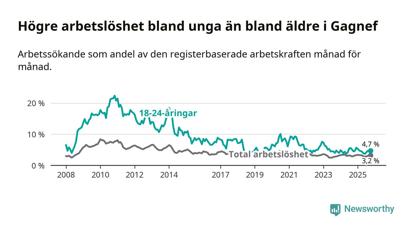 Precis som den totala arbetslösheten ligger ungdomsarbetslösheten i Gagnef lägre än i Dalarna som helhet. Skillnaden mellan kommunen och länet är 1,2 procentenheter.