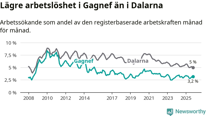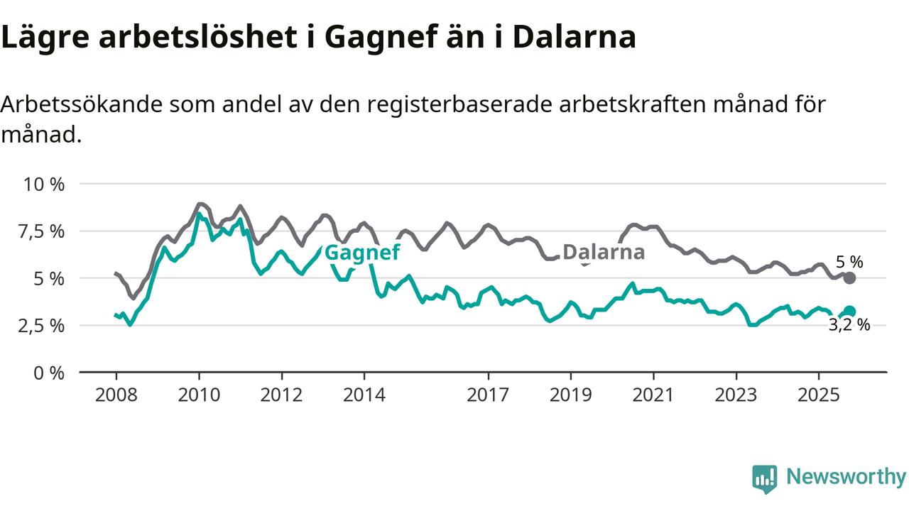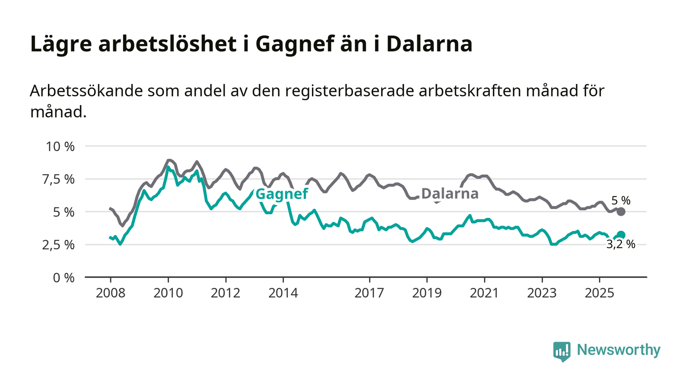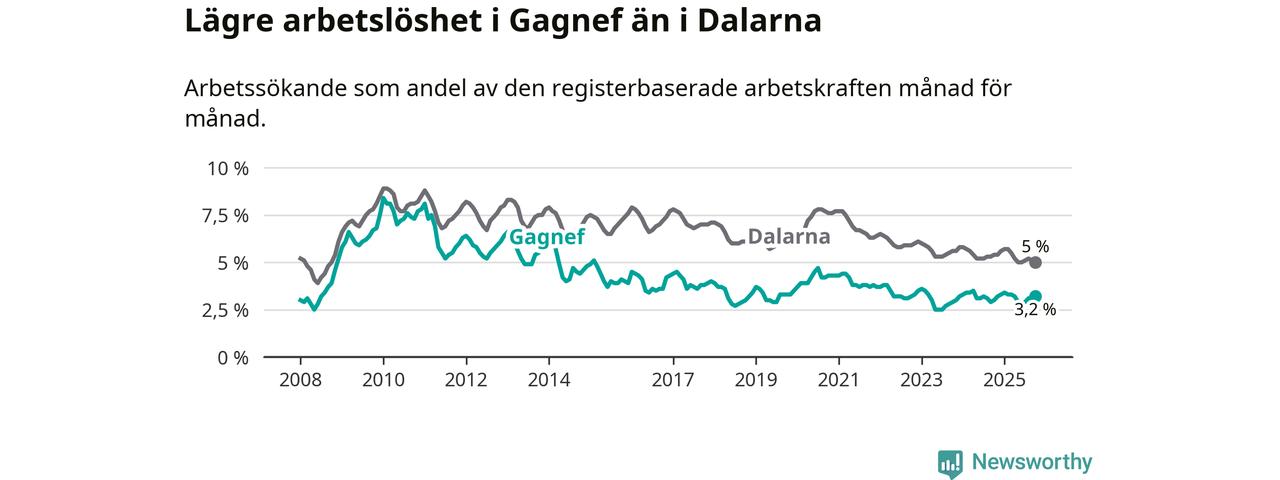 Gagnef går därmed mot strömmen i förhållande till andra kommuner i Dalarnas län. I de flesta andra kommuner i länet går arbetslösheten nedåt. Störst är minskningen i Hedemora, där arbetslösheten sjunker med 0,8 procentenheter. I tabellen längre ner ser du utvecklingen i samtliga kommuner i länet.