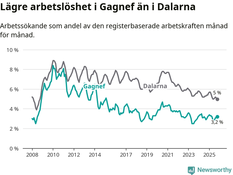 Under oktober månad rapporterade Gagnefs kommun en total arbetslöshet på 3,2 procent. Det är en ökning jämfört med samma tidpunkt i fjol (+0,2 procentenheter). I Dalarnas län däremot sjunker arbetslösheten .