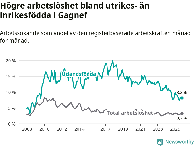 | Bland utlandsfödda | 8,2 % | +0,4 % ▲ | 14,2 % | −2,1 % ▼ | 14,5 % | −0,8 % ▼ |