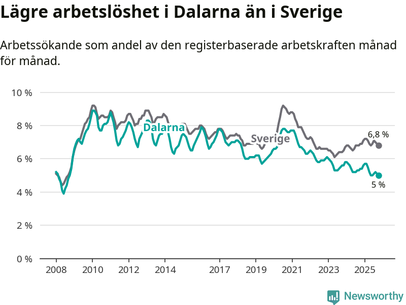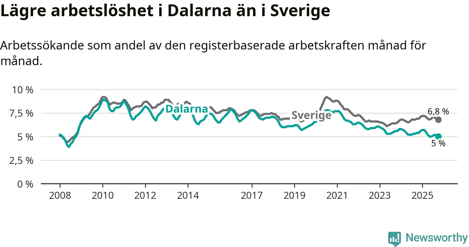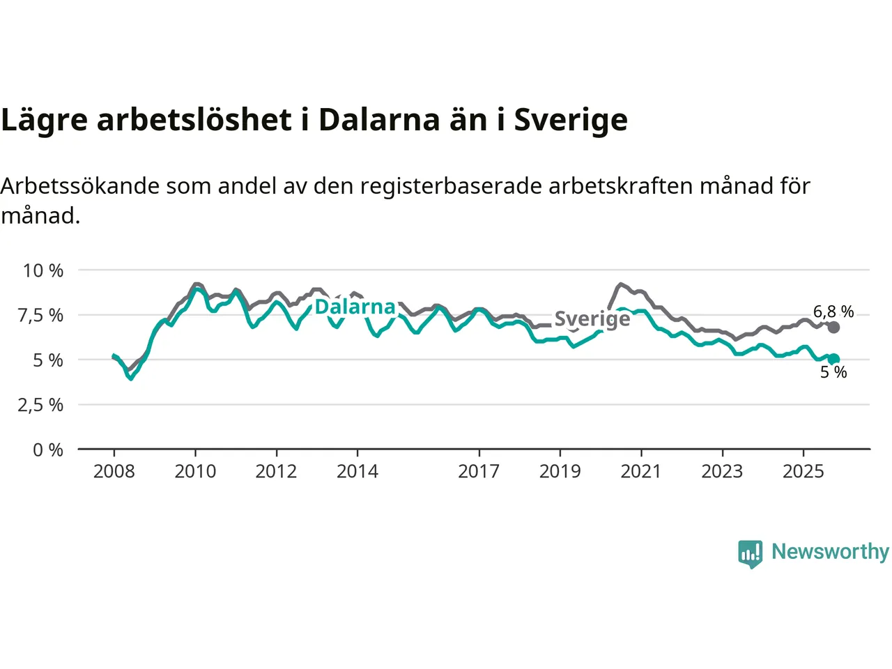 Under oktober månad rapporterade Dalarnas län en total arbetslöshet på 5,0 procent. Det är en minskning jämfört med samma tidpunkt i fjol (−0,4 procentenheter). Även i Sverige sjunker arbetslösheten något.