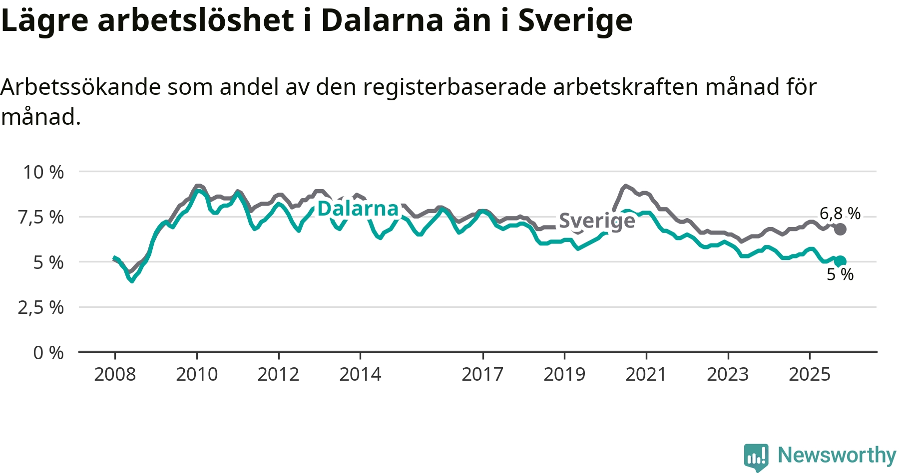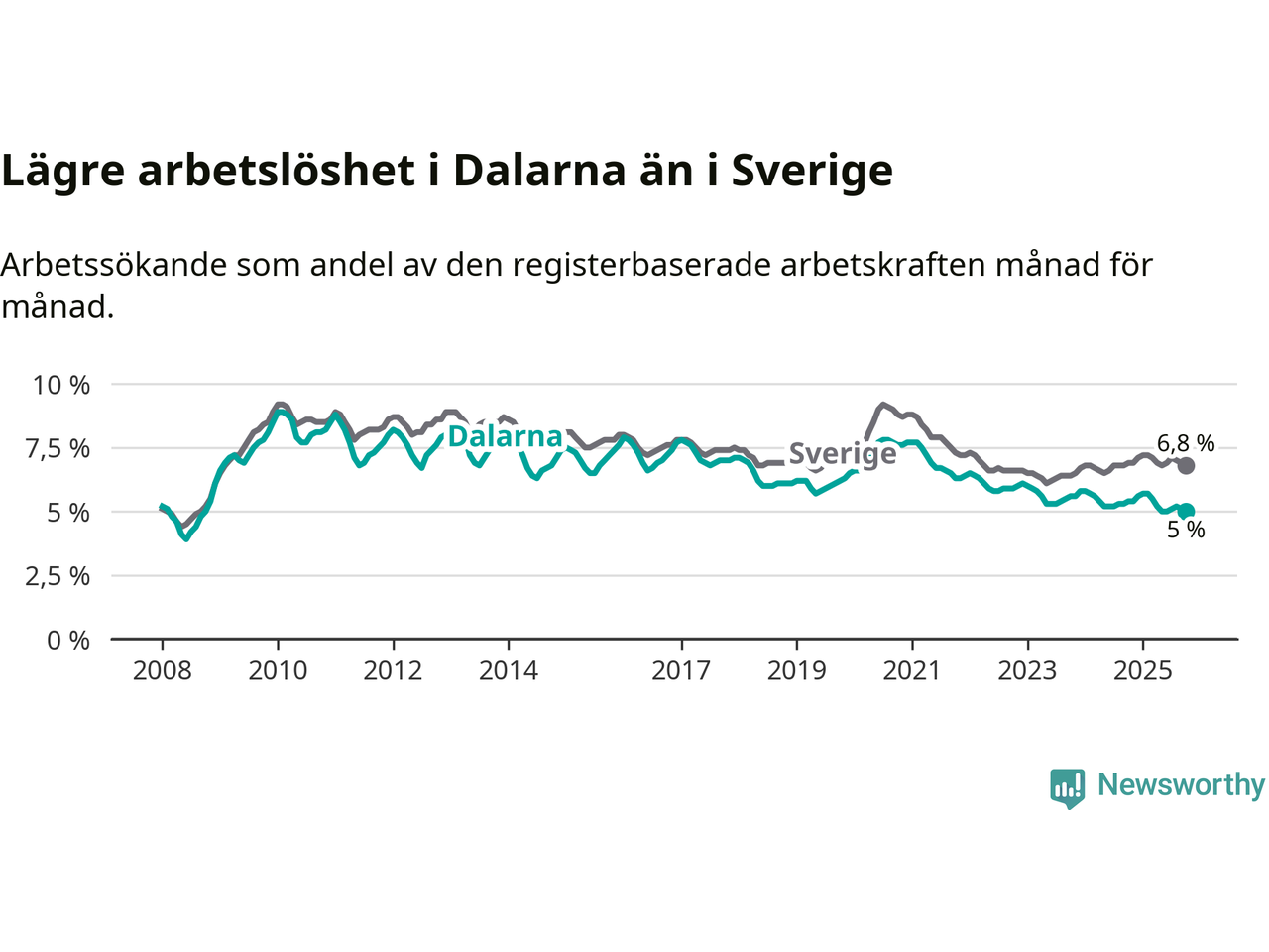 Dalarna hade redan tidigare lägre arbetslöshet än snittet i hela Sverige och nu växer klyftan (5,0 procent i länet, jämfört med 6,8 procent i hela riket). Norrbotten har den lägsta arbetslösheten i riket (3,9 procent), medan Skåne har den högsta (8,8 procent). För att Dalarna skulle komma ner i samma arbetslöshetsnivå som Norrbotten skulle 1 489 personer behöva sysselsättas.