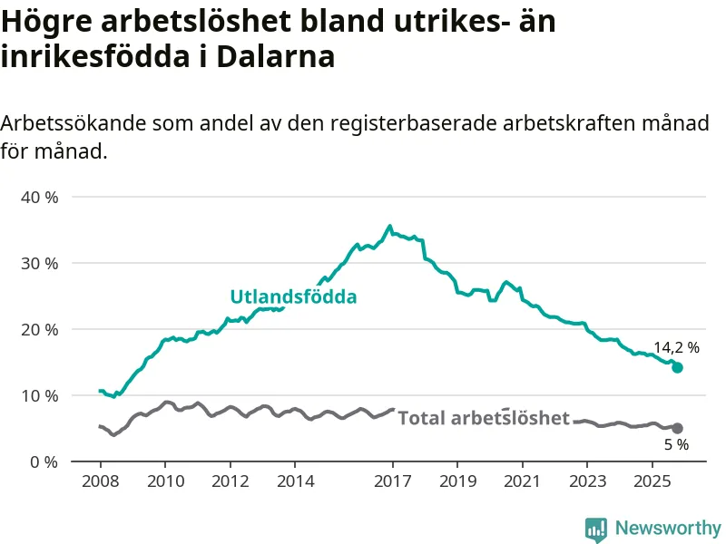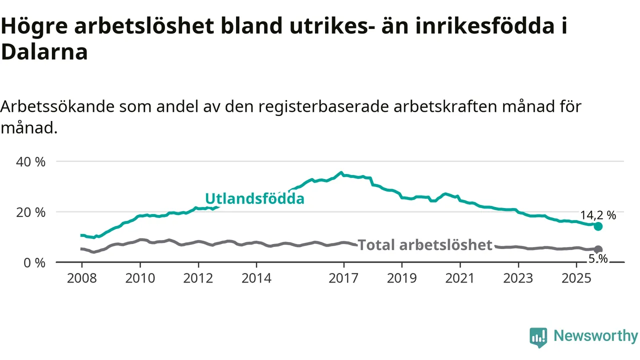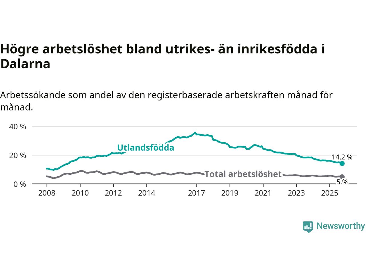 Arbetslösheten bland utlandsfödda var 14,2 procent i Dalarna under oktober månad, motsvarande 3 005 av 21 162 personer. Det är 2,1 procentenheter färre än vid samma tidpunkt i fjol (−409 om man räknar personer). Därmed har de utlandsföddas arbetslöshet varit lägre än vid samma tidpunkt i fjol i över fyra år i sträck. Sedan januari 2021 har arbetslösheten bland utlandsfödda minskat från 24,4 till 14,2 procent. Den nuvarande arbetslöshetsnivån är den lägsta sedan april 2009.