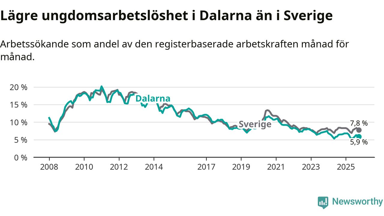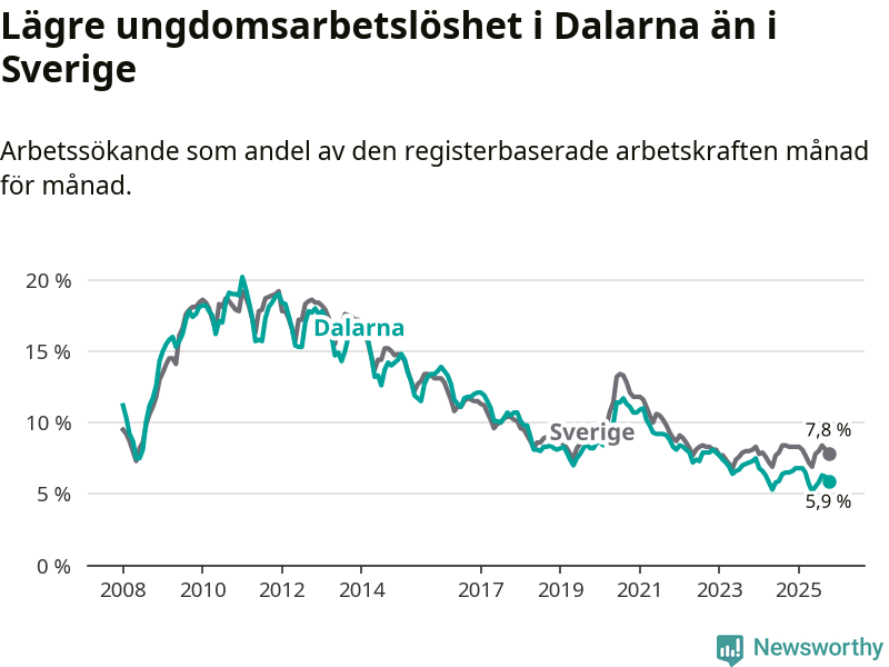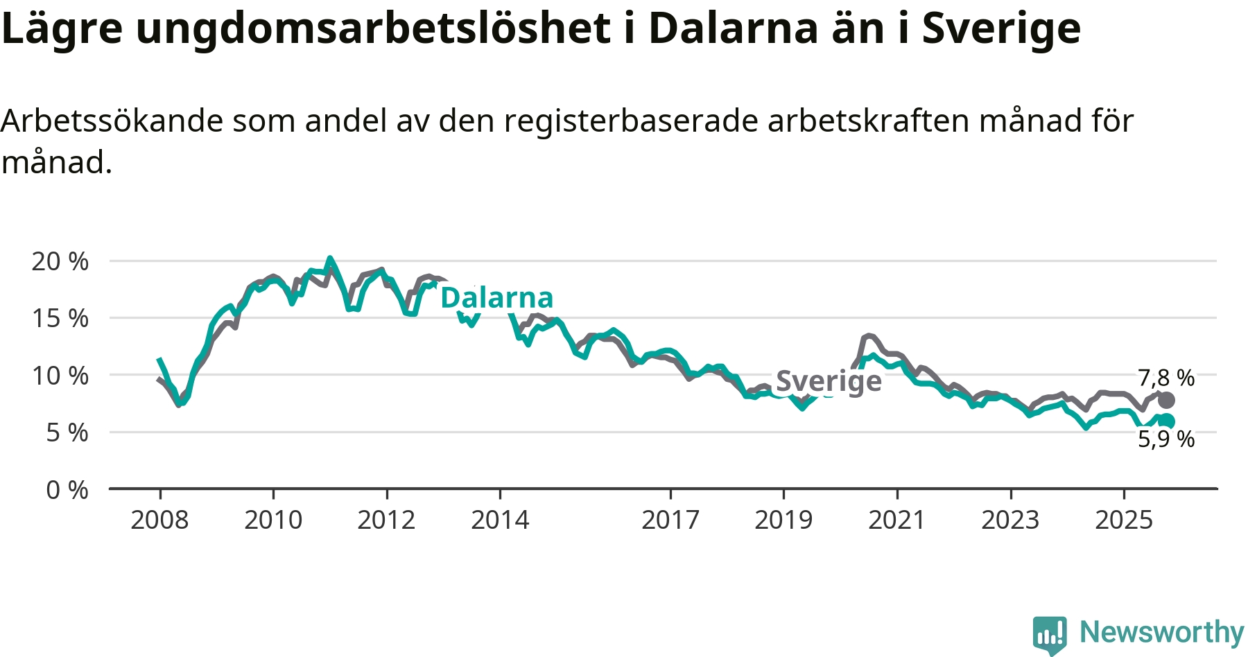 I och med den senaste månadens nedgång har de ungas arbetslöshet i Dalarna sjunkit sju månader i följd (ner från 6,5 procent i mars till 5,9 procent nu).