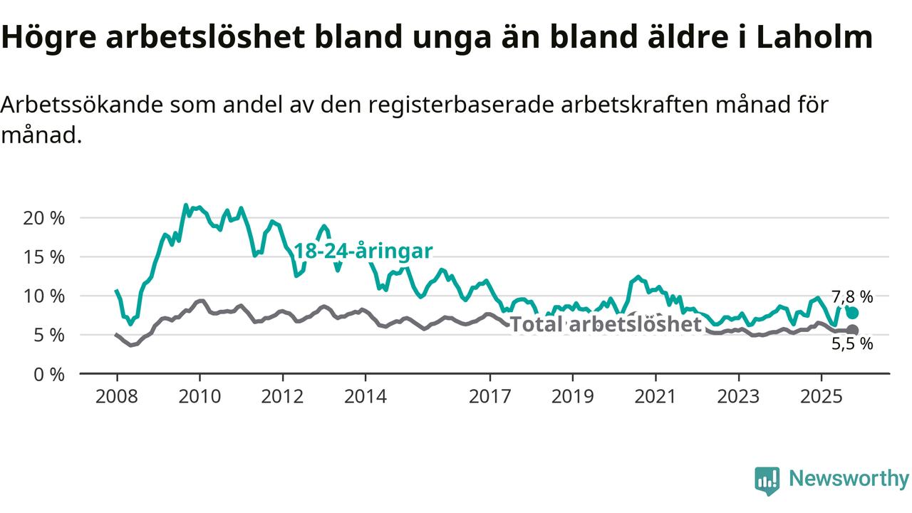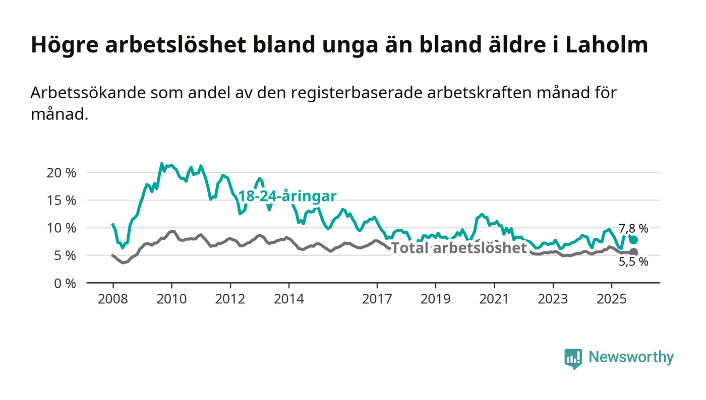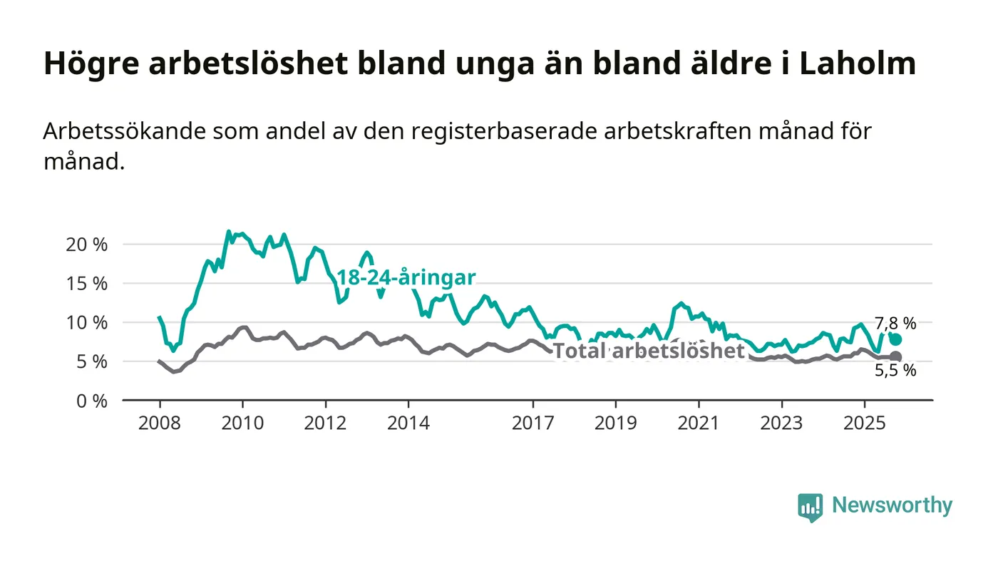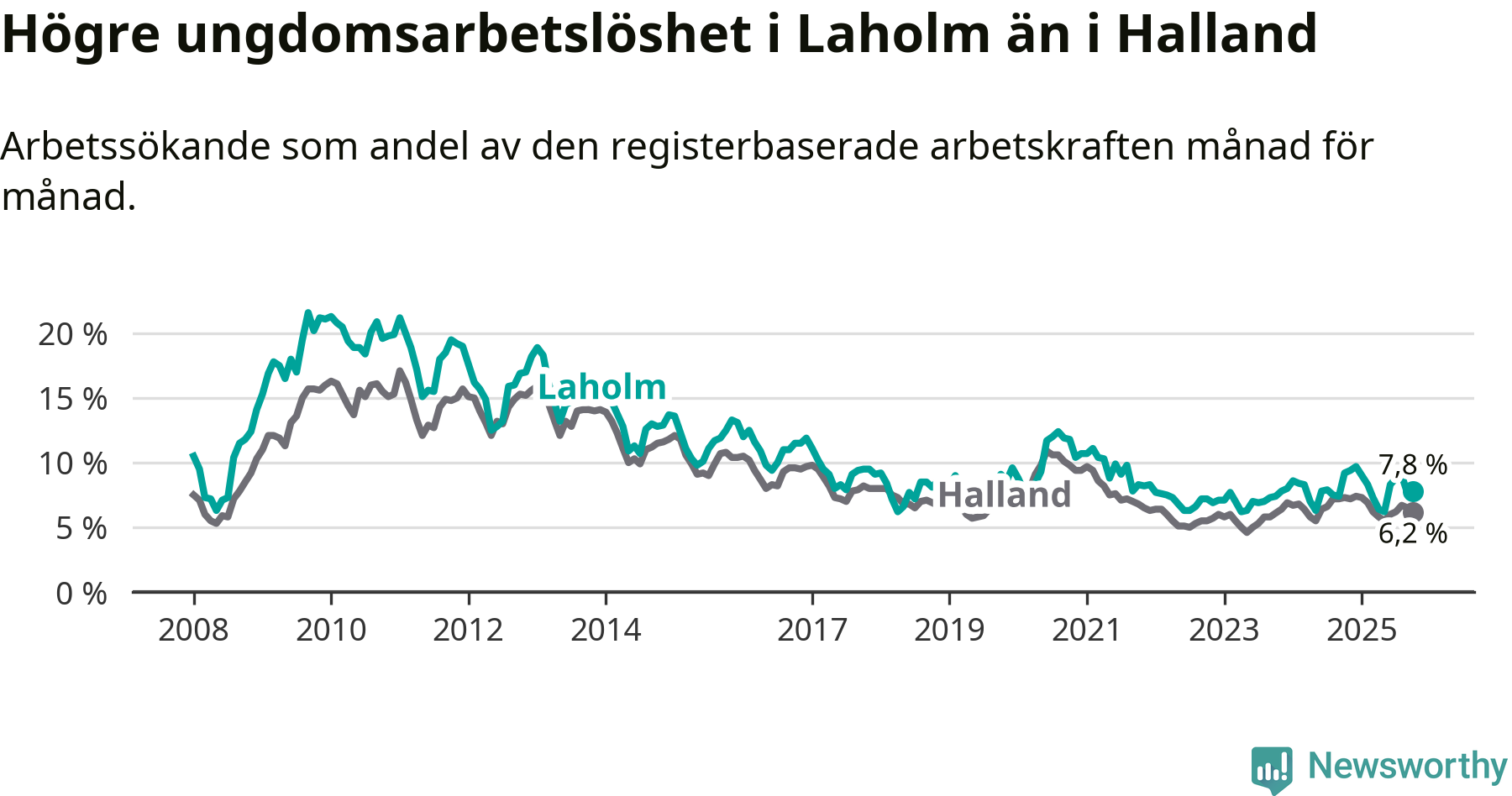 Precis som den totala arbetslösheten ligger ungdomsarbetslösheten i Laholm högre än i Halland som helhet. Skillnaden mellan kommunen och länet är 1,6 procentenheter.