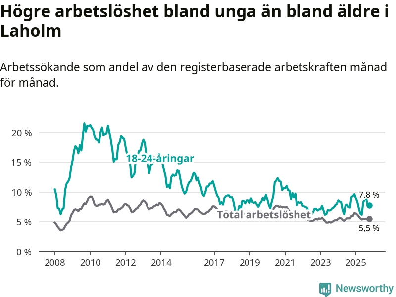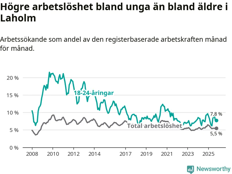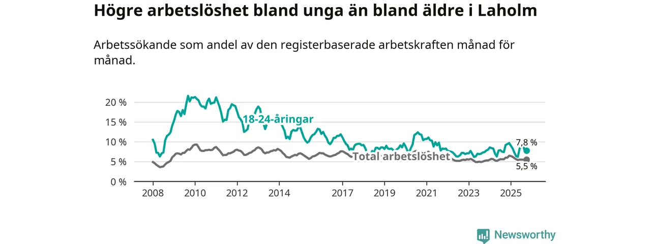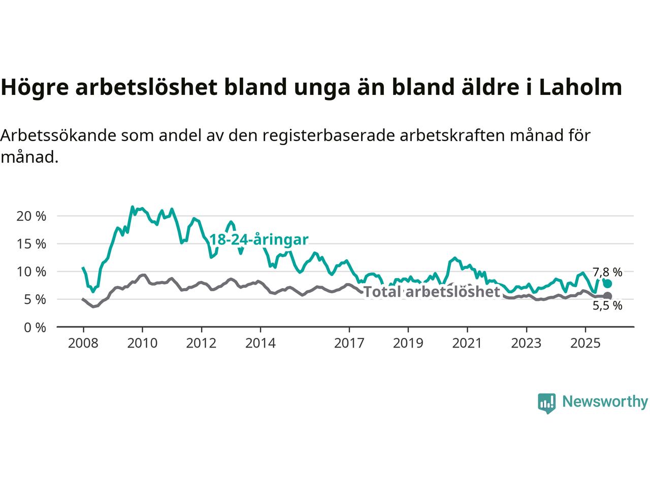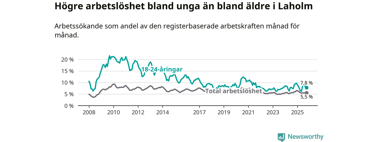 Precis som den totala arbetslösheten ligger ungdomsarbetslösheten i Laholm högre än i Halland som helhet. Skillnaden mellan kommunen och länet är 1,6 procentenheter.
