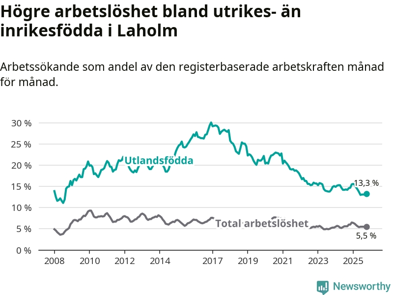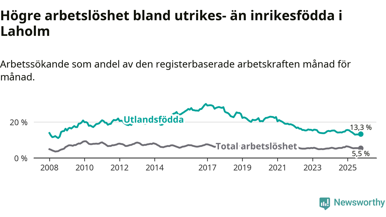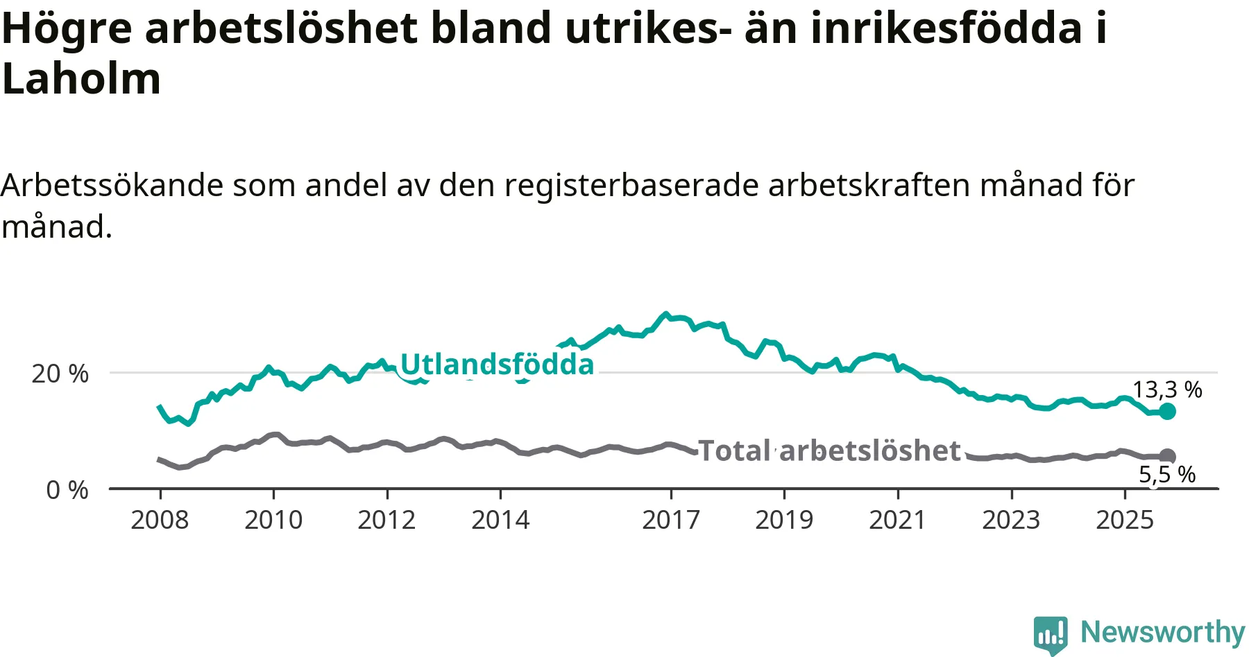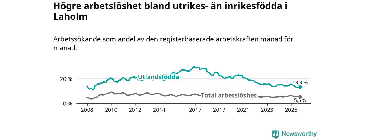 Skillnaden i arbetslöshet mellan utrikesfödda och hela befolkningen är 7,8 procentenheter i Laholm. Det är en mindre skillnad än för ett år sedan (−0,8 procentenheter).