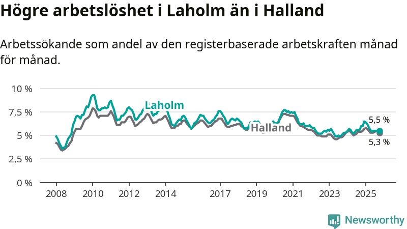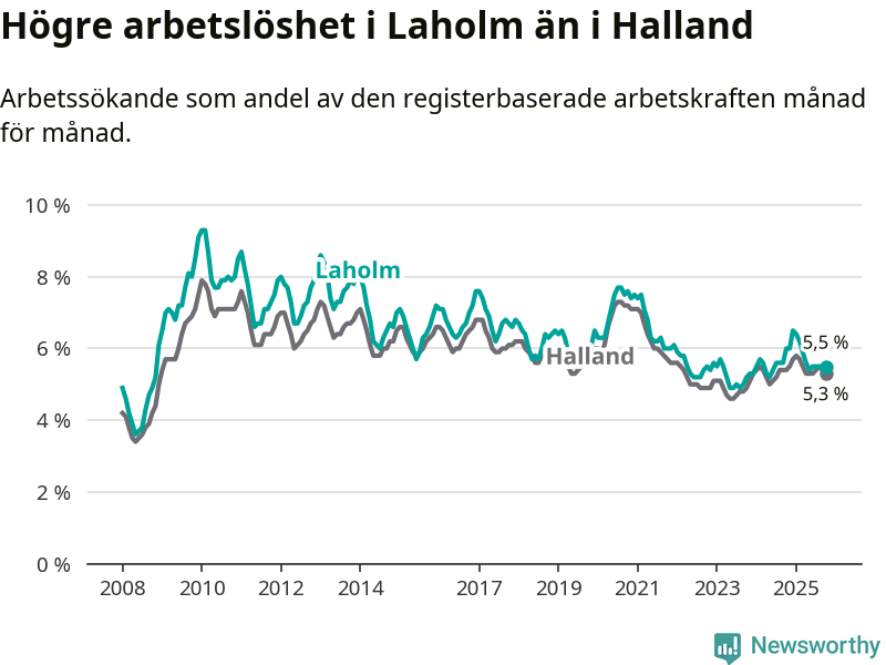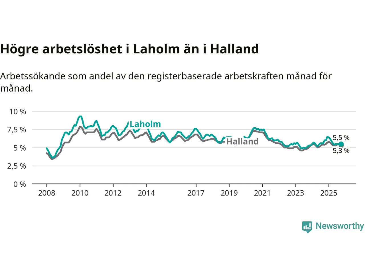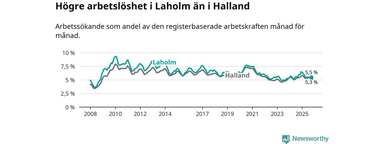 Under oktober månad rapporterade Laholms kommun en total arbetslöshet på 5,5 procent. Det är en minskning jämfört med samma tidpunkt i fjol (−0,5 procentenheter). Även i Hallands län sjunker arbetslösheten något.
