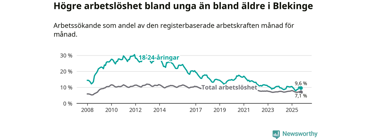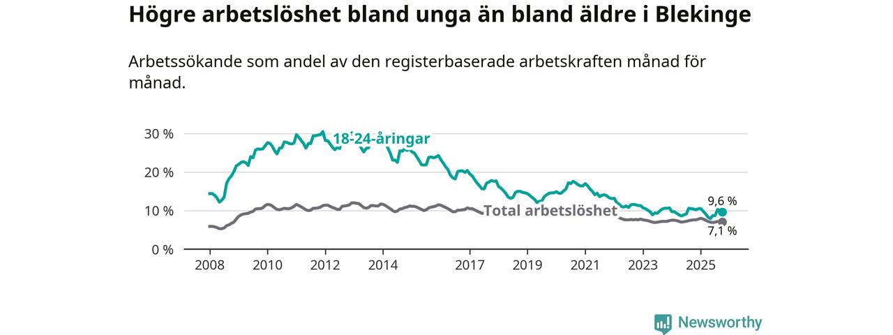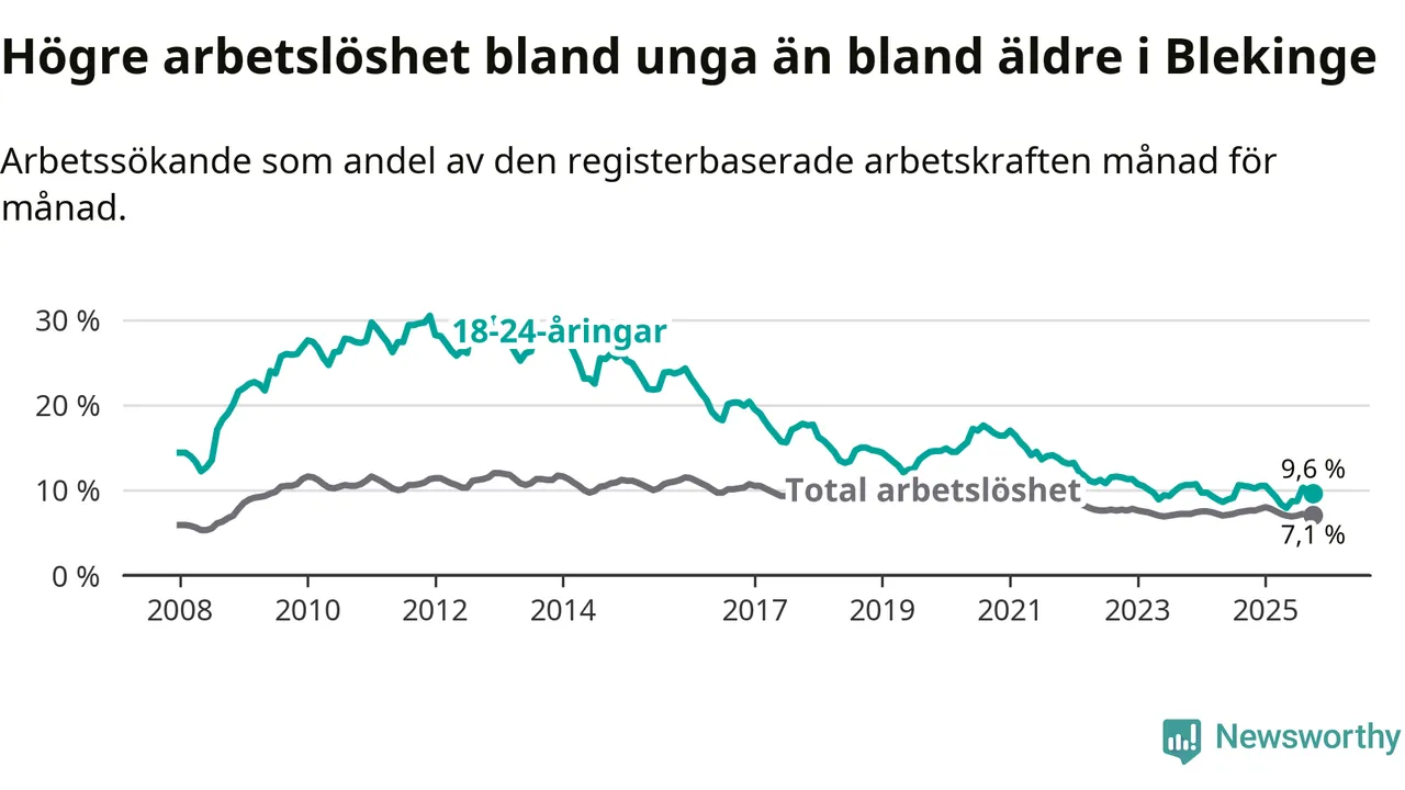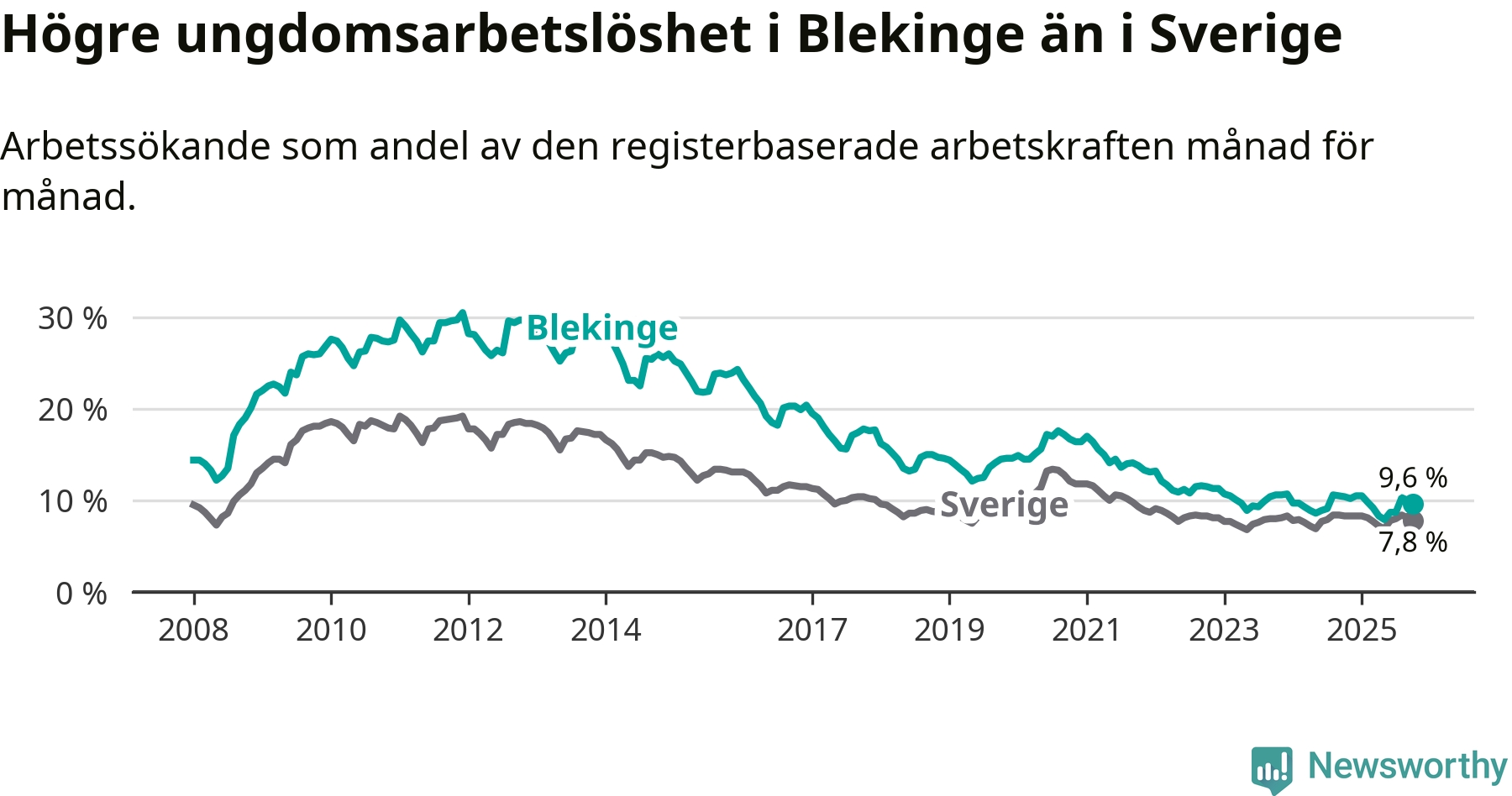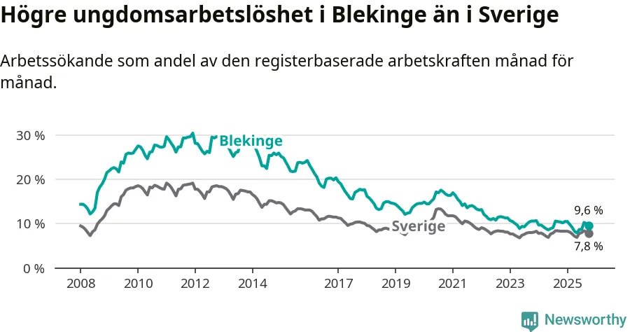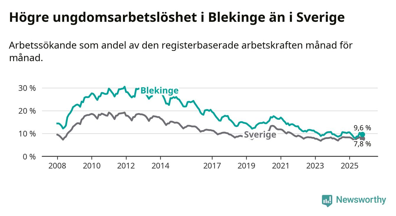 Precis som den totala arbetslösheten ligger ungdomsarbetslösheten i Blekinge högre än i Sverige som helhet. Skillnaden mellan länet och riket är 1,8 procentenheter.
