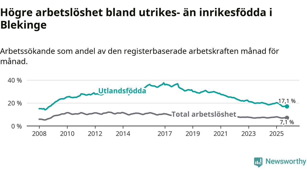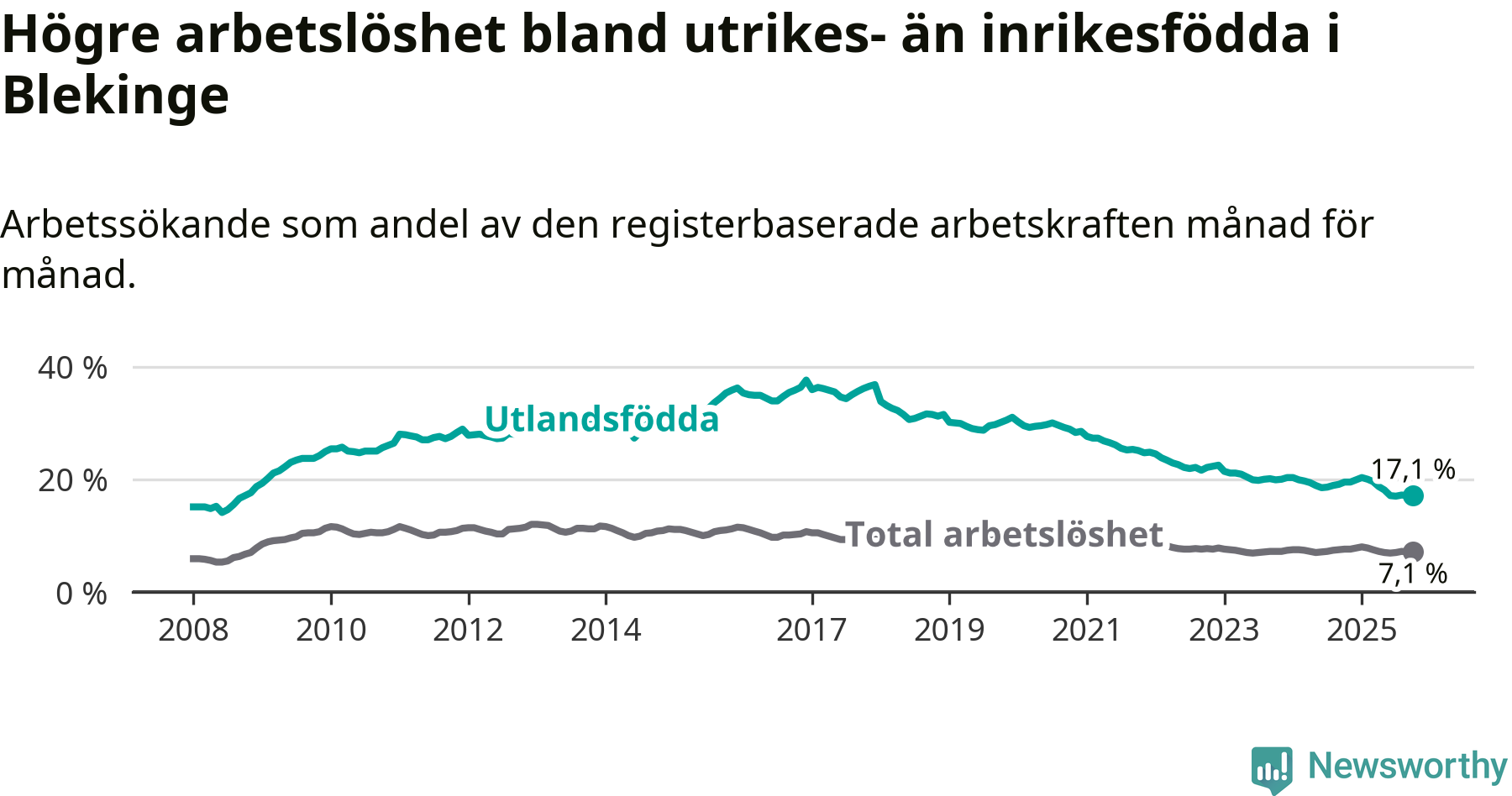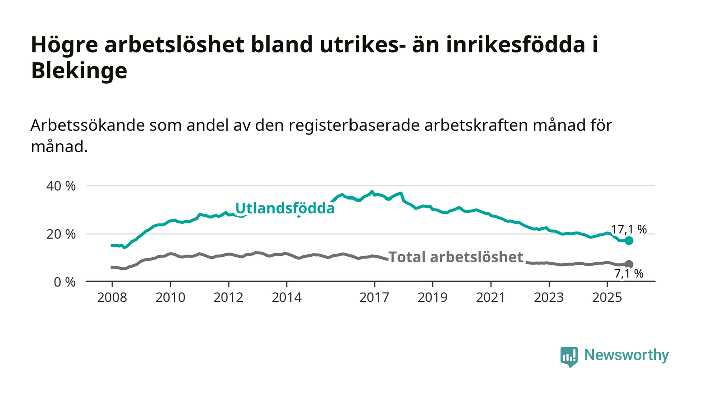 Arbetslösheten bland utlandsfödda var 17,1 procent i Blekinge under oktober månad, motsvarande 2 274 av 13 298 personer. Det är 2,4 procentenheter färre än vid samma tidpunkt i fjol (−324 om man räknar personer). Därmed är de utlandsföddas arbetslöshet lägre än vid samma tidpunkt i fjol för åttonde månaden i följd. Sedan februari har arbetslösheten bland utlandsfödda minskat från 20,0 till 17,1 procent.