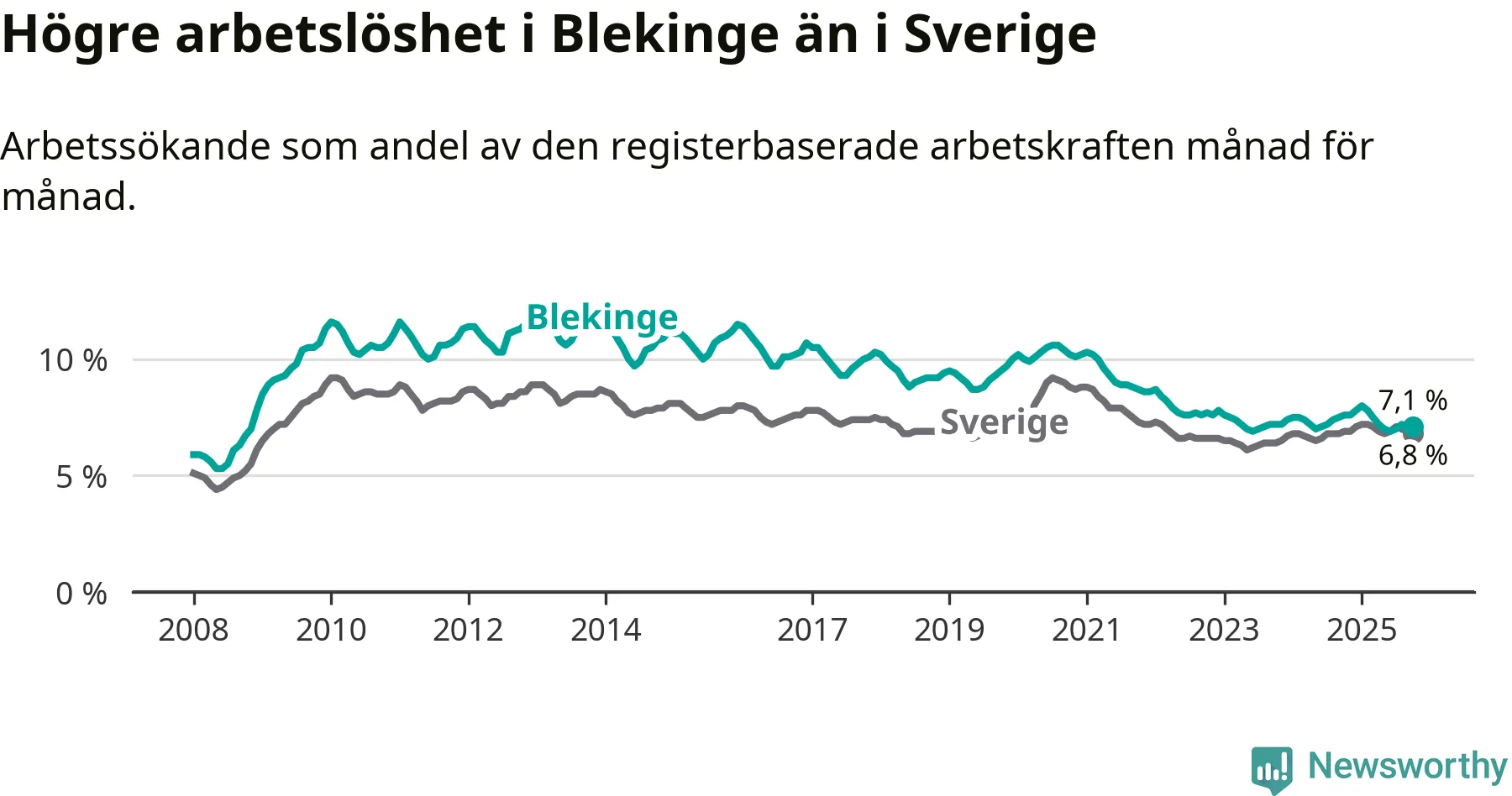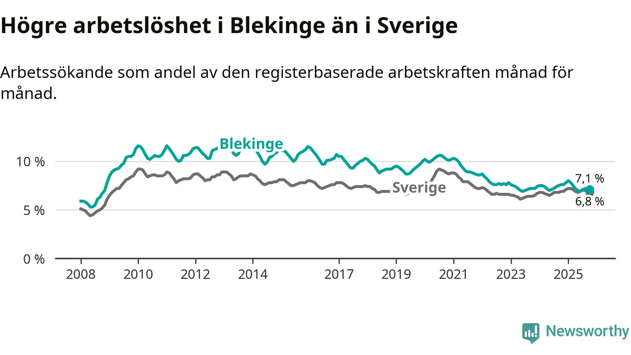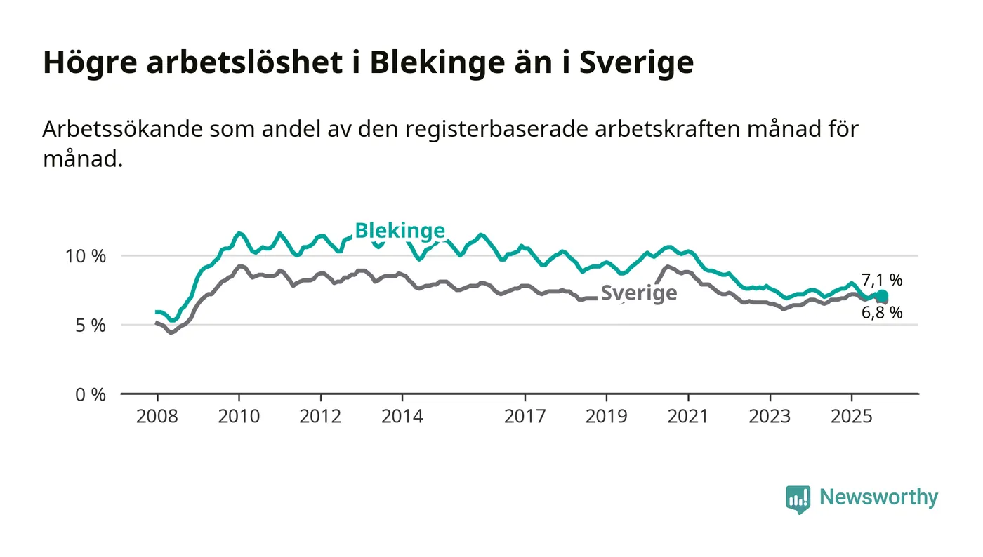 Även om arbetslösheten i Blekinge alltså minskar, så ligger den fortfarande över snittet i hela Sverige (7,1 procent i länet, jämfört med 6,8 procent i hela riket). Norrbotten har den lägsta arbetslösheten i riket (3,9 procent), medan Skåne har den högsta (8,8 procent). För att Blekinge skulle komma ner i samma arbetslöshetsnivå som Norrbotten skulle 2 416 personer behöva sysselsättas.