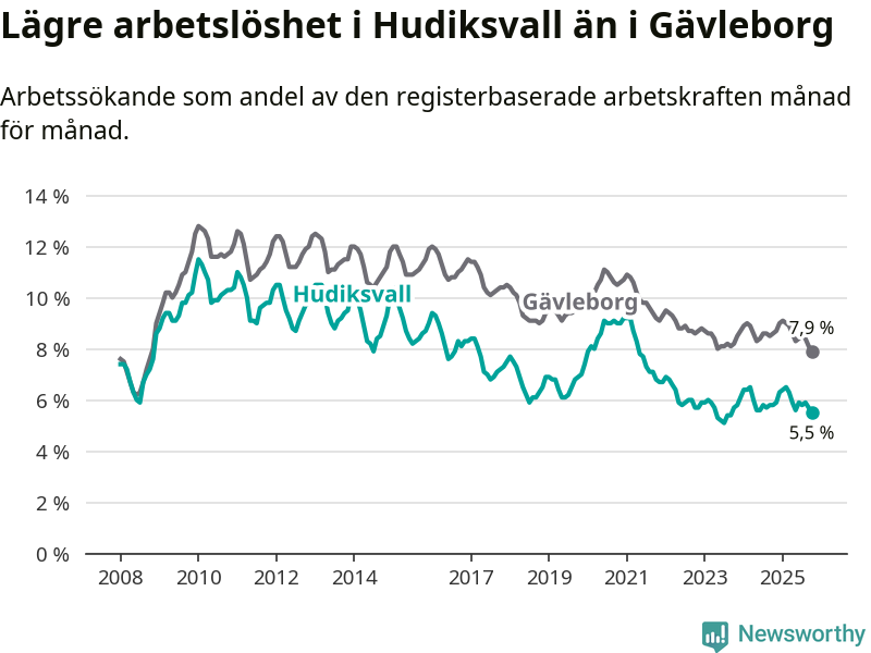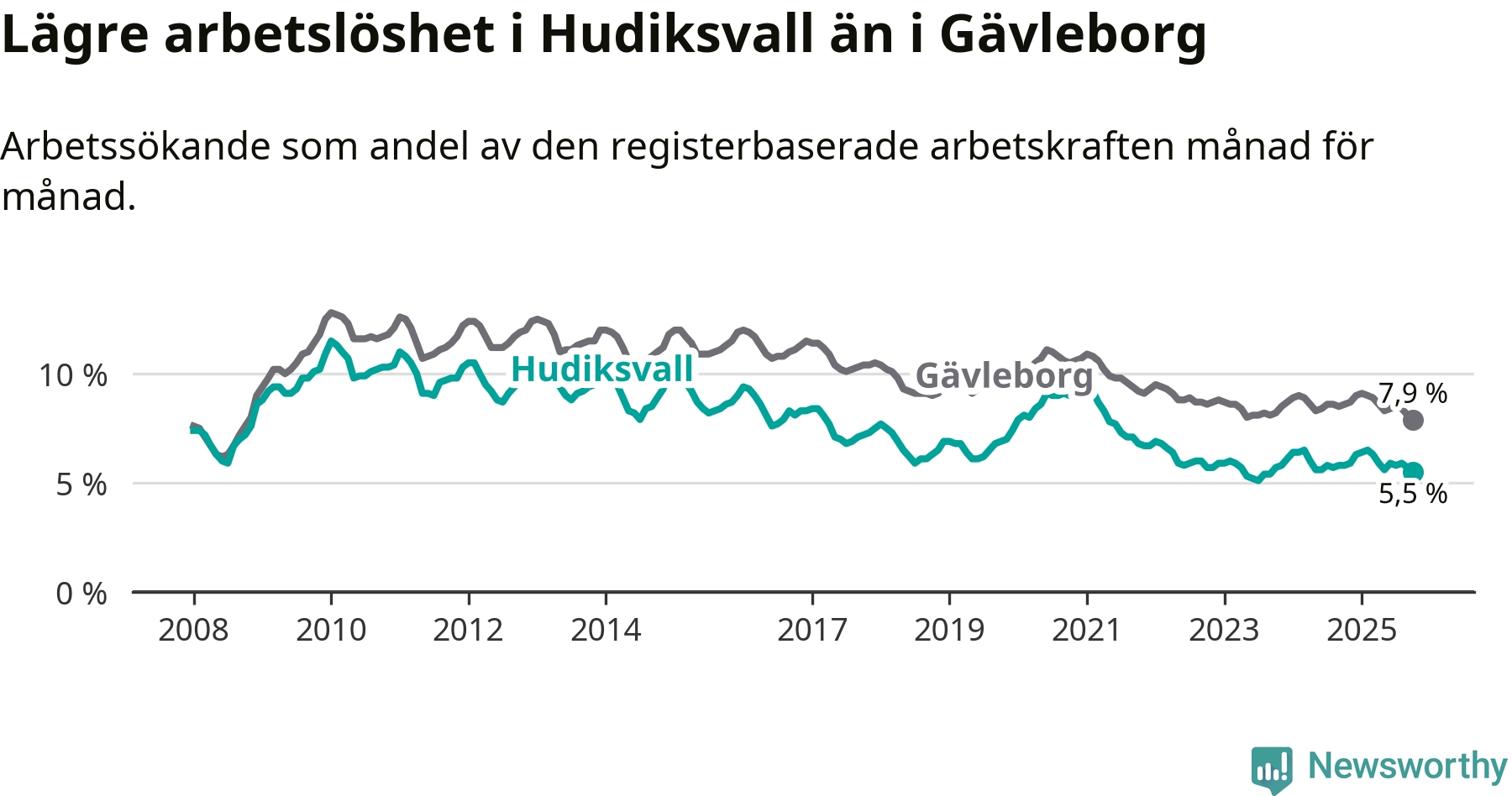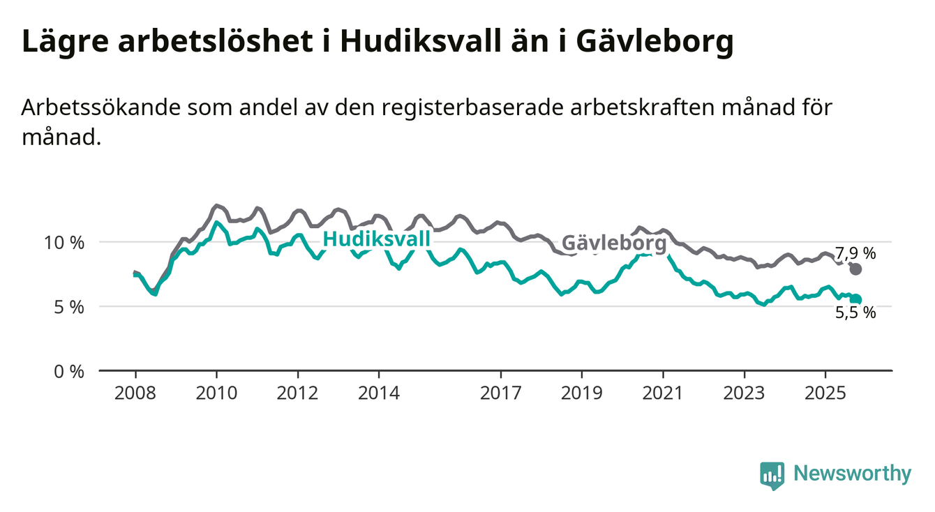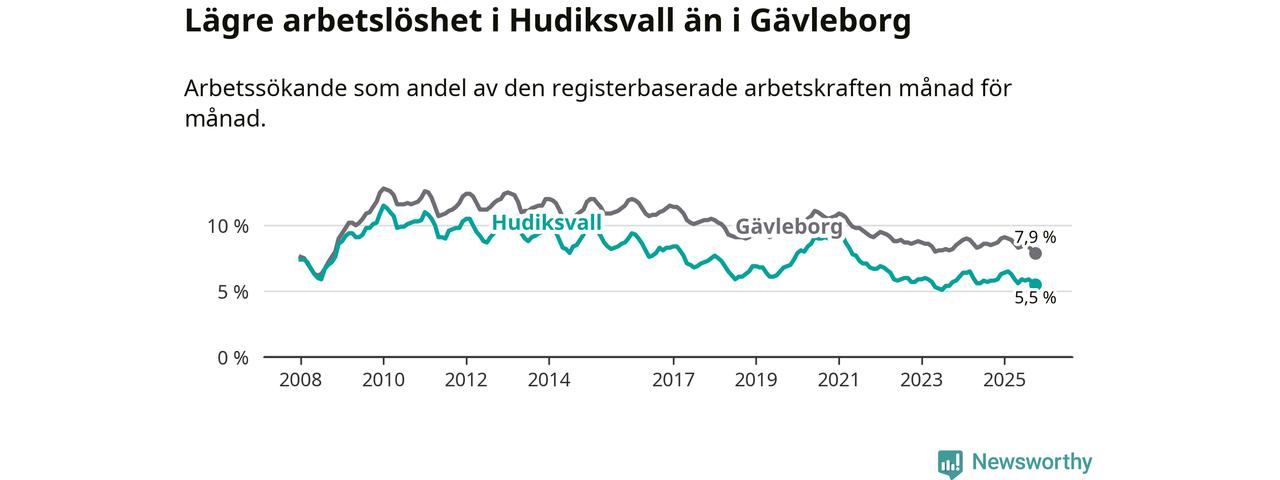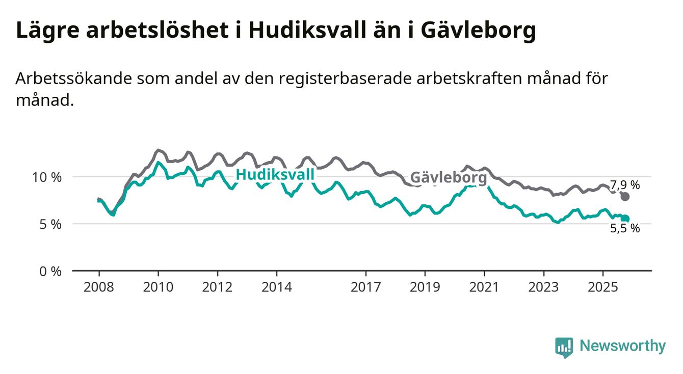Under oktober månad rapporterade Hudiksvalls kommun en total arbetslöshet på 5,5 procent. Det är en minskning jämfört med samma tidpunkt i fjol (−0,3 procentenheter). Även i Gävleborgs län sjunker arbetslösheten .