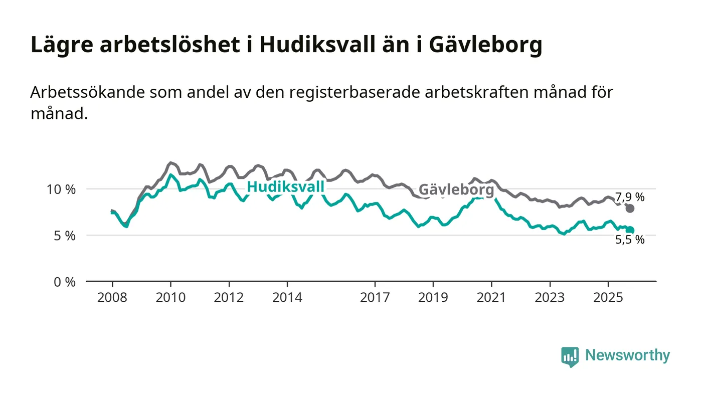 Hudiksvall hade redan tidigare lägre arbetslöshet än snittet i hela Gävleborgs län och nu växer klyftan (5,5 procent i kommunen, jämfört med 7,9 procent i hela länet). Hudiksvall har därmed även den lägsta arbetslöshetsnivån i länet. Söderhamn har den högsta (9,0 procent).