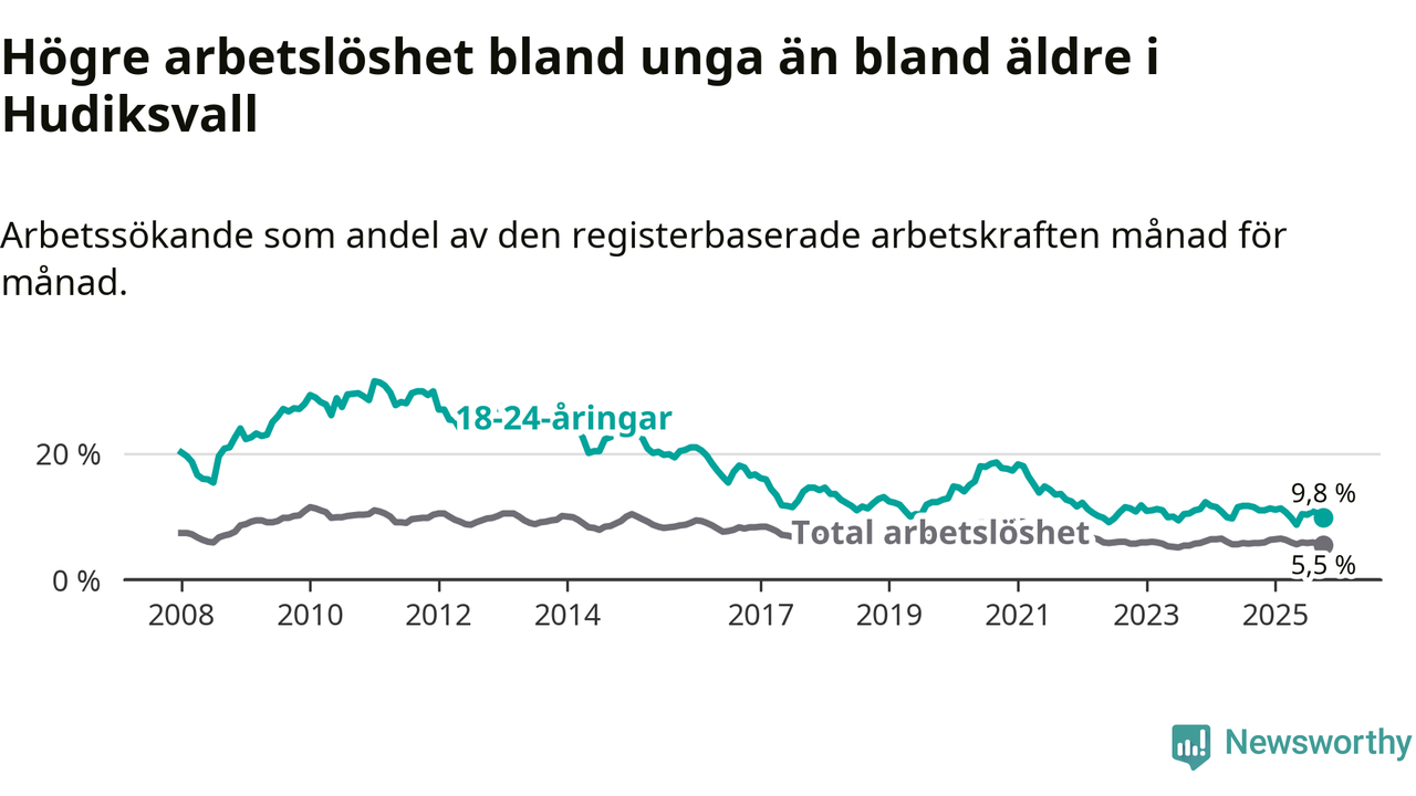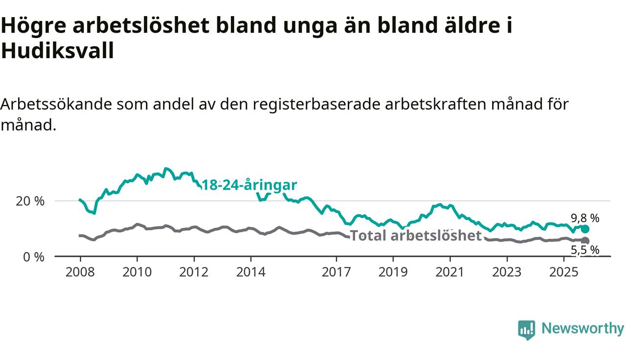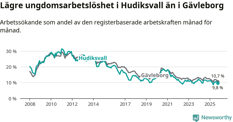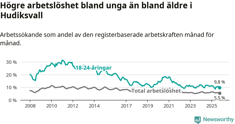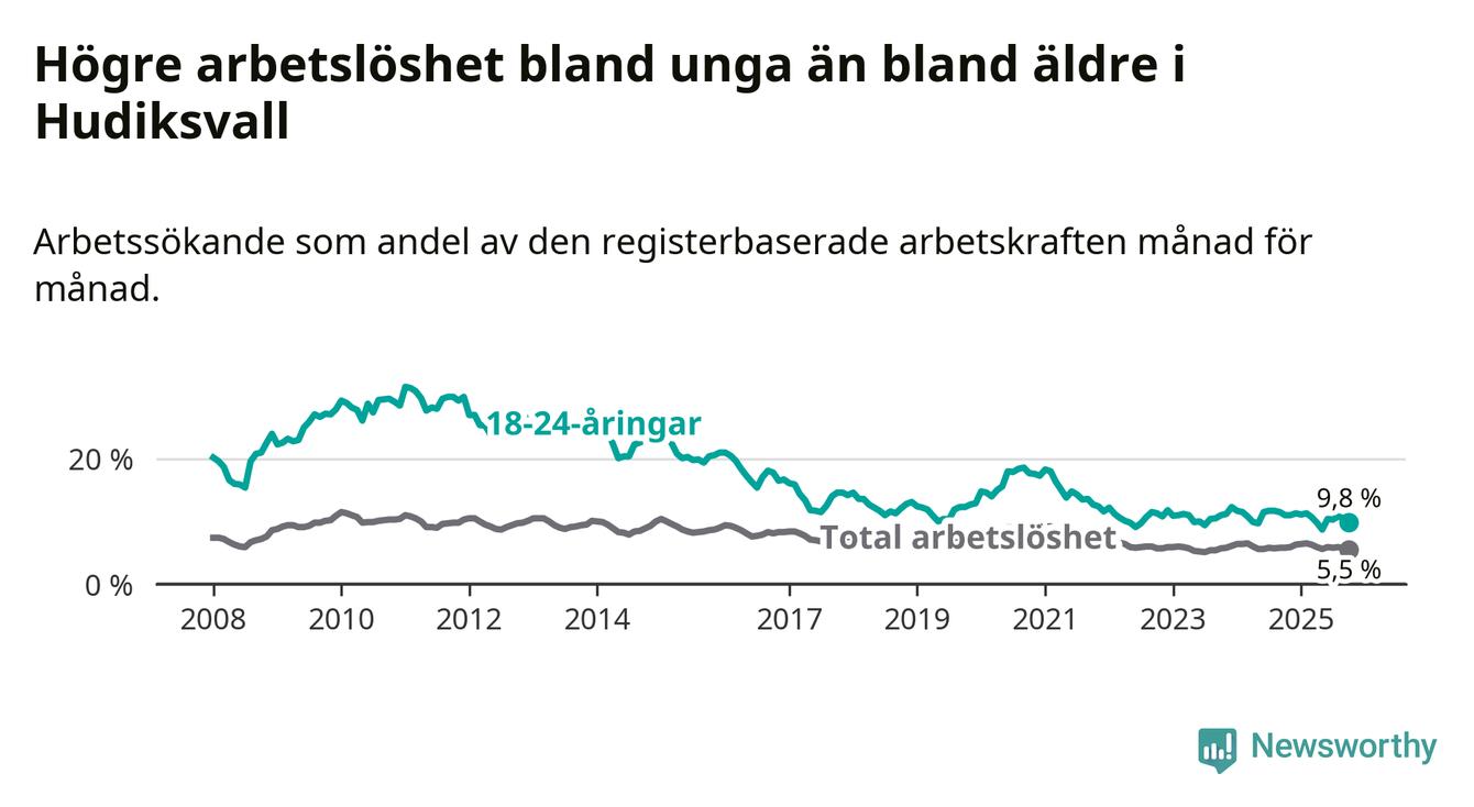 I och med den senaste månadens nedgång har de ungas arbetslöshet i Hudiksvall sjunkit tolv månader i följd (ner från 11,0 procent i oktober 2024 till 9,8 procent nu).