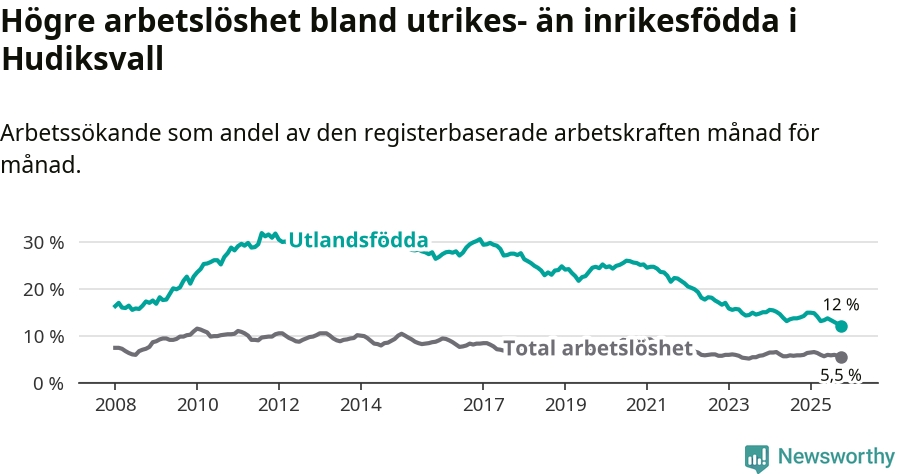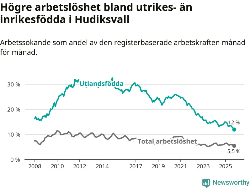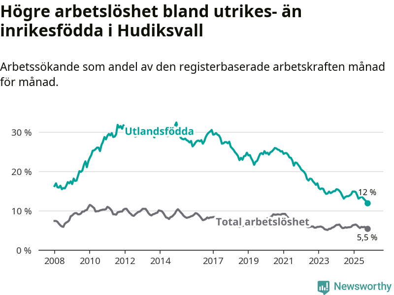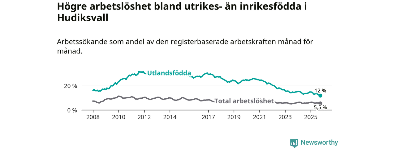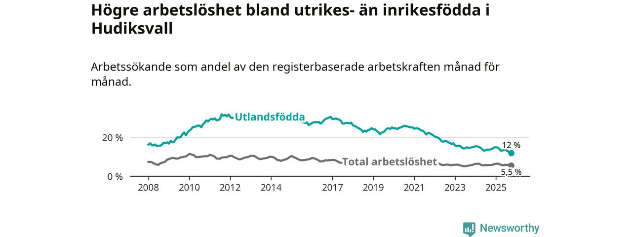 Arbetslösheten bland utlandsfödda var 12,0 procent i Hudiksvall under oktober månad, motsvarande 276 av 2 300 personer. Det är 1,9 procentenheter färre än vid samma tidpunkt i fjol (−43 om man räknar personer). Den nuvarande arbetslöshetsnivån är den lägsta sedan januari 2008.