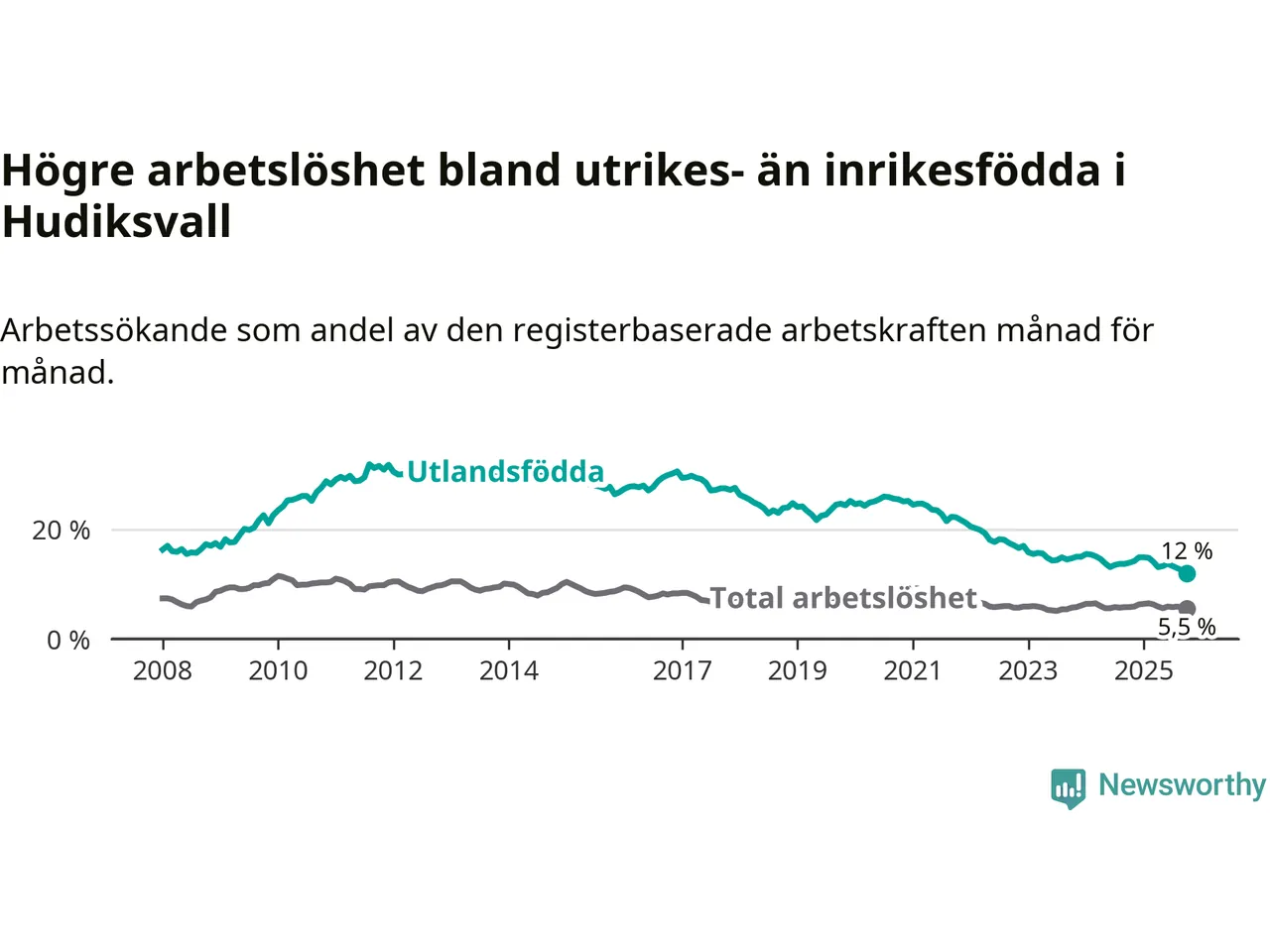 Skillnaden i arbetslöshet mellan utrikesfödda och hela befolkningen är 6,5 procentenheter i Hudiksvall. Det är en betydligt mindre skillnad än för ett år sedan (−1,6 procentenheter).