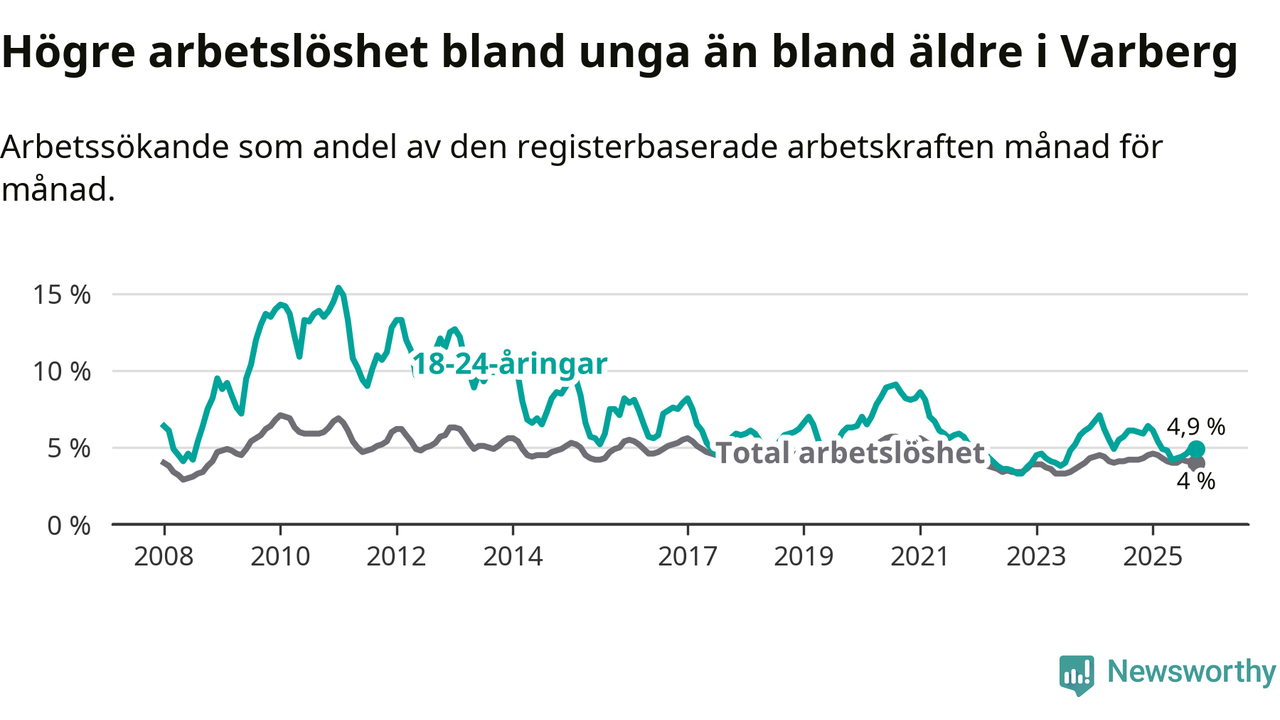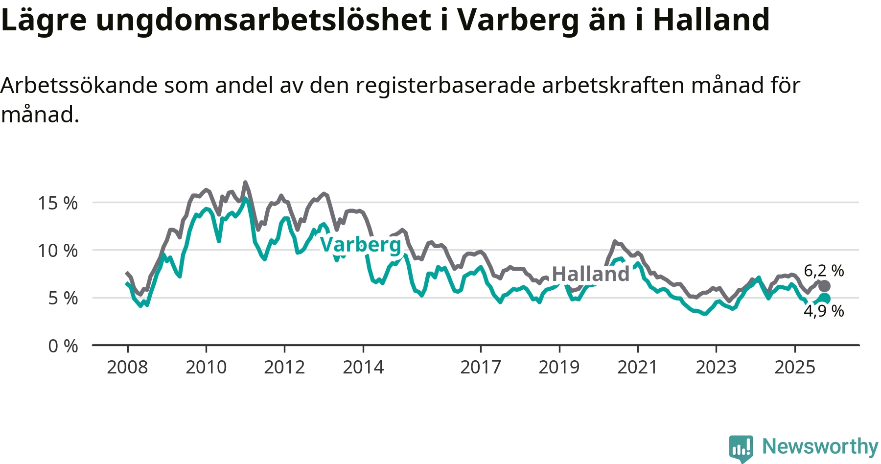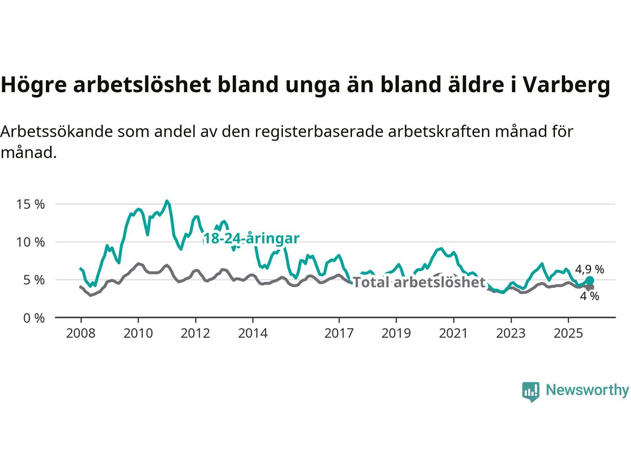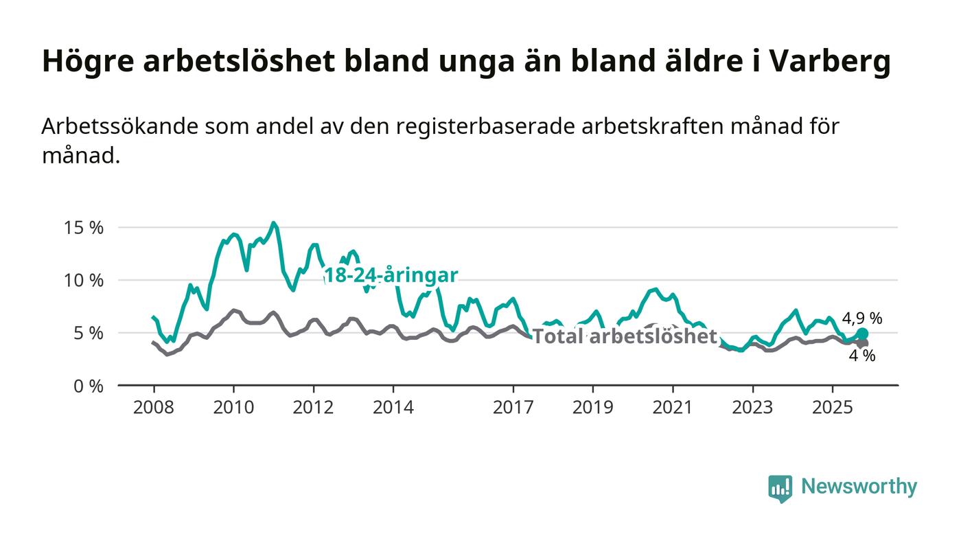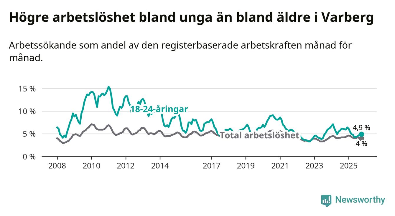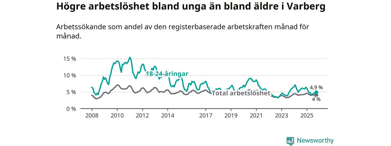 I och med den senaste månadens nedgång har de ungas arbetslöshet i Varberg sjunkit tio månader i följd (ner från 6,4 procent i december 2024 till 4,9 procent nu).