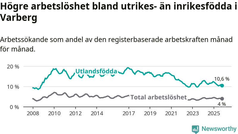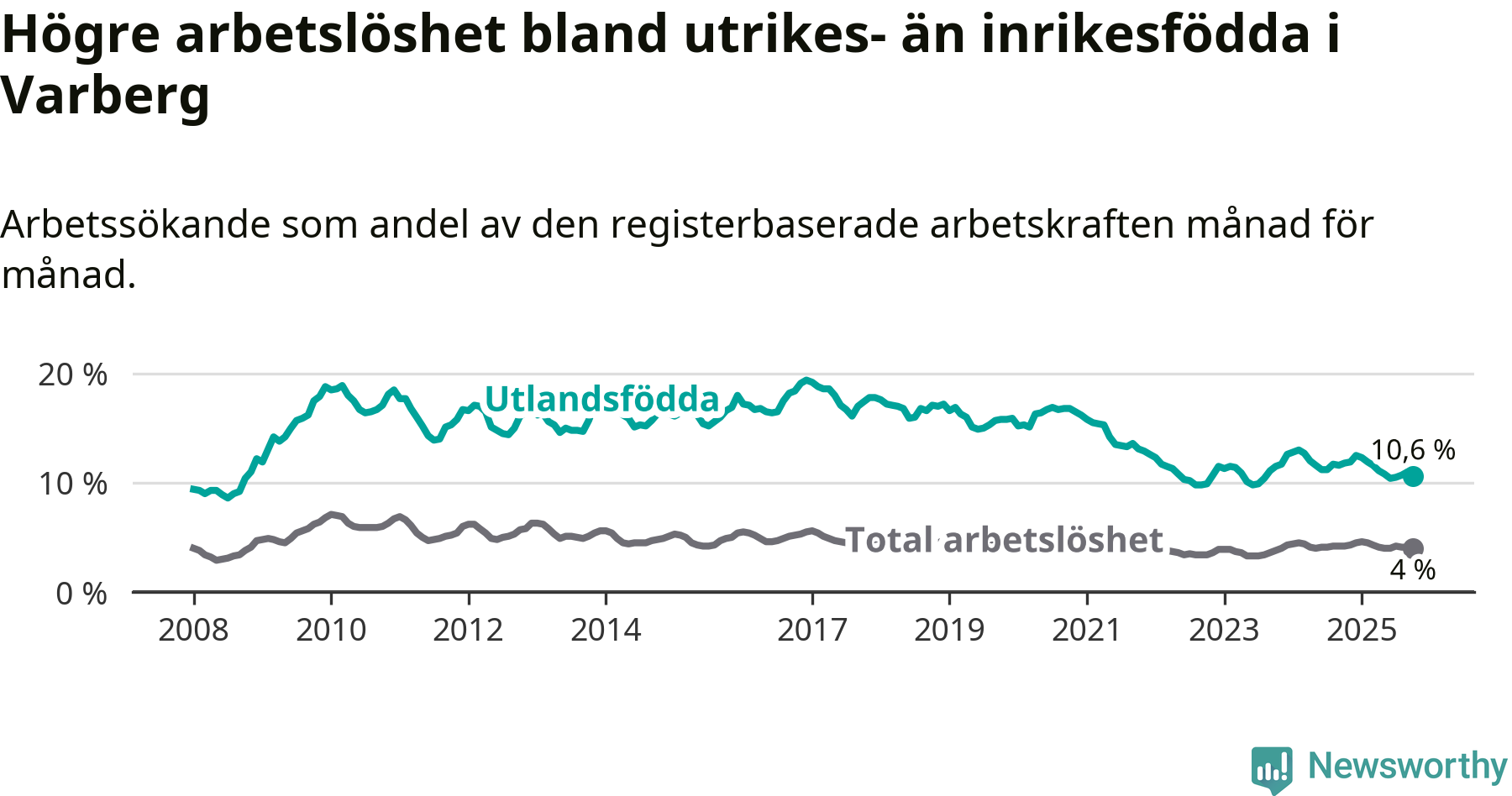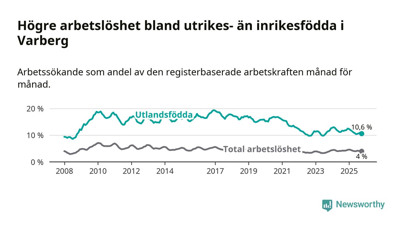 Arbetslösheten bland utlandsfödda var 10,6 procent i Varberg under oktober månad, motsvarande 516 av 4 868 personer. Det är 1,2 procentenheter färre än vid samma tidpunkt i fjol (−58 om man räknar personer). Därmed är de utlandsföddas arbetslöshet lägre än vid samma tidpunkt i fjol för elfte månaden i följd. Sedan november 2024 har arbetslösheten bland utlandsfödda minskat från 11,9 till 10,6 procent.