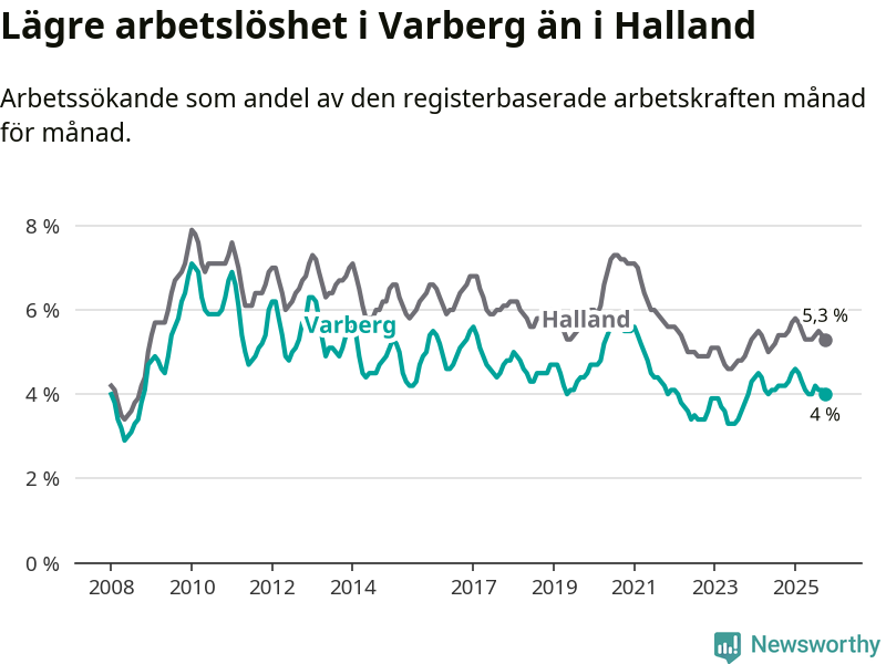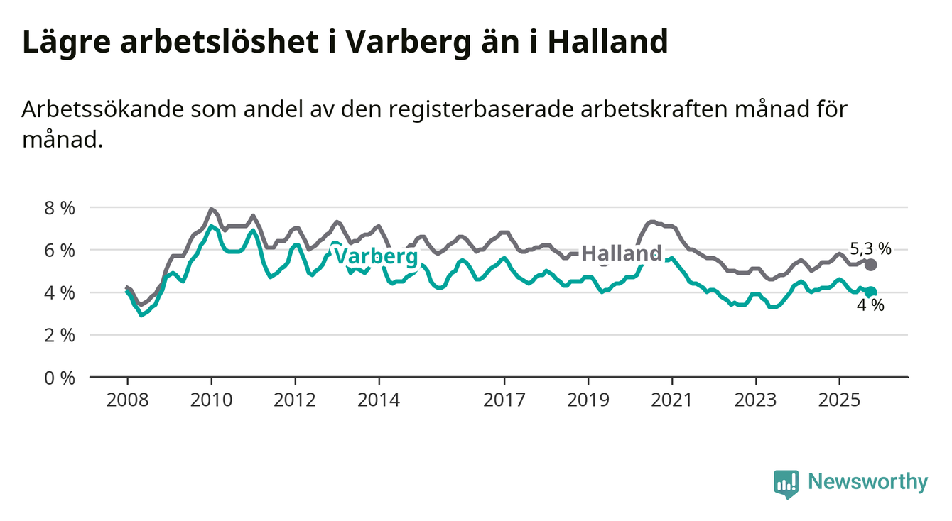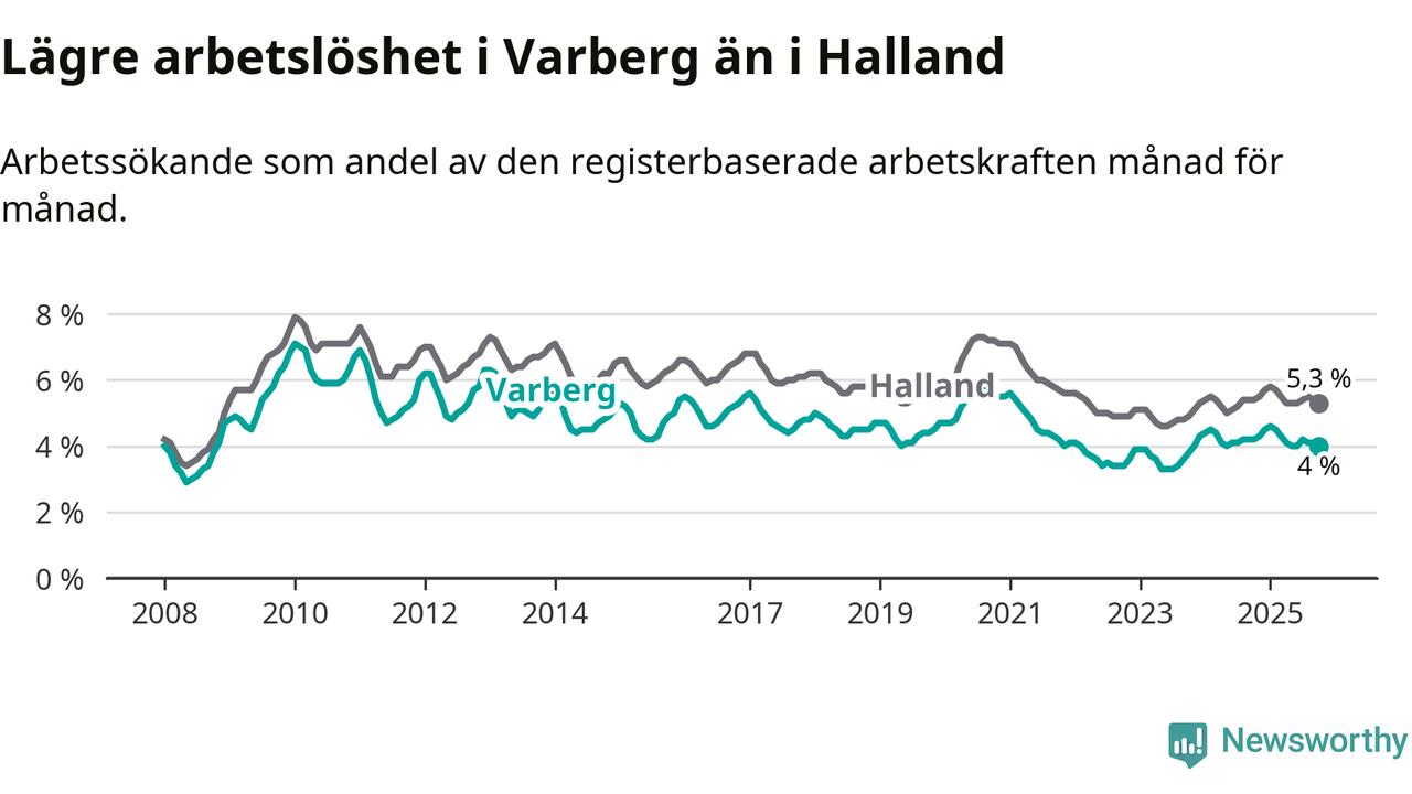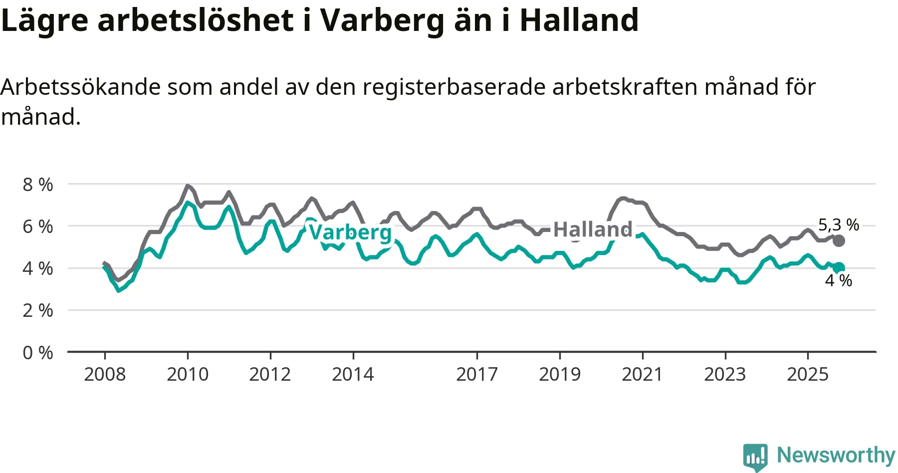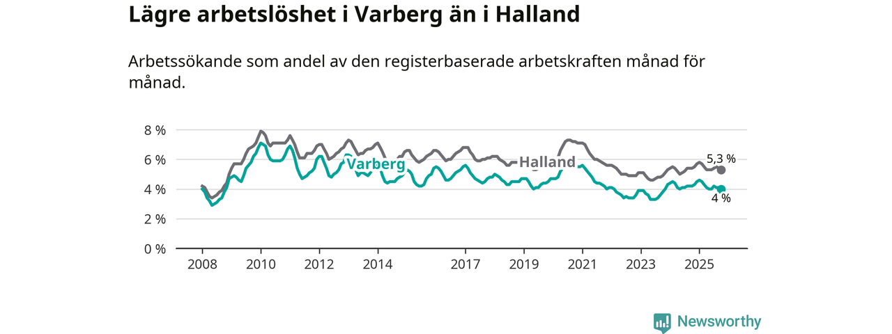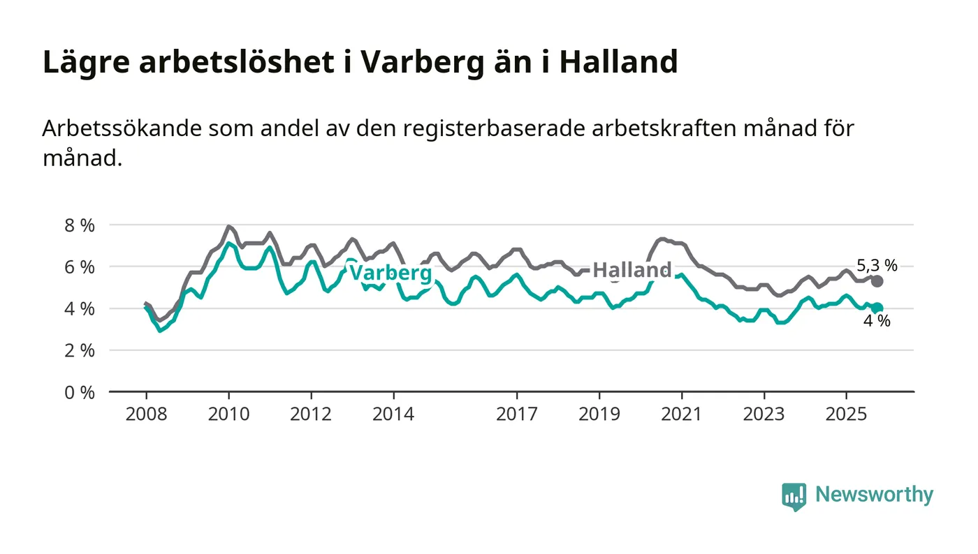 Under oktober månad rapporterade Varbergs kommun en total arbetslöshet på 4,0 procent. Det är en minskning jämfört med samma tidpunkt i fjol (−0,2 procentenheter). Även i Hallands län sjunker arbetslösheten något.
