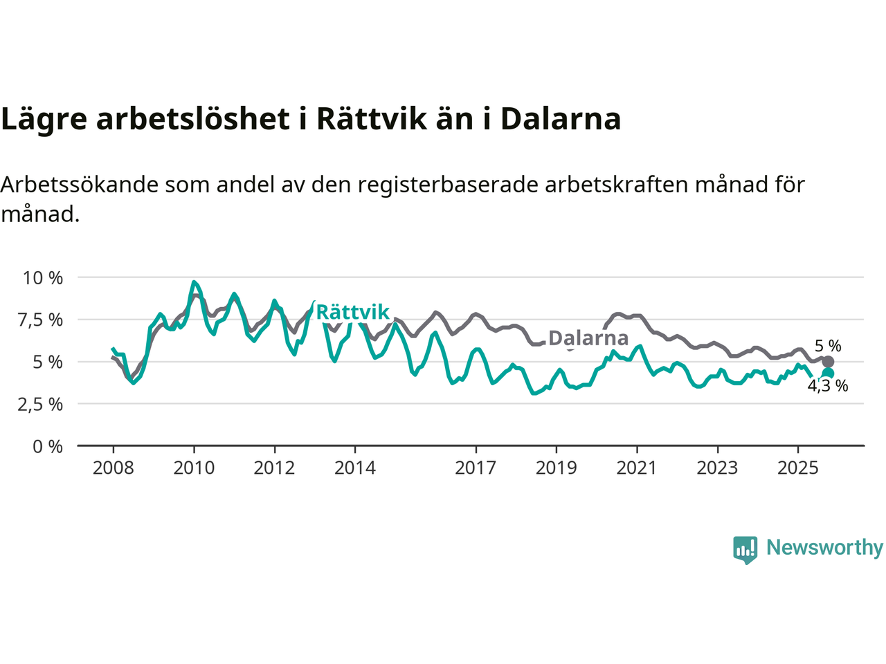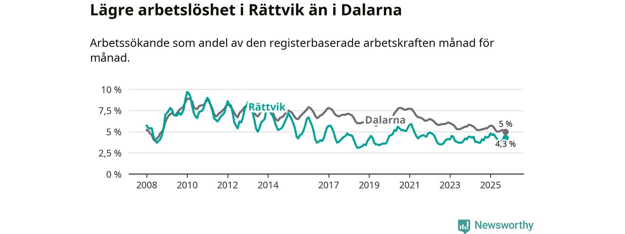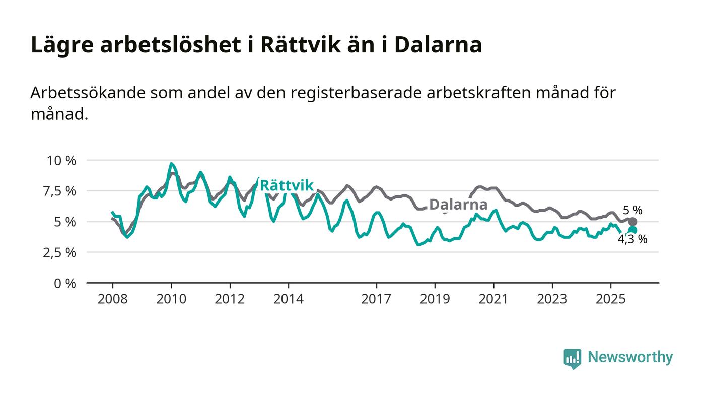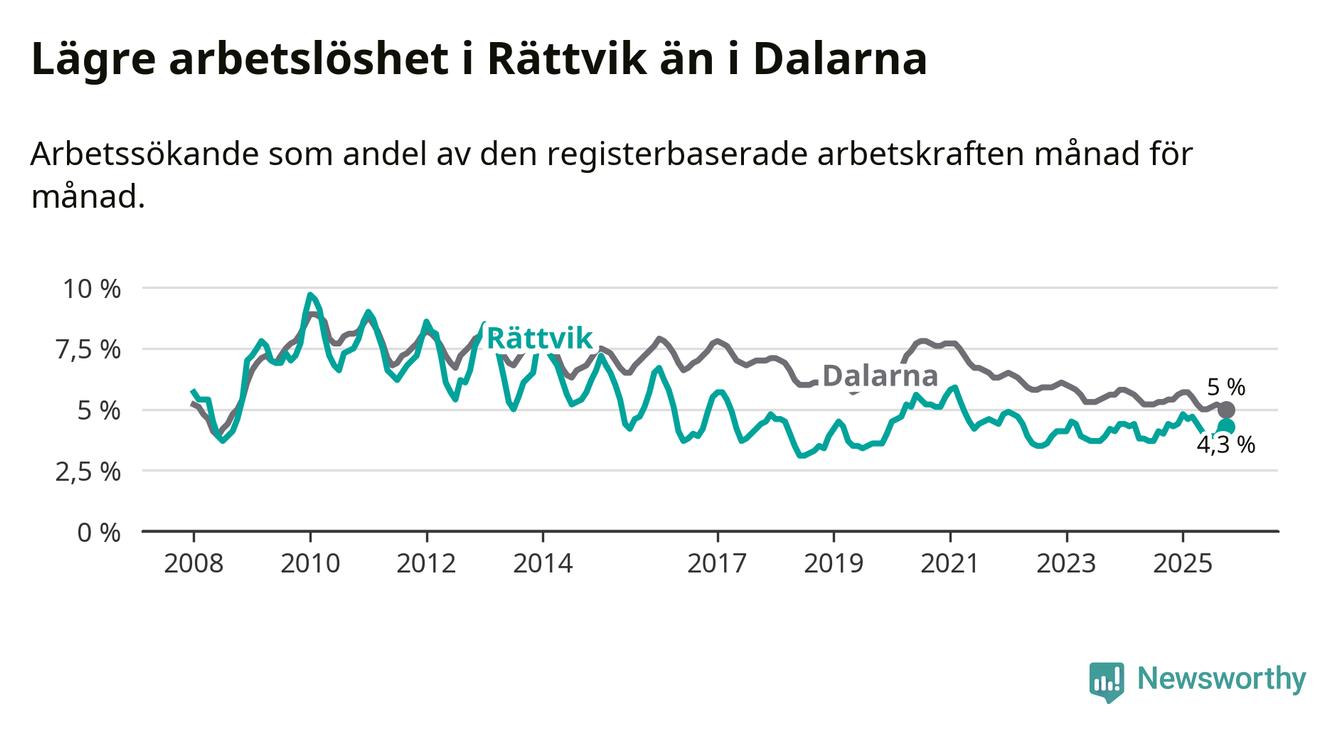 Under oktober månad rapporterade Rättviks kommun en total arbetslöshet på 4,3 procent. Det är en minskning jämfört med samma tidpunkt i fjol (−0,1 procentenheter). Även i Dalarnas län sjunker arbetslösheten .