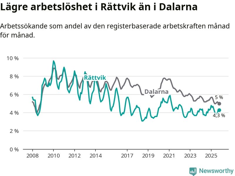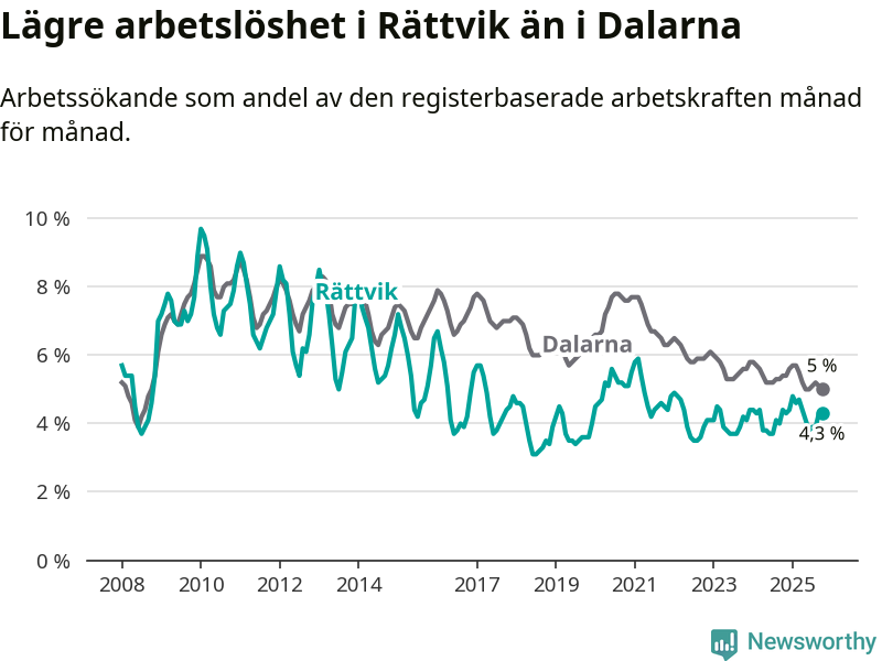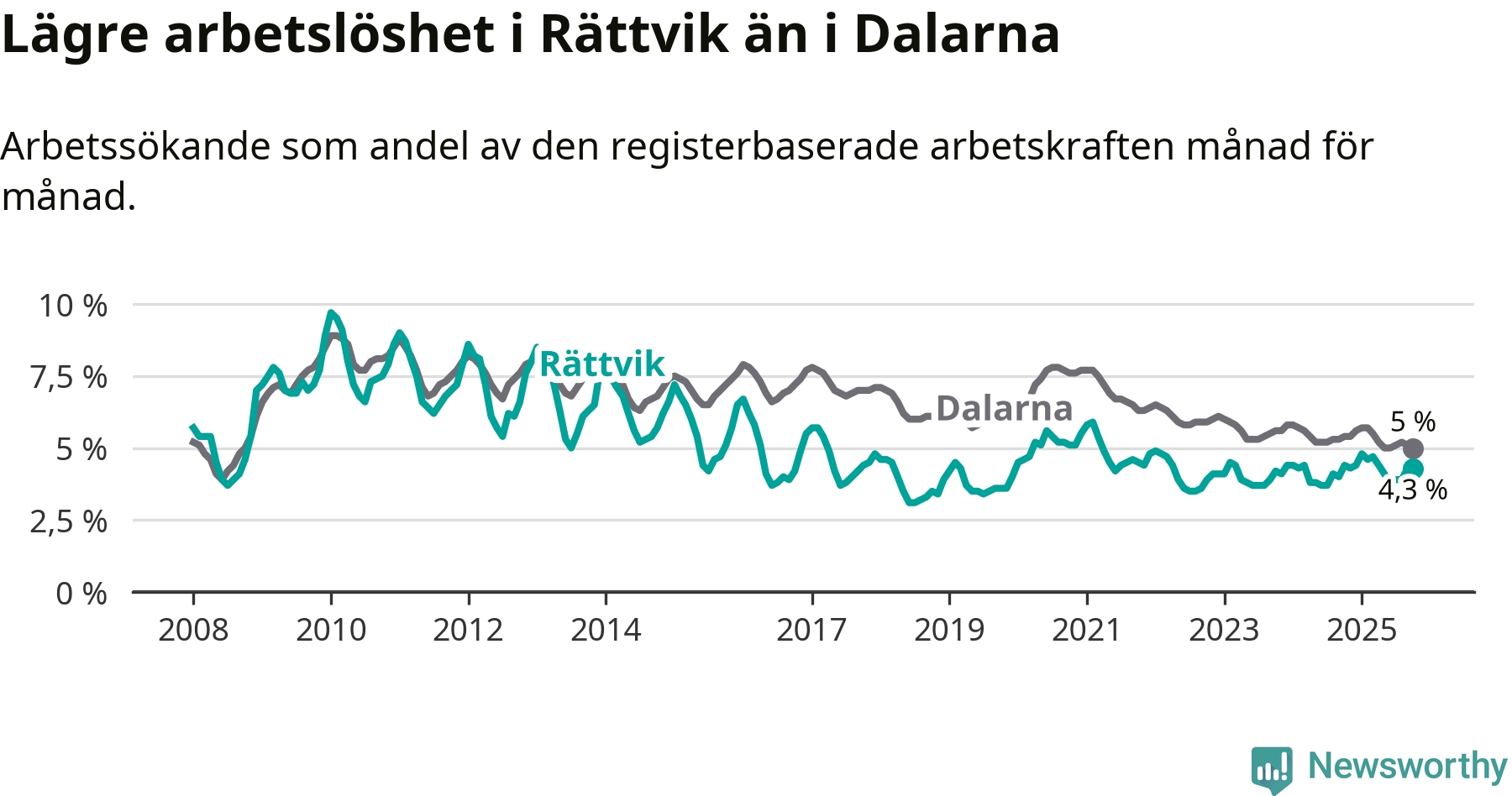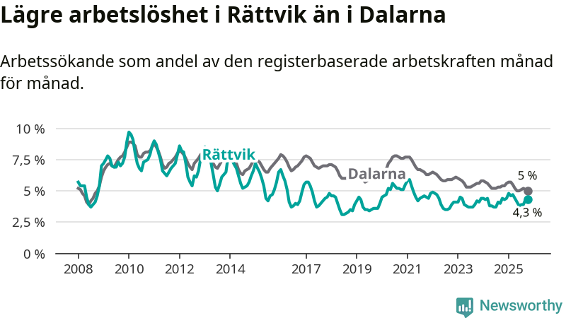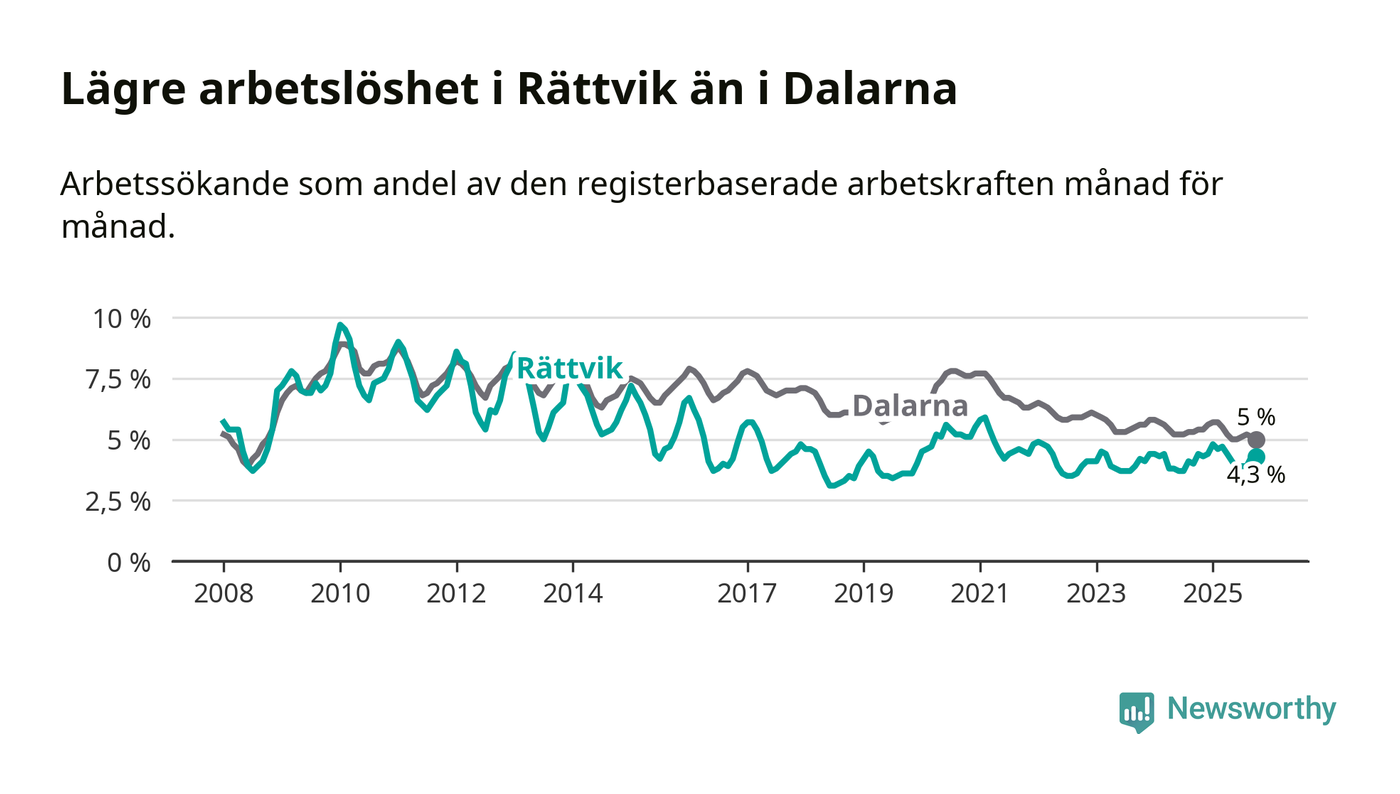 Under oktober månad rapporterade Rättviks kommun en total arbetslöshet på 4,3 procent. Det är en minskning jämfört med samma tidpunkt i fjol (−0,1 procentenheter). Även i Dalarnas län sjunker arbetslösheten .