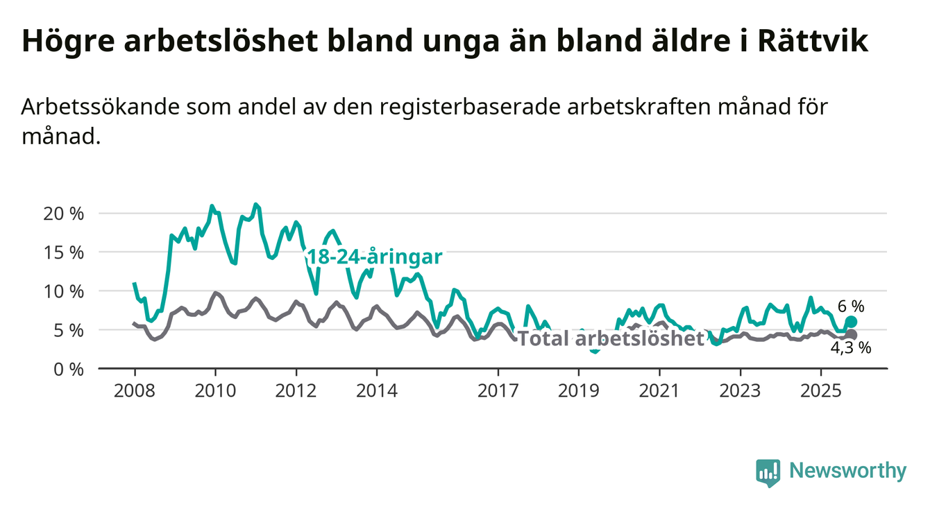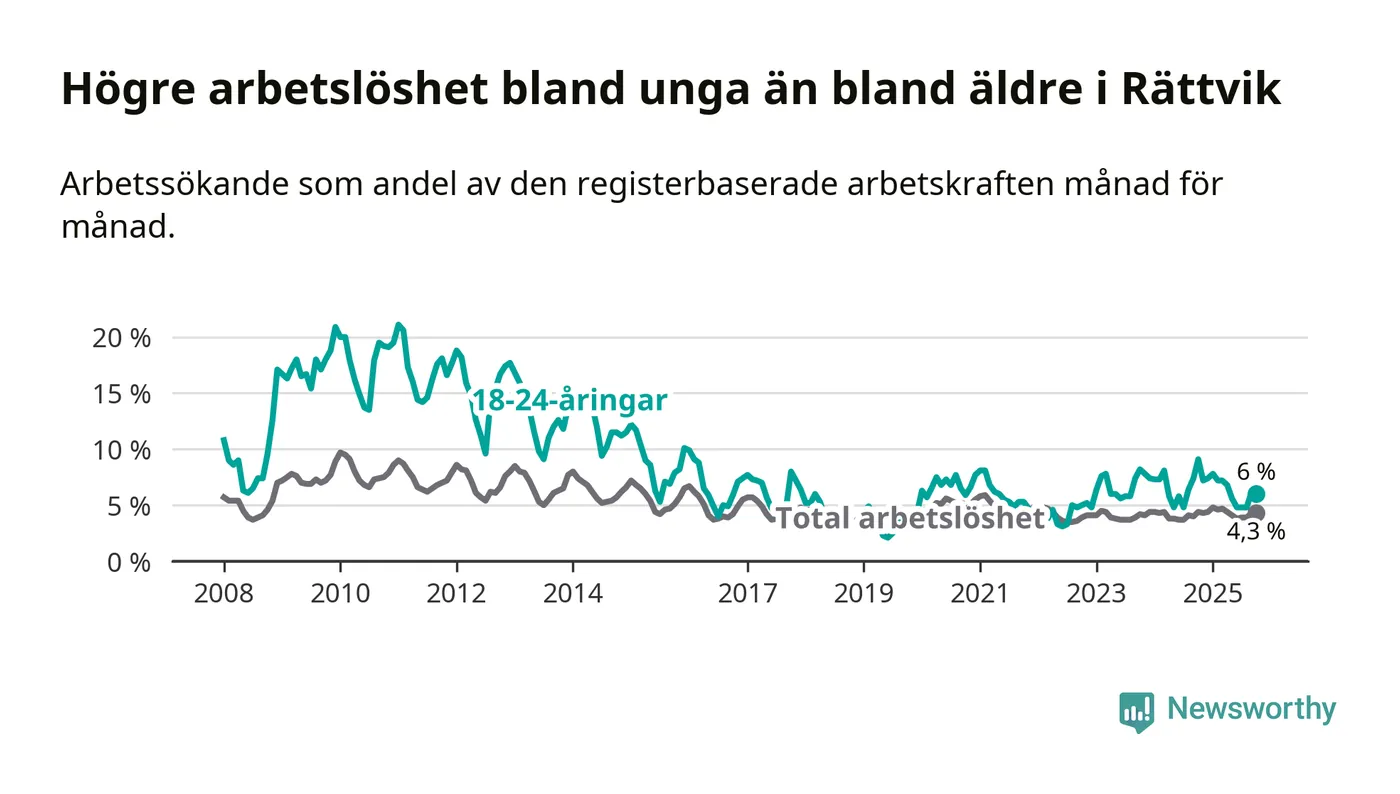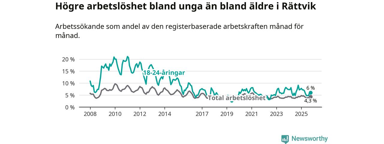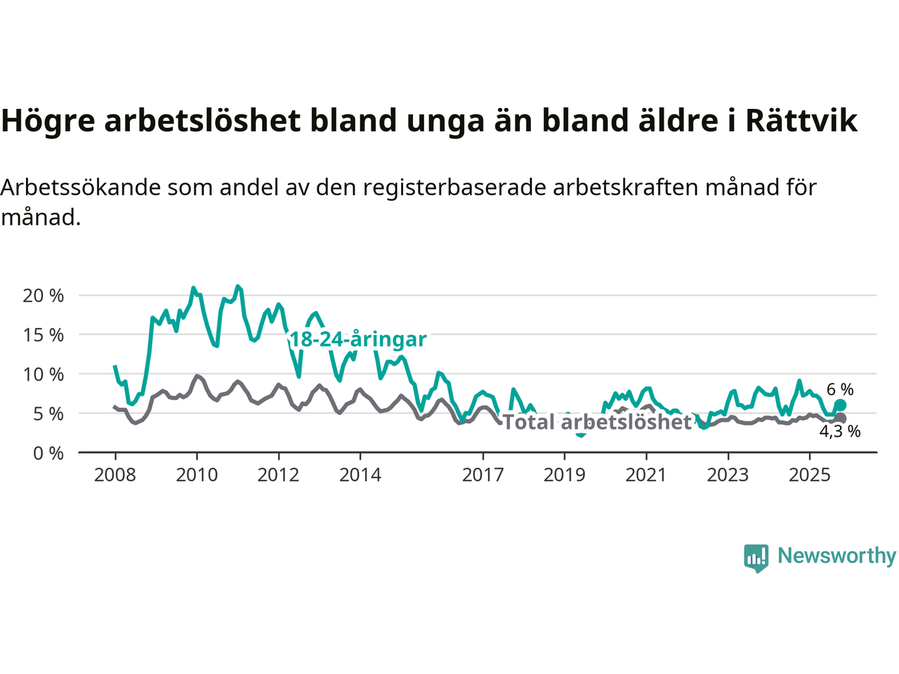 Precis som den totala arbetslösheten sjunker arbetslösheten bland unga (−3,1 procentenheter). I oktober var 6,0 procent av 18–24-åringarna inskrivna som arbetssökande (motsvarande 30 personer). Mäter vi antalet inskrivna ser vi en minskning med 16 personer på ett års sikt.