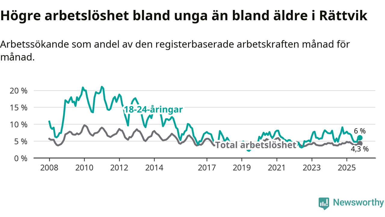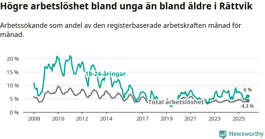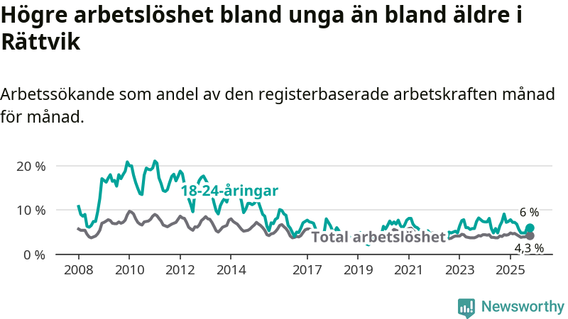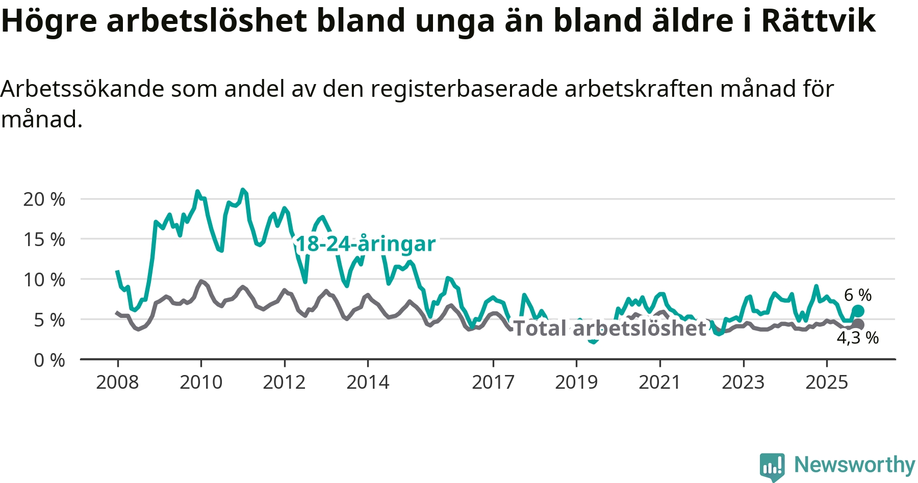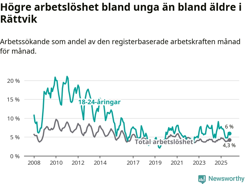 Precis som den totala arbetslösheten sjunker arbetslösheten bland unga (−3,1 procentenheter). I oktober var 6,0 procent av 18–24-åringarna inskrivna som arbetssökande (motsvarande 30 personer). Mäter vi antalet inskrivna ser vi en minskning med 16 personer på ett års sikt.