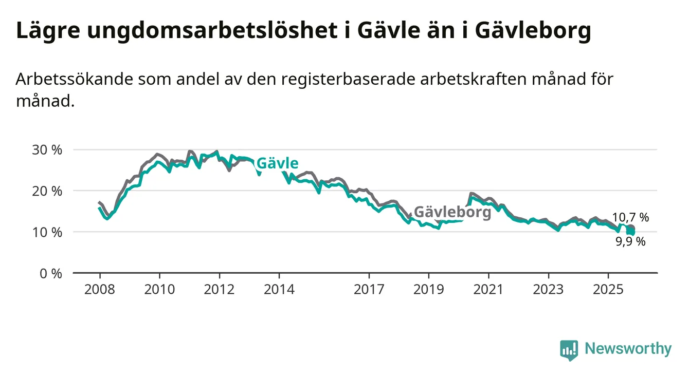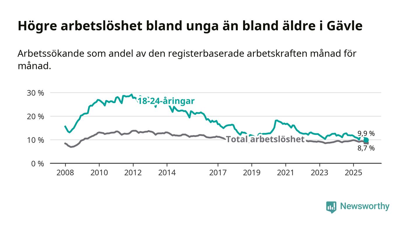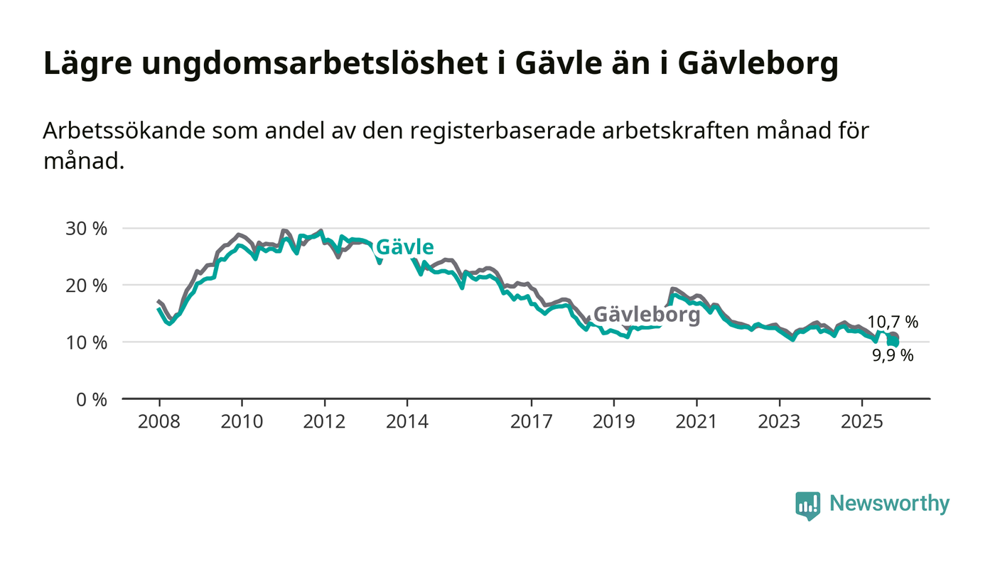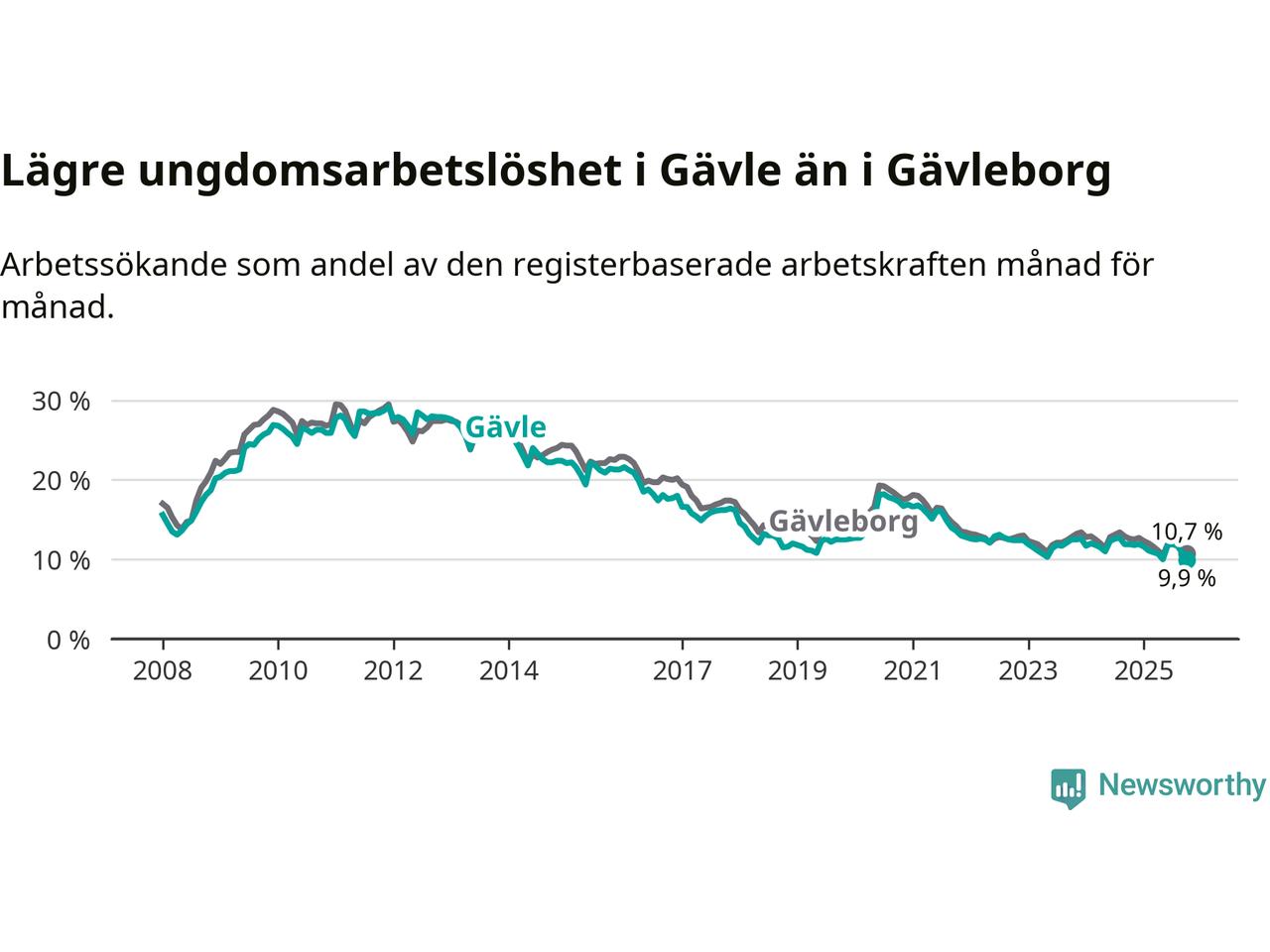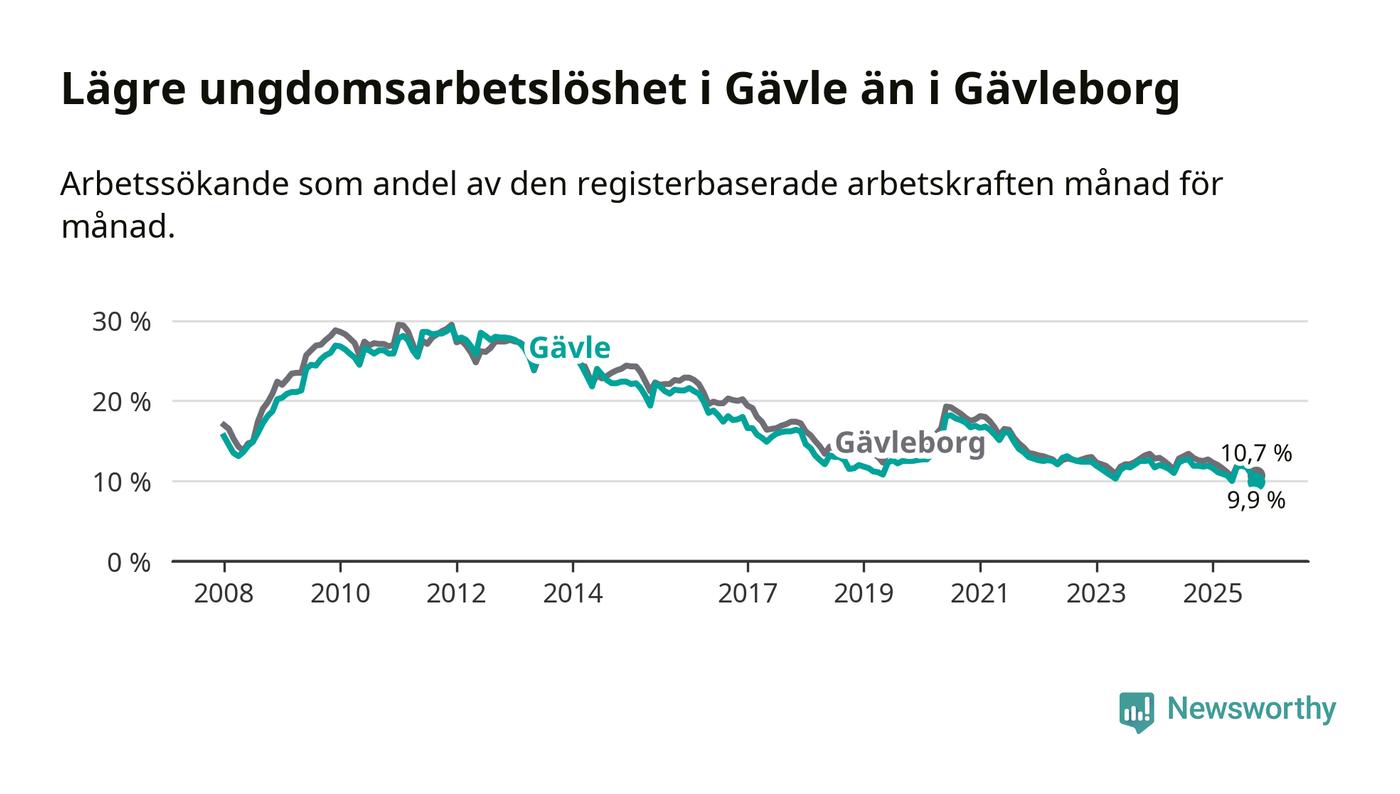 Medan Gävle har högre total arbetslöshet än Gävleborg, ligger ungdomsarbetslösheten 0,8 procentenheter lägre i Gävle.
