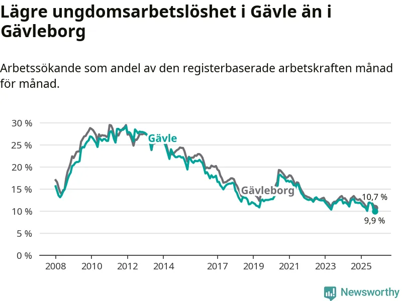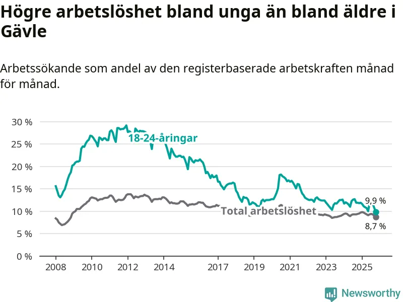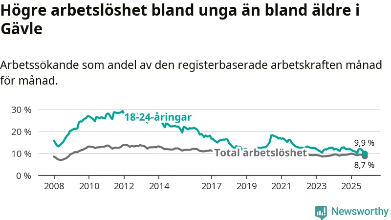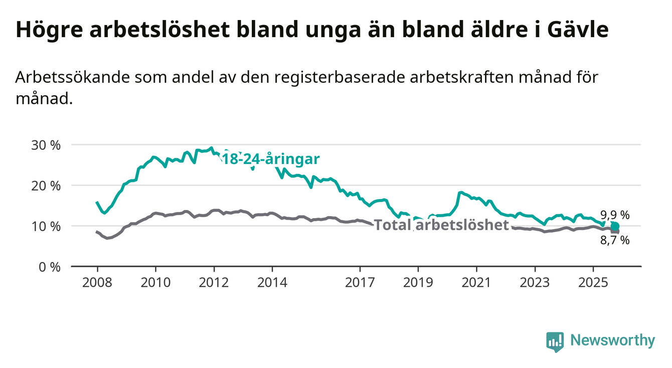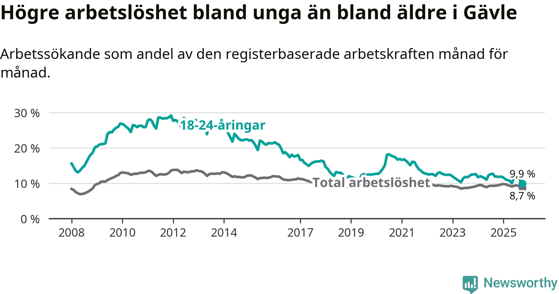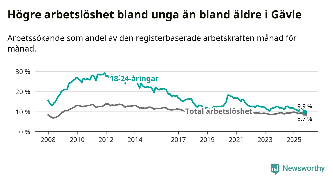 Medan Gävle har högre total arbetslöshet än Gävleborg, ligger ungdomsarbetslösheten 0,8 procentenheter lägre i Gävle.