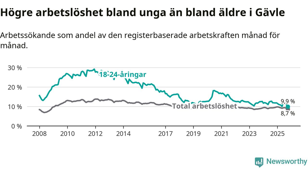 I och med den senaste månadens nedgång har de ungas arbetslöshet i Gävle sjunkit 14 månader i följd (ner från 12,7 procent i augusti 2024 till 9,9 procent nu). Den nuvarande arbetslöshetsnivån är den lägsta sedan januari 2008.