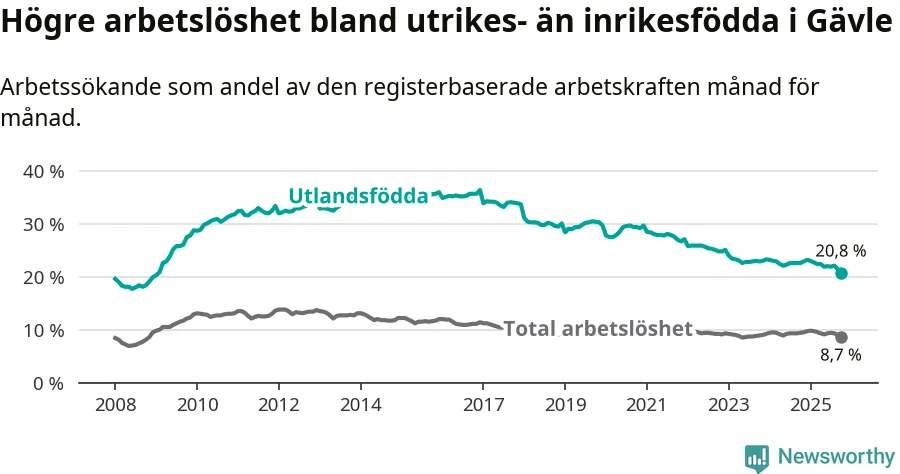 Skillnaden i arbetslöshet mellan utrikesfödda och hela befolkningen är 12,1 procentenheter i Gävle. Det är en mindre skillnad än för ett år sedan (−1,1 procentenheter).