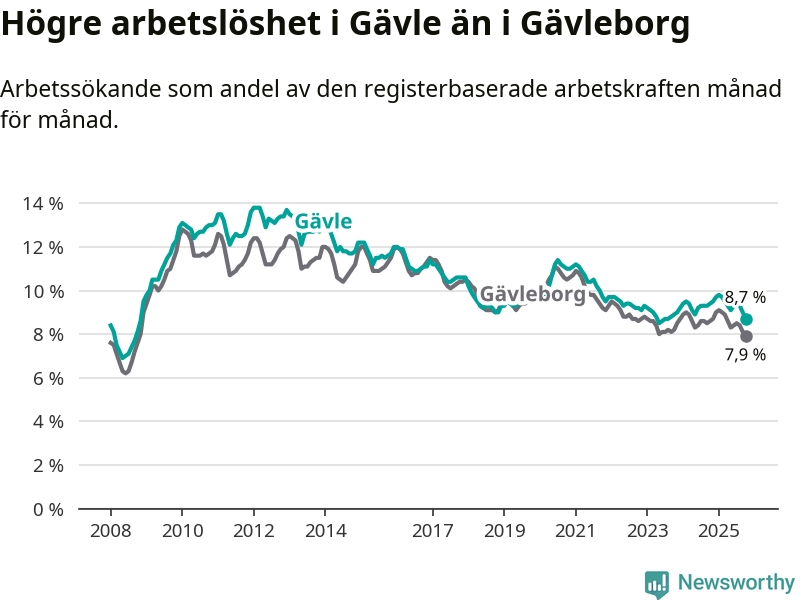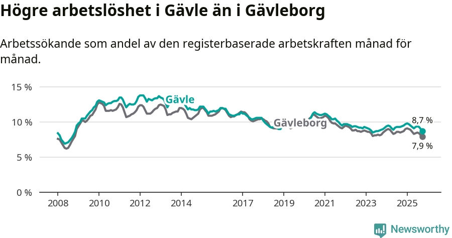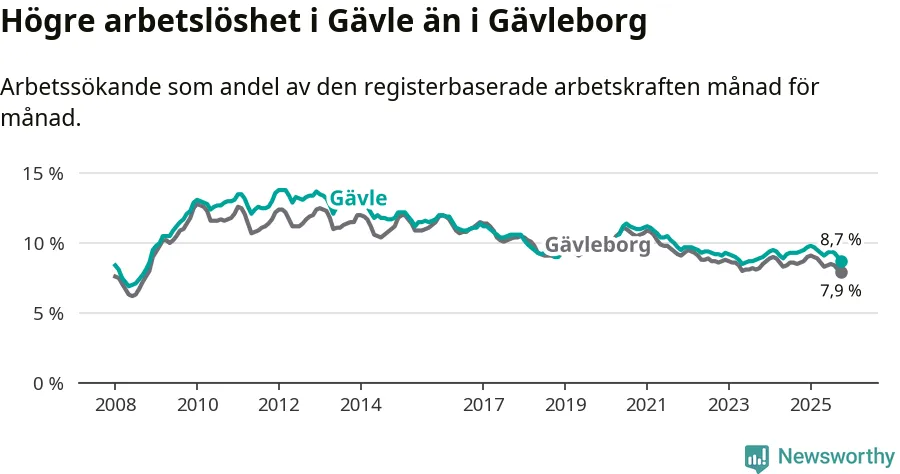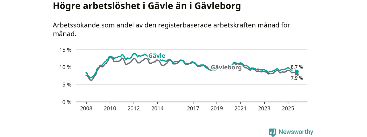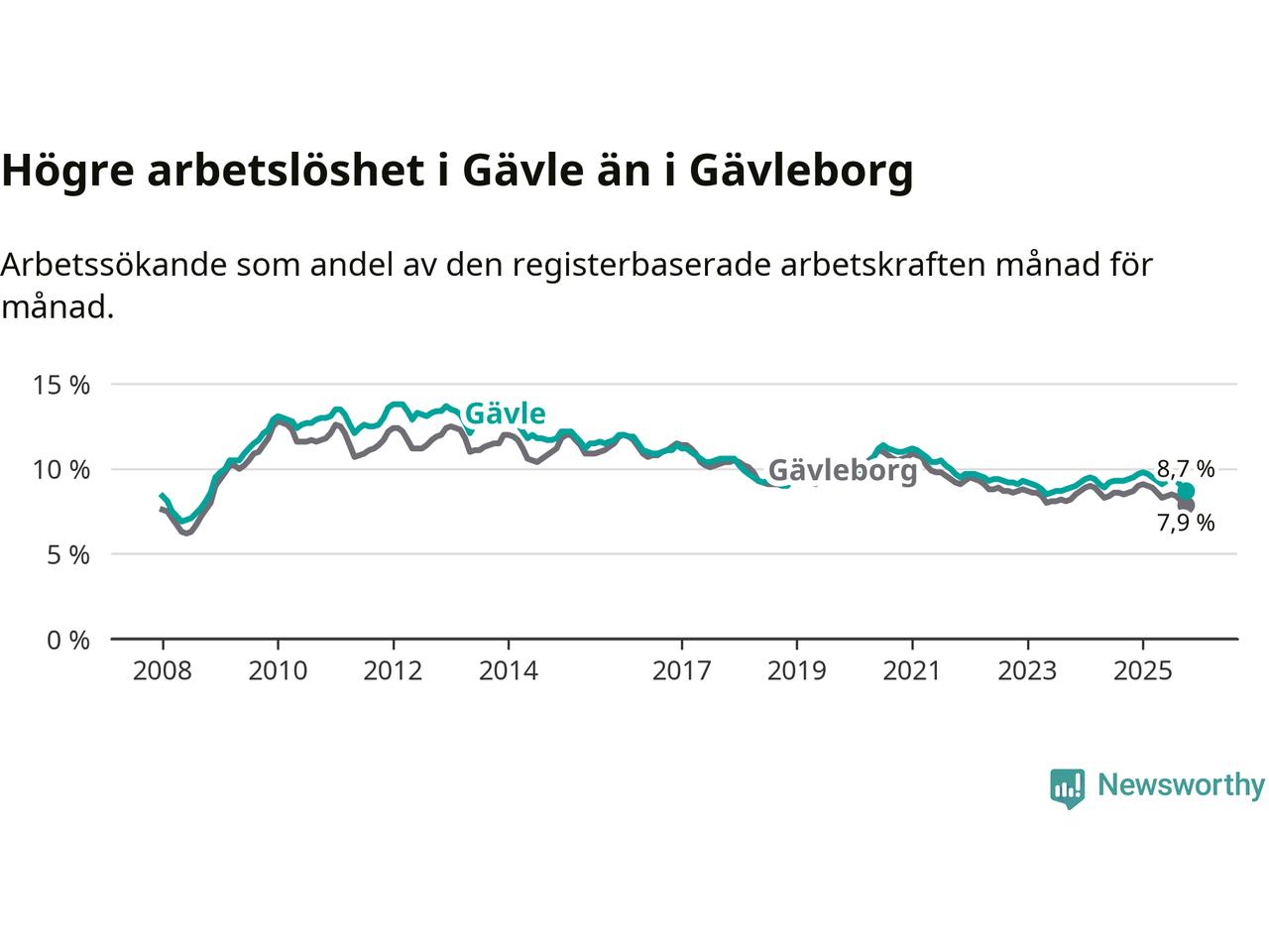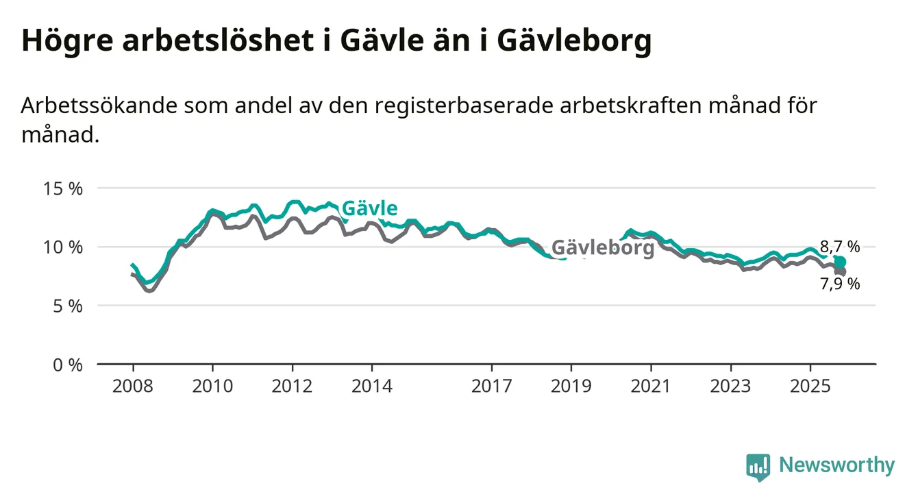 Även om arbetslösheten i Gävle alltså minskar, så ligger den fortfarande över snittet i hela Gävleborgs län (8,7 procent i kommunen, jämfört med 7,9 procent i hela länet). Hudiksvall har den lägsta arbetslösheten i länet (5,5 procent), medan Söderhamn har den högsta (9,0 procent). För att Gävle skulle komma ner i samma arbetslöshetsnivå som Hudiksvall skulle 1 692 personer behöva sysselsättas.