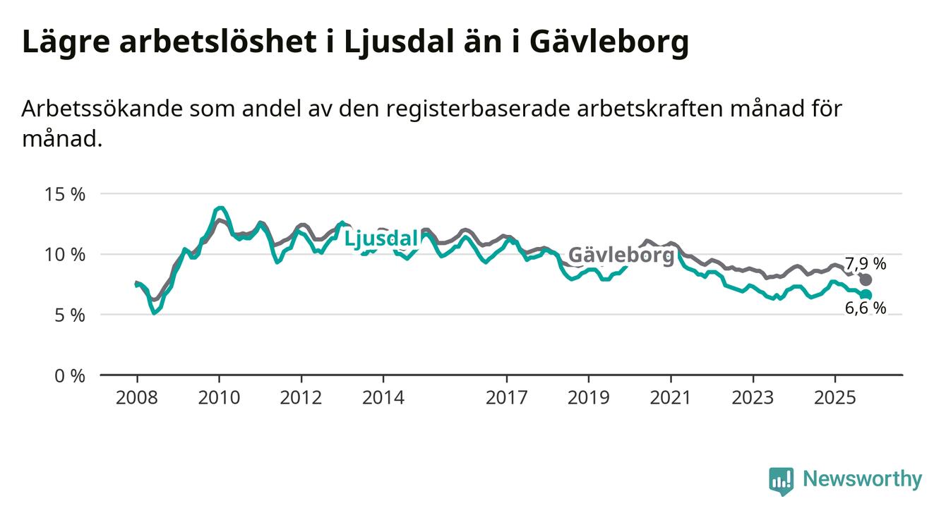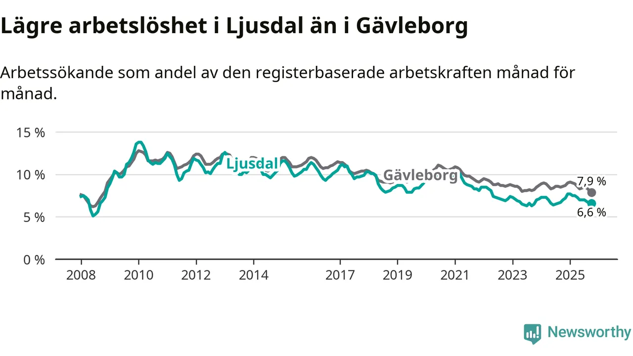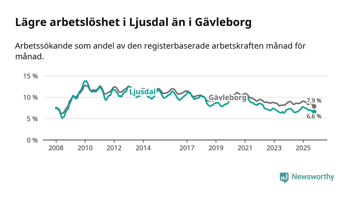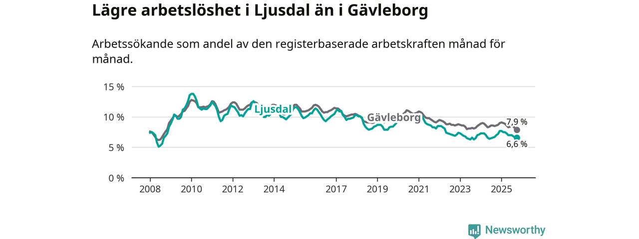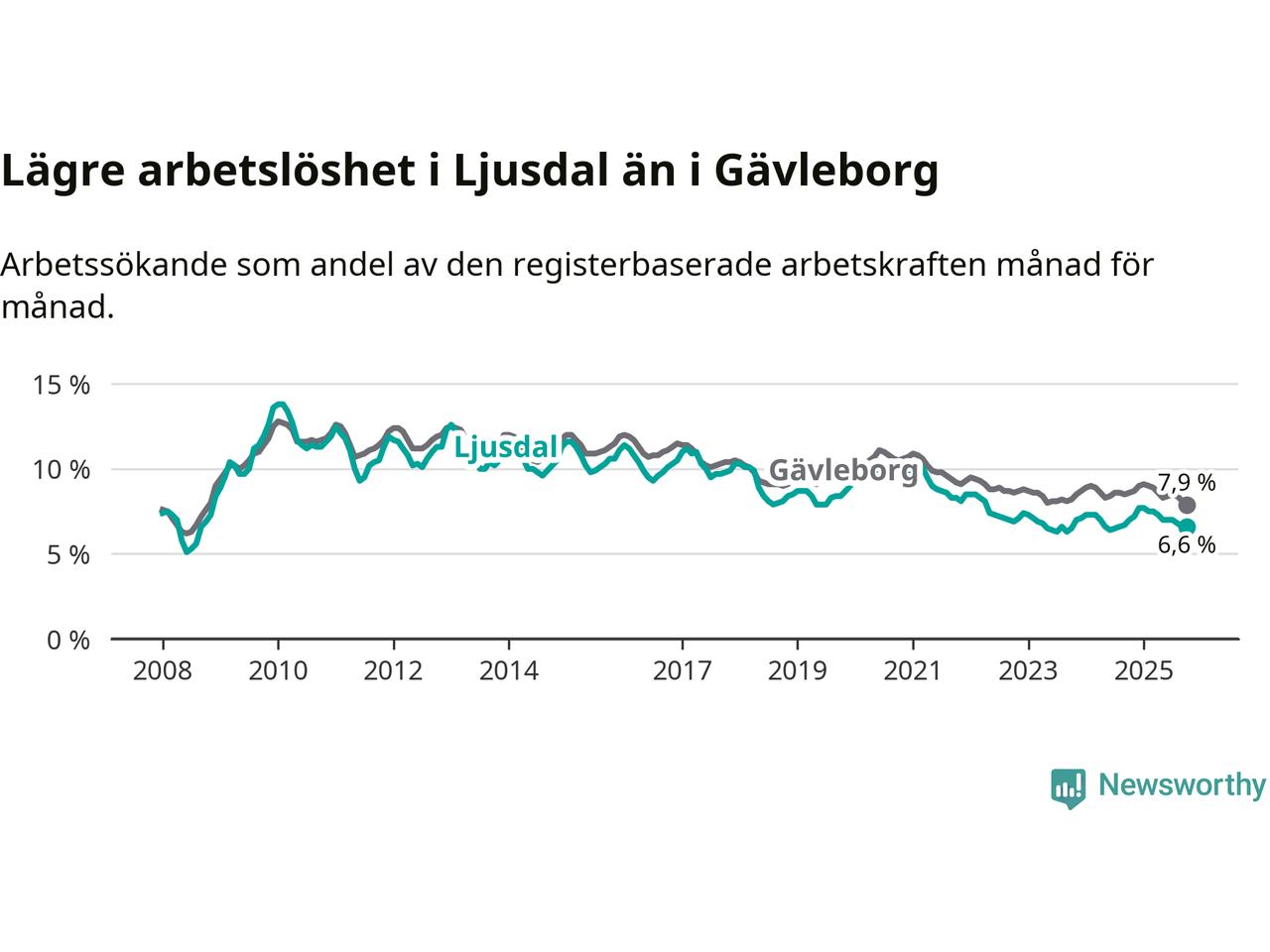 Under oktober månad rapporterade Ljusdals kommun en total arbetslöshet på 6,6 procent. Det är en minskning jämfört med samma tidpunkt i fjol (−0,4 procentenheter). Även i Gävleborgs län sjunker arbetslösheten .