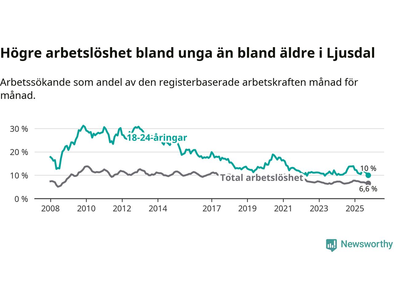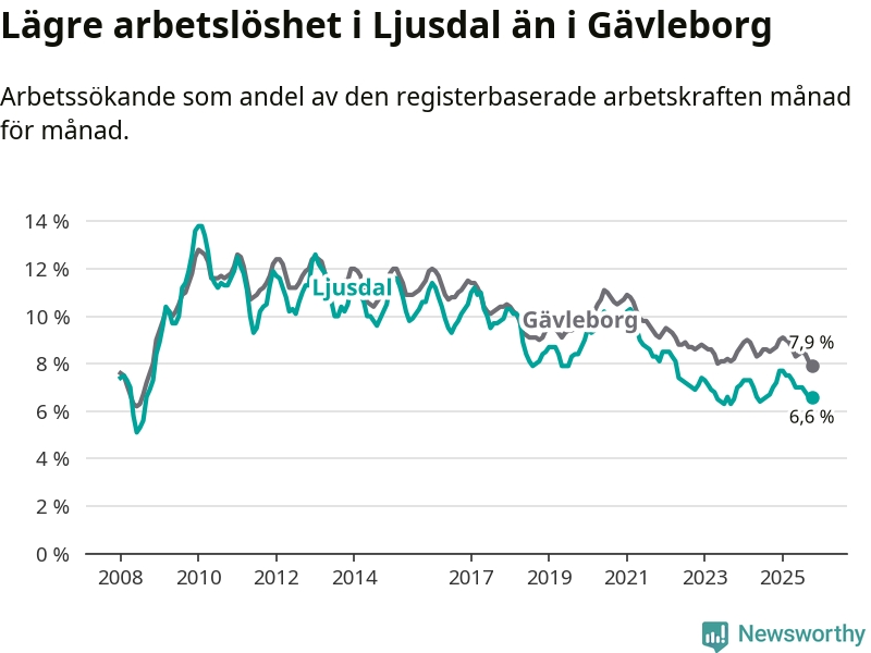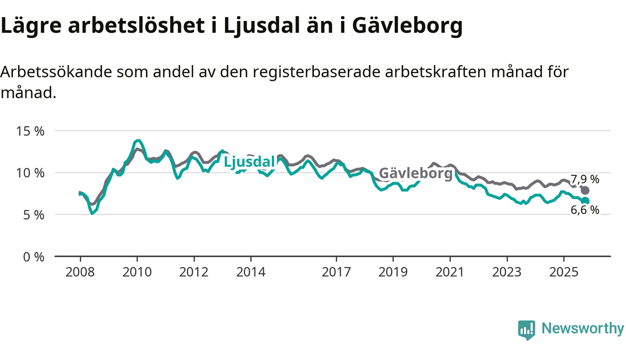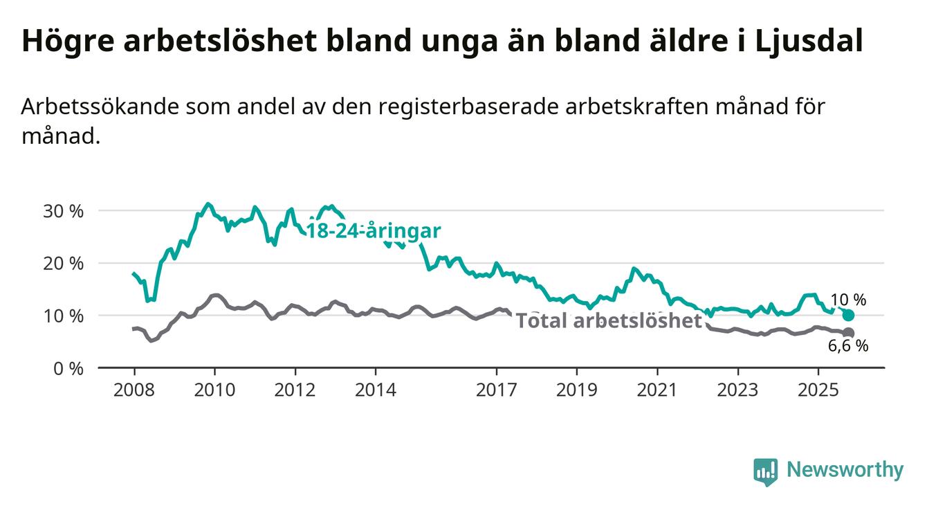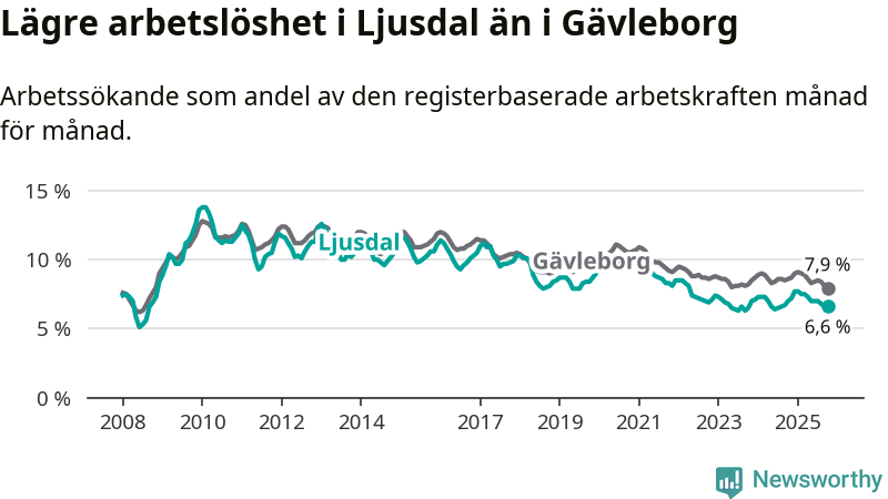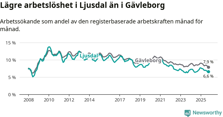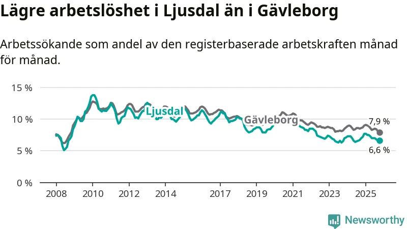 Under oktober månad rapporterade Ljusdals kommun en total arbetslöshet på 6,6 procent. Det är en minskning jämfört med samma tidpunkt i fjol (−0,4 procentenheter). Även i Gävleborgs län sjunker arbetslösheten .
