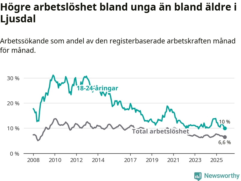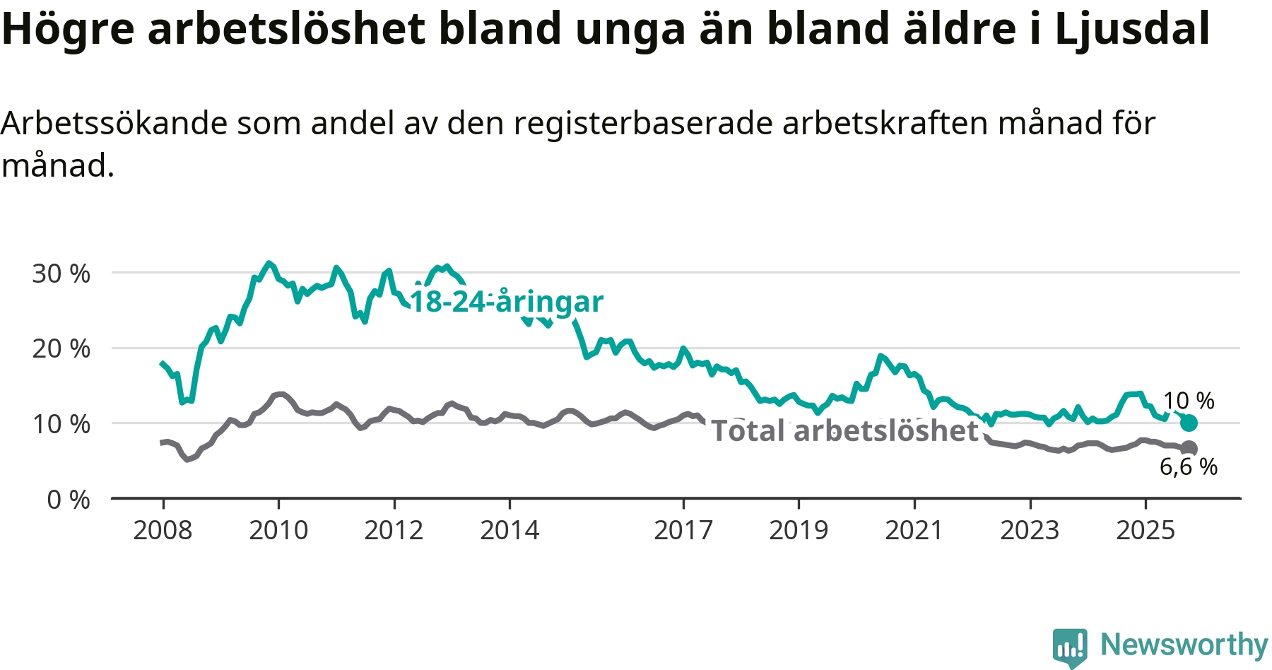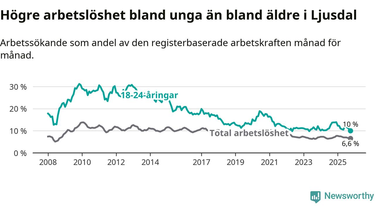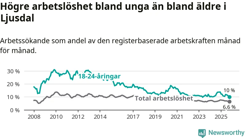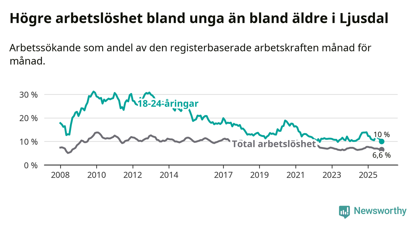 Under oktober månad rapporterade Ljusdals kommun en total arbetslöshet på 6,6 procent. Det är en minskning jämfört med samma tidpunkt i fjol (−0,4 procentenheter). Även i Gävleborgs län sjunker arbetslösheten .