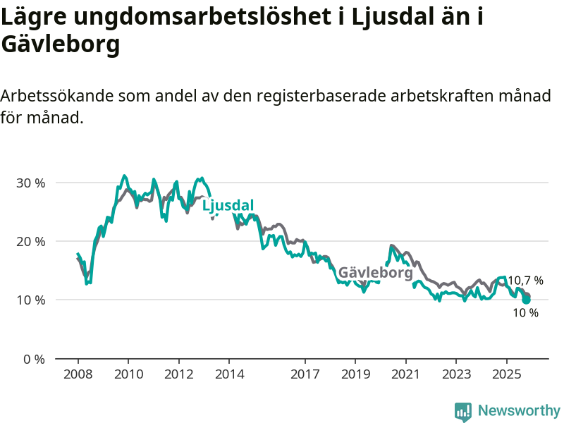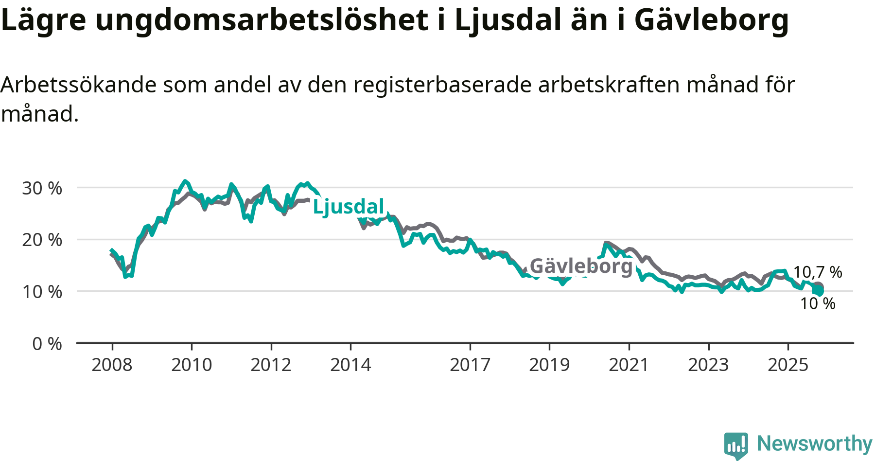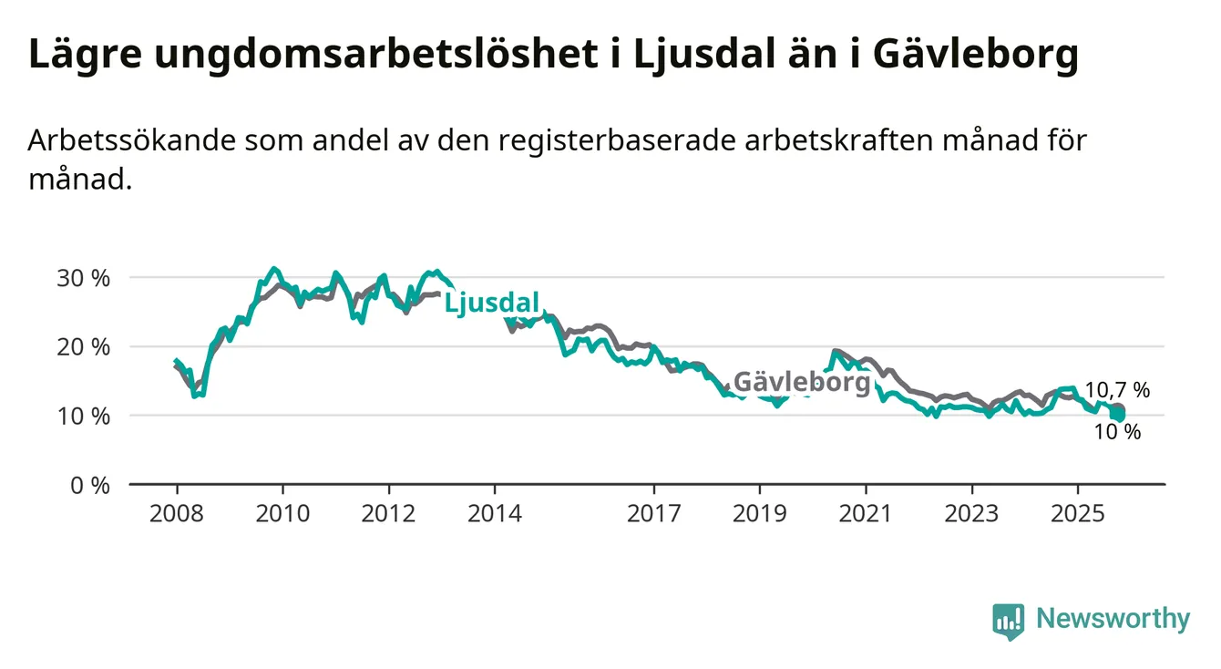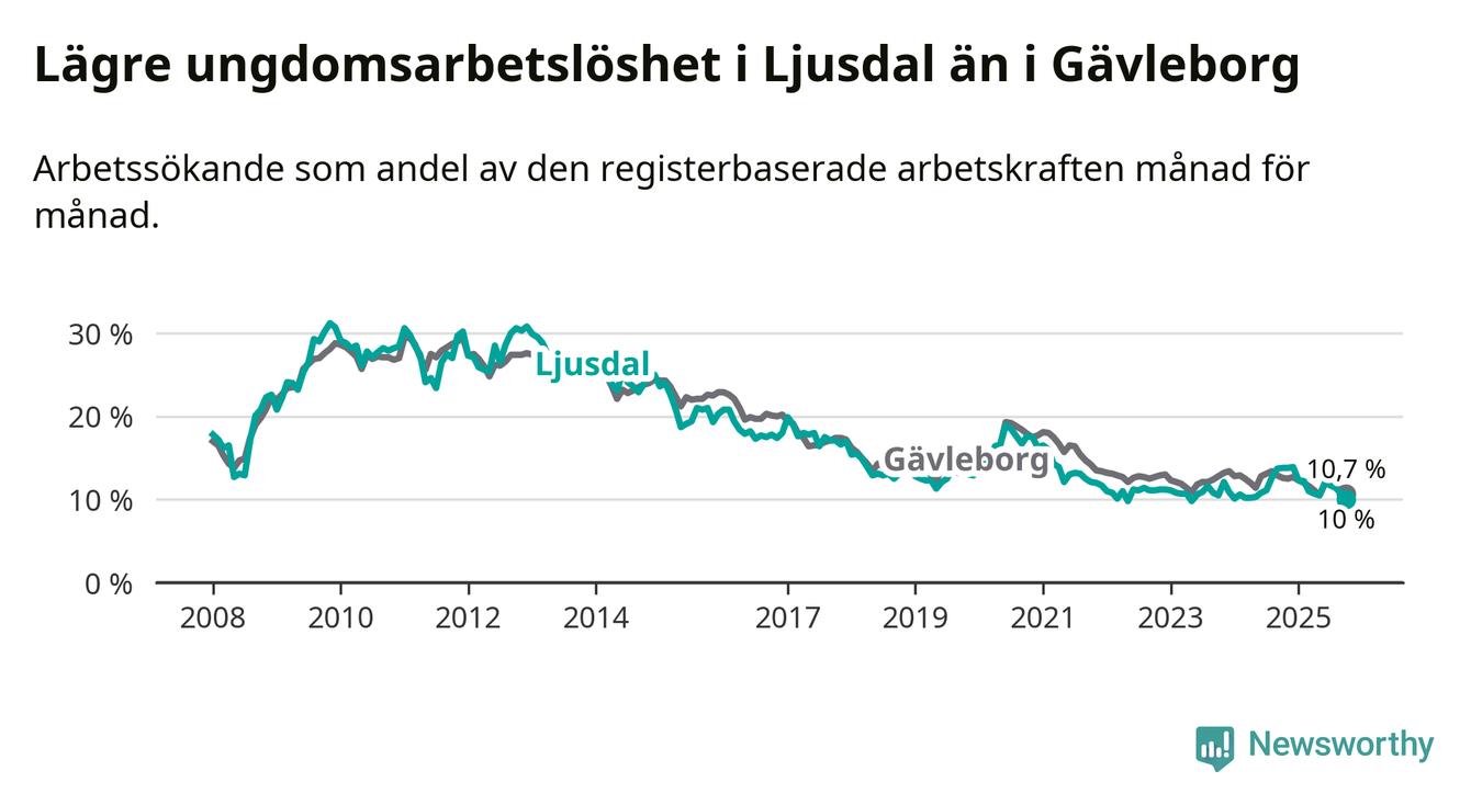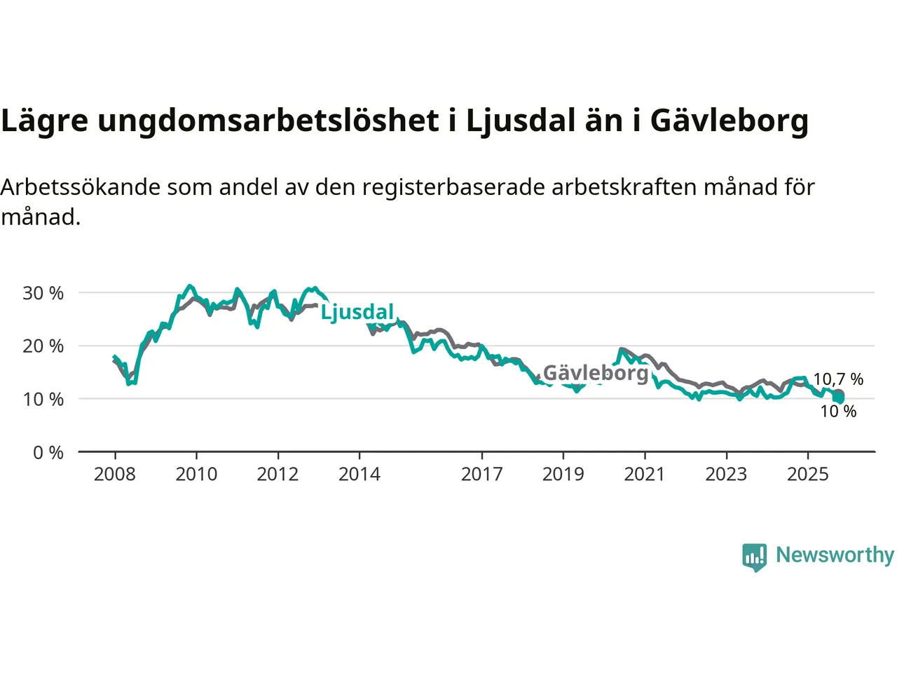 Precis som den totala arbetslösheten ligger ungdomsarbetslösheten i Ljusdal lägre än i Gävleborg som helhet. Skillnaden mellan kommunen och länet är 0,7 procentenheter.
